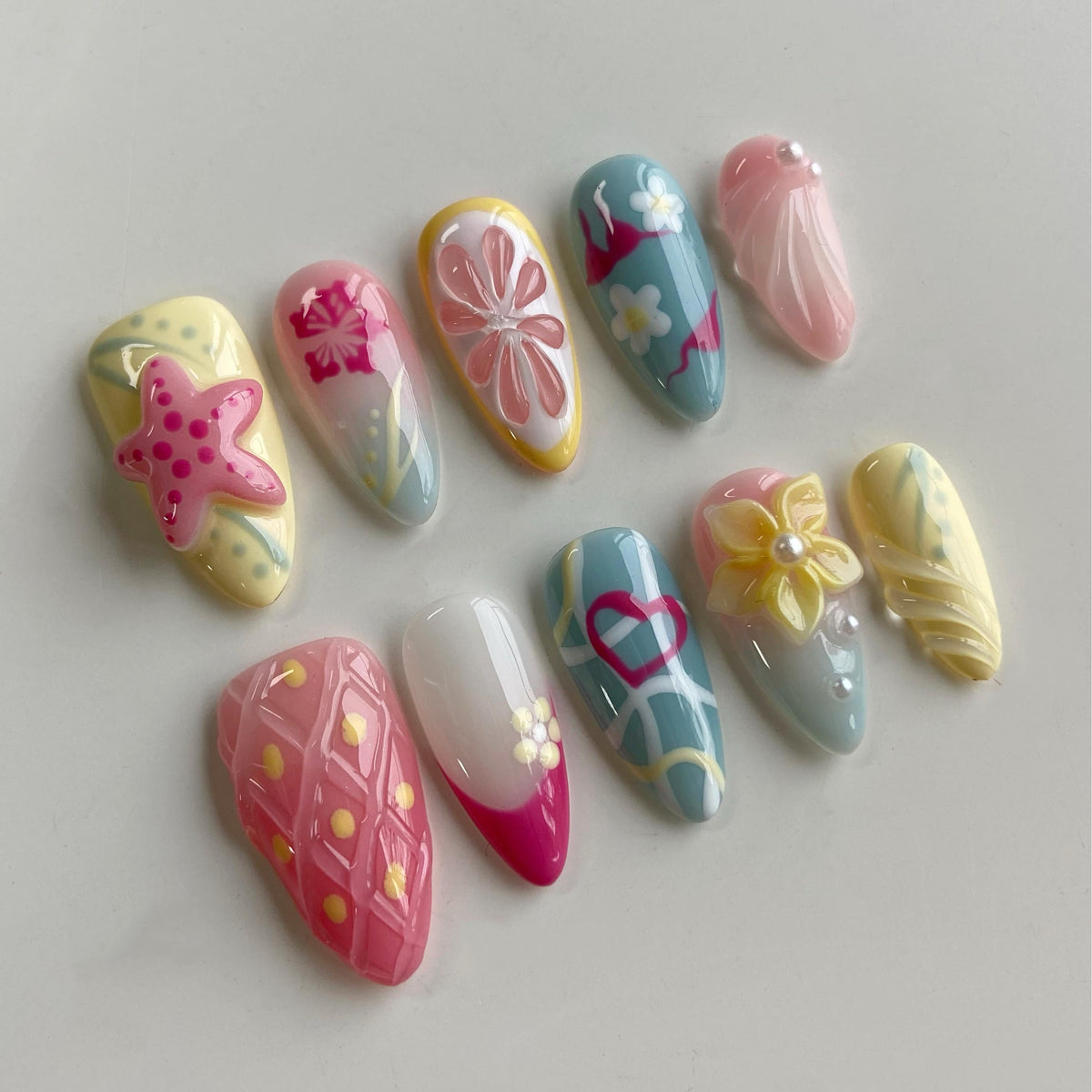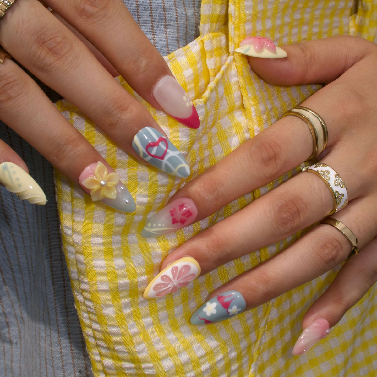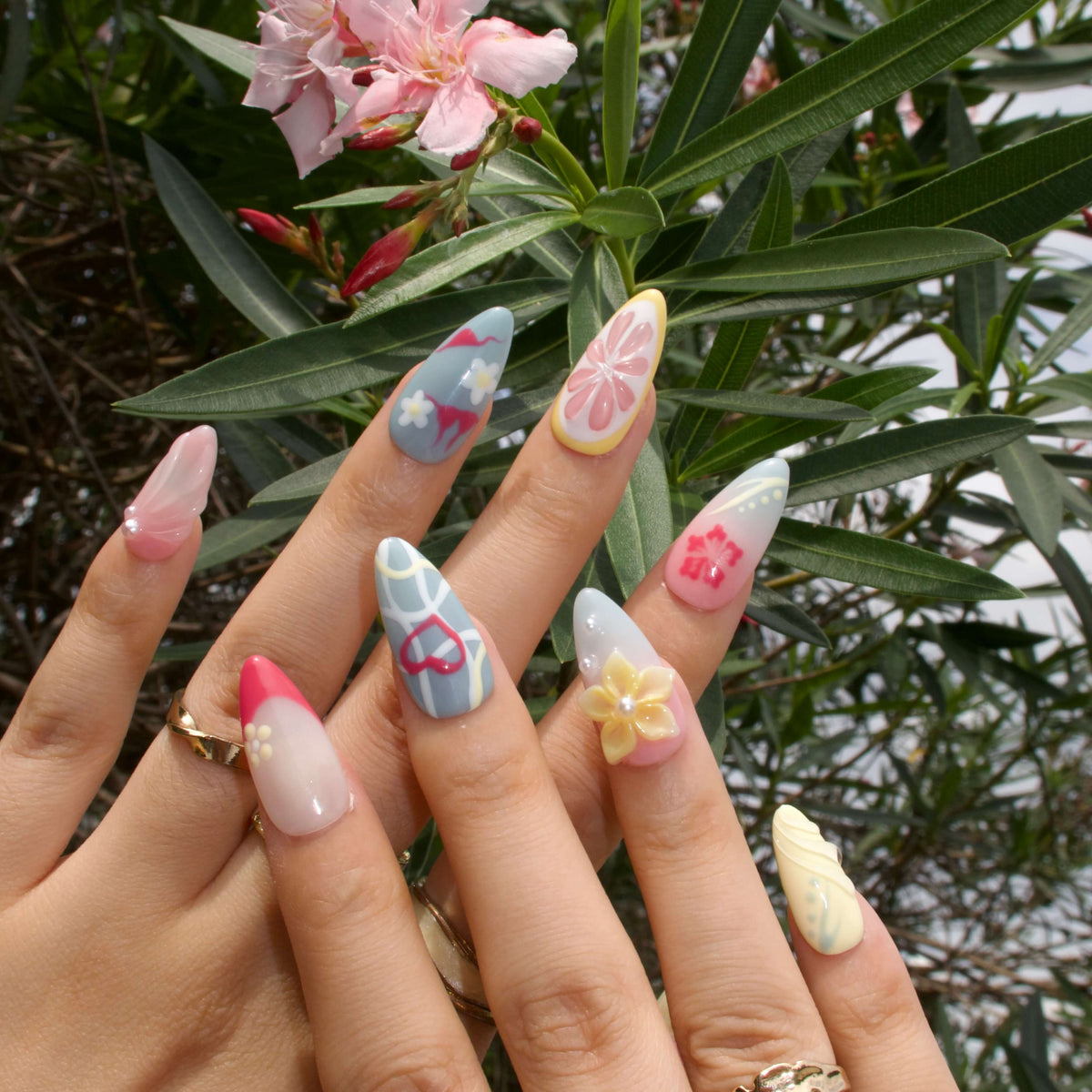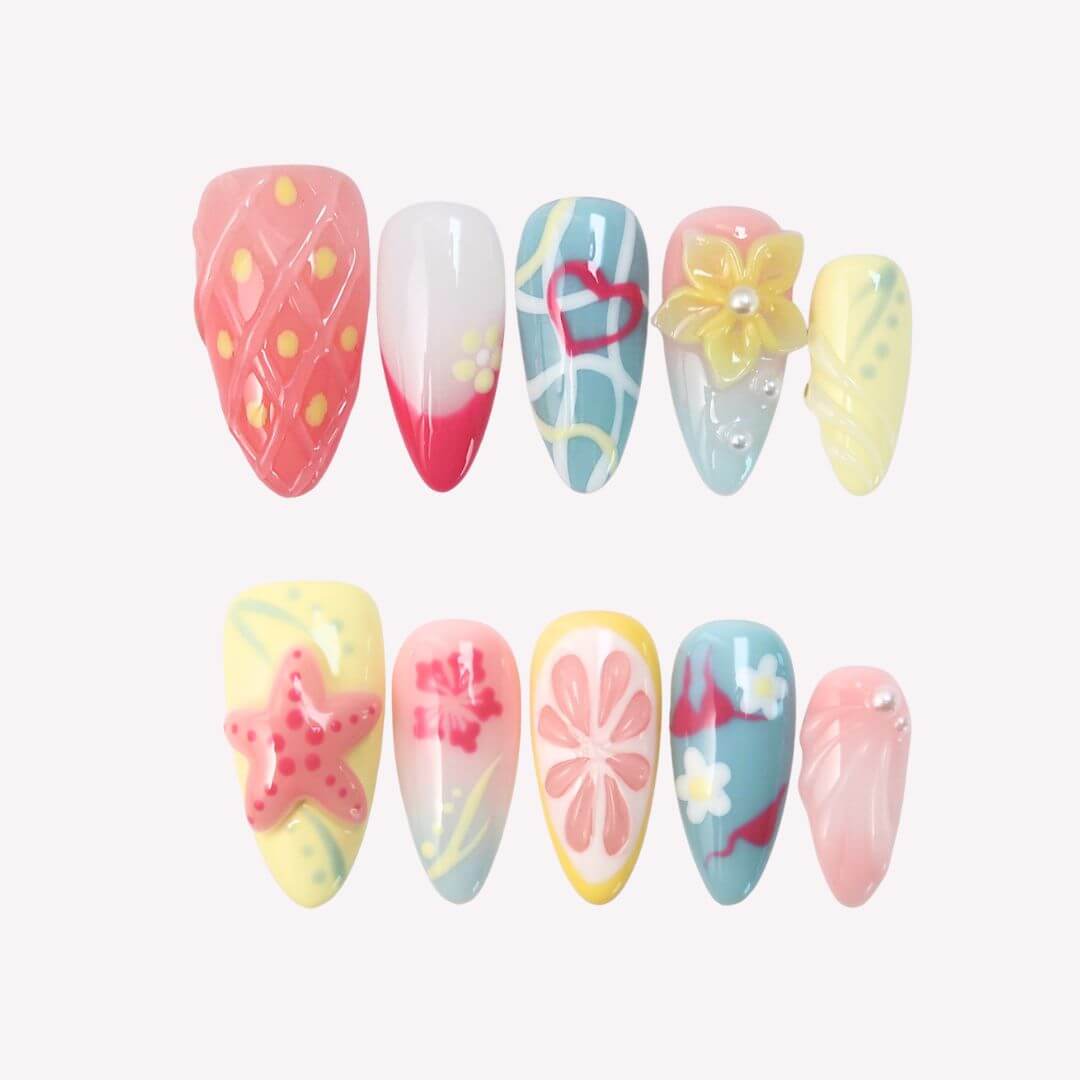 Beach It’s Time by HultyNail is your ultimate summer escape—right at your fingertips. These colorful press-on nails feature a playful mix of pink, yellow, and blue tones, adorned with fruity strawberry and grapefruit accents. 3D starfish and floral embellishments, plus a cheeky bikini design, bring beach-day vibes to life. Fun, fresh, and full of sunshine—this set is made for summer lovers.
