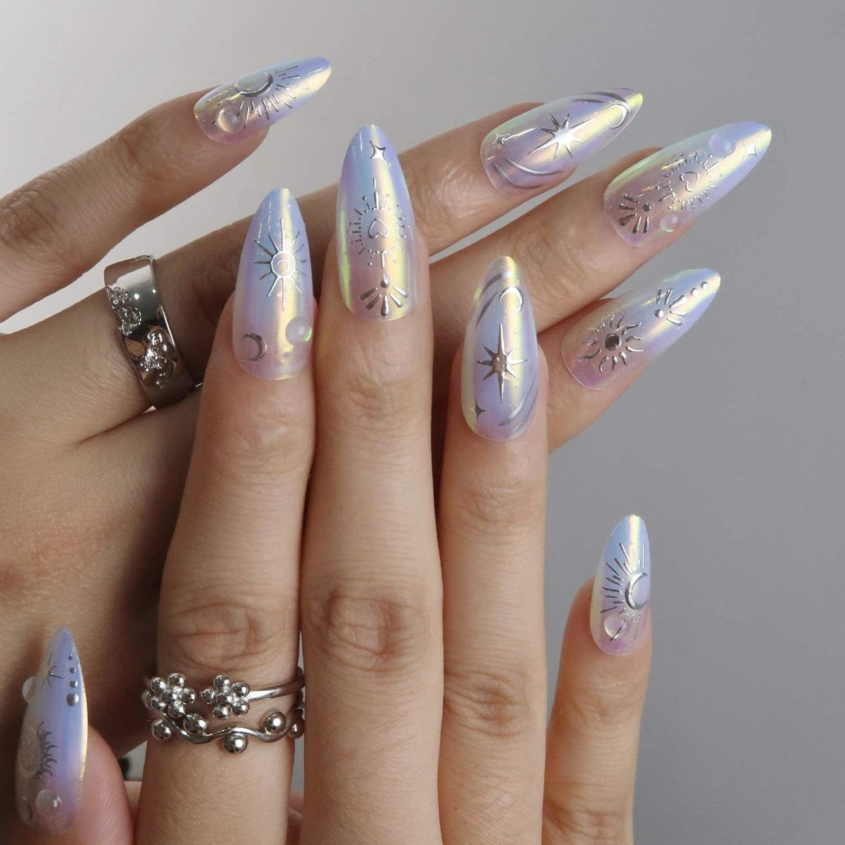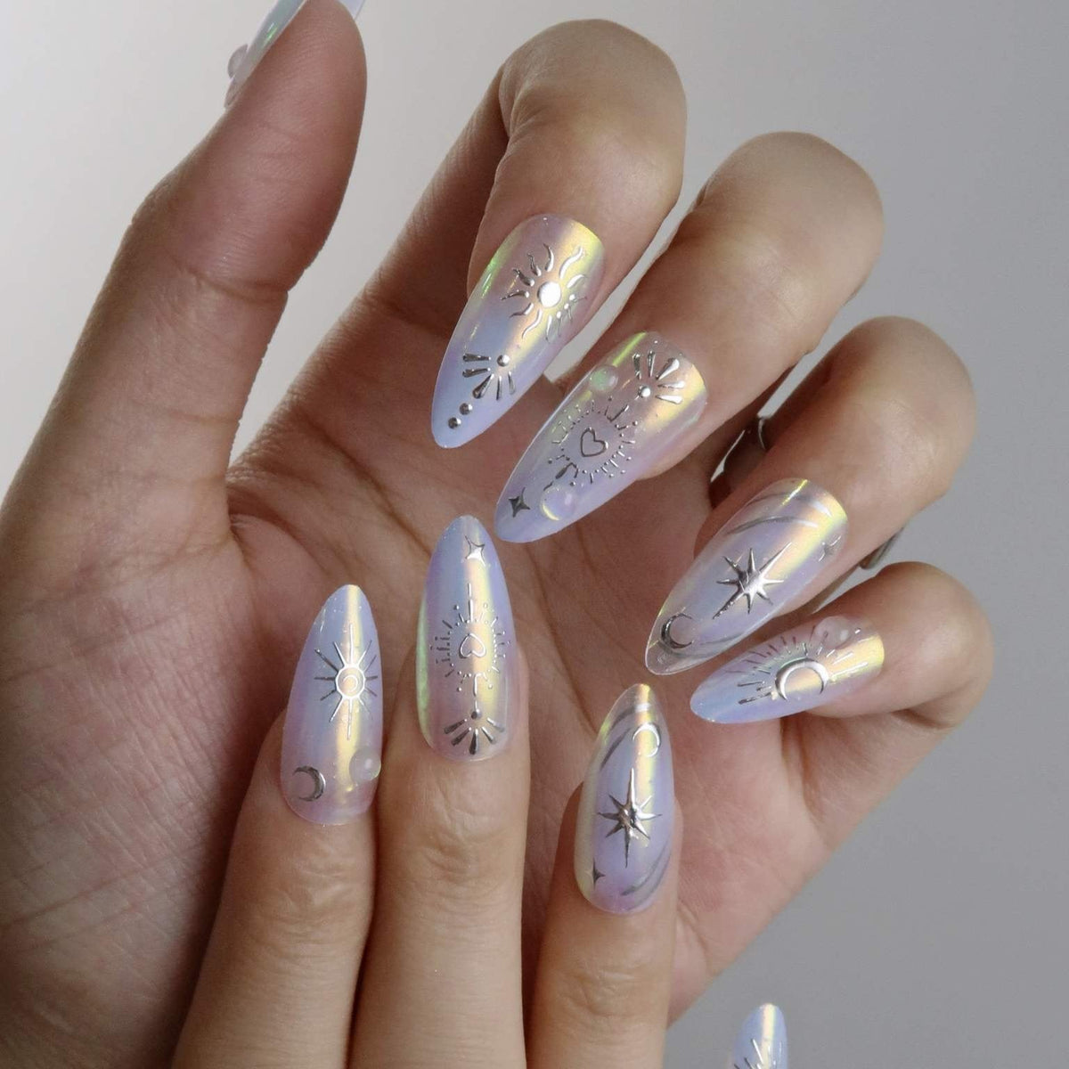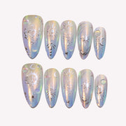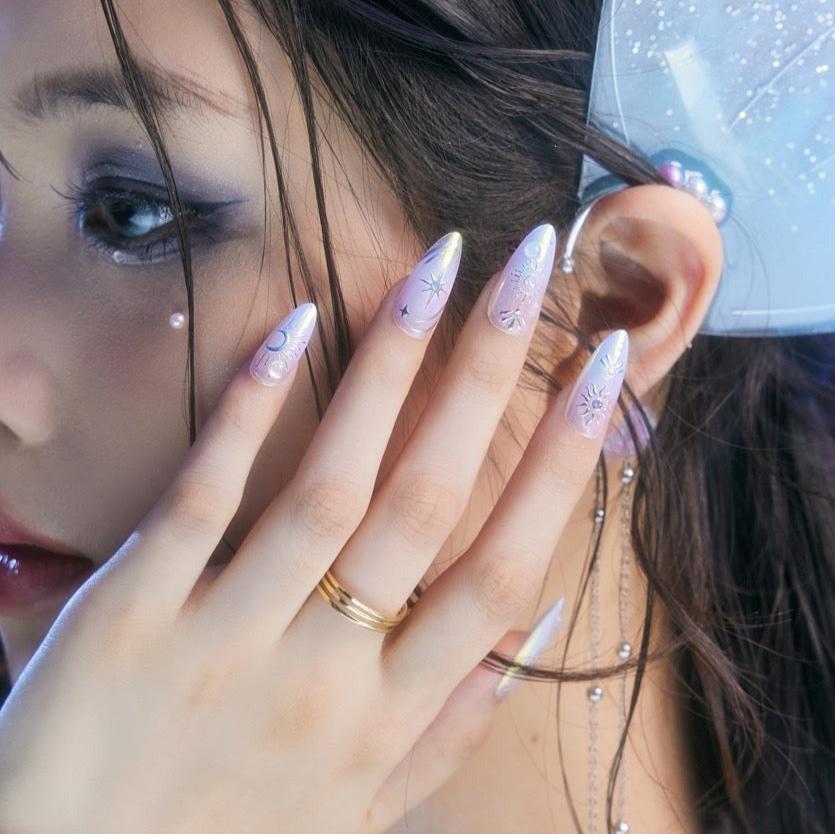 Announcing the arrival of Beyond the Celestial by Ersa Nails, where the heavens converge with modern elegance in a celestial symphony of style. These nails feature a stunning holographic base that shimmers like the night sky, adorned with silver hearts, suns, moons, and stars. Tiny 3D bead embellishments add an extra touch of celestial charm. Beyond the Celestial transforms your nails into a breathtaking astral masterpiece, perfect for those who wish to carry a piece of the universe with them.