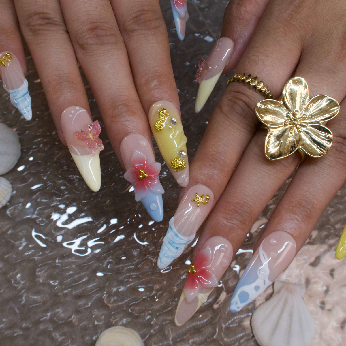 Bloomwave by Swara Nails transports you to a whimsical coastal escape. On a soft, peachy - pink base, delicate 3D flowers in blush pink bloom alongside tiny gold seahorses and starfish. Subtle gradients of sky blue and sunny yellow, plus dainty butterfly accents, mimic the carefree charm of a beachside stroll. Perfect for infusing festival looks or summer days with a touch of breezy, floral - filled seaside magic.