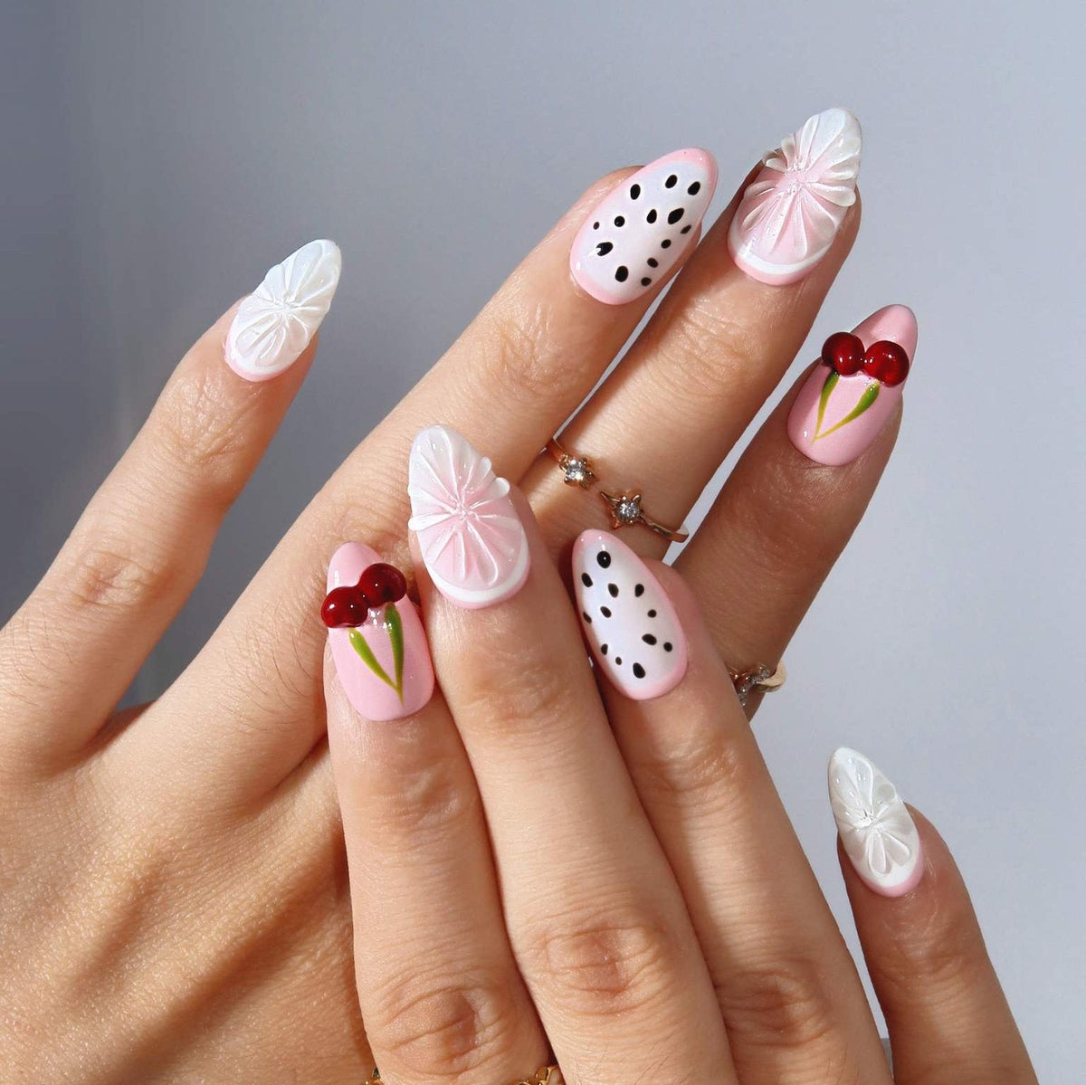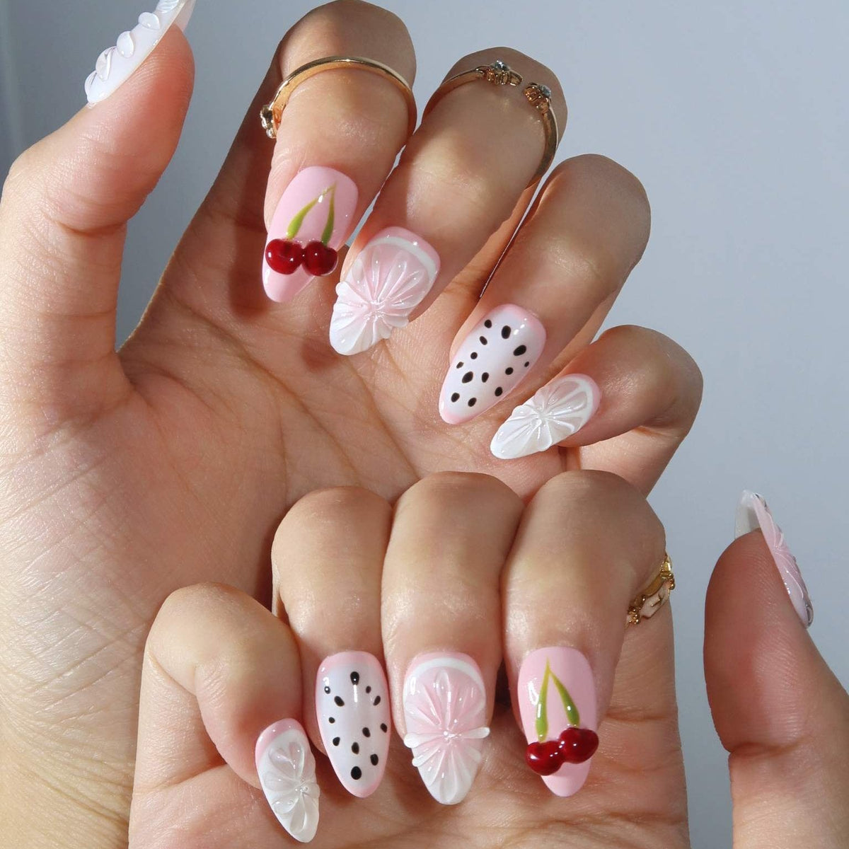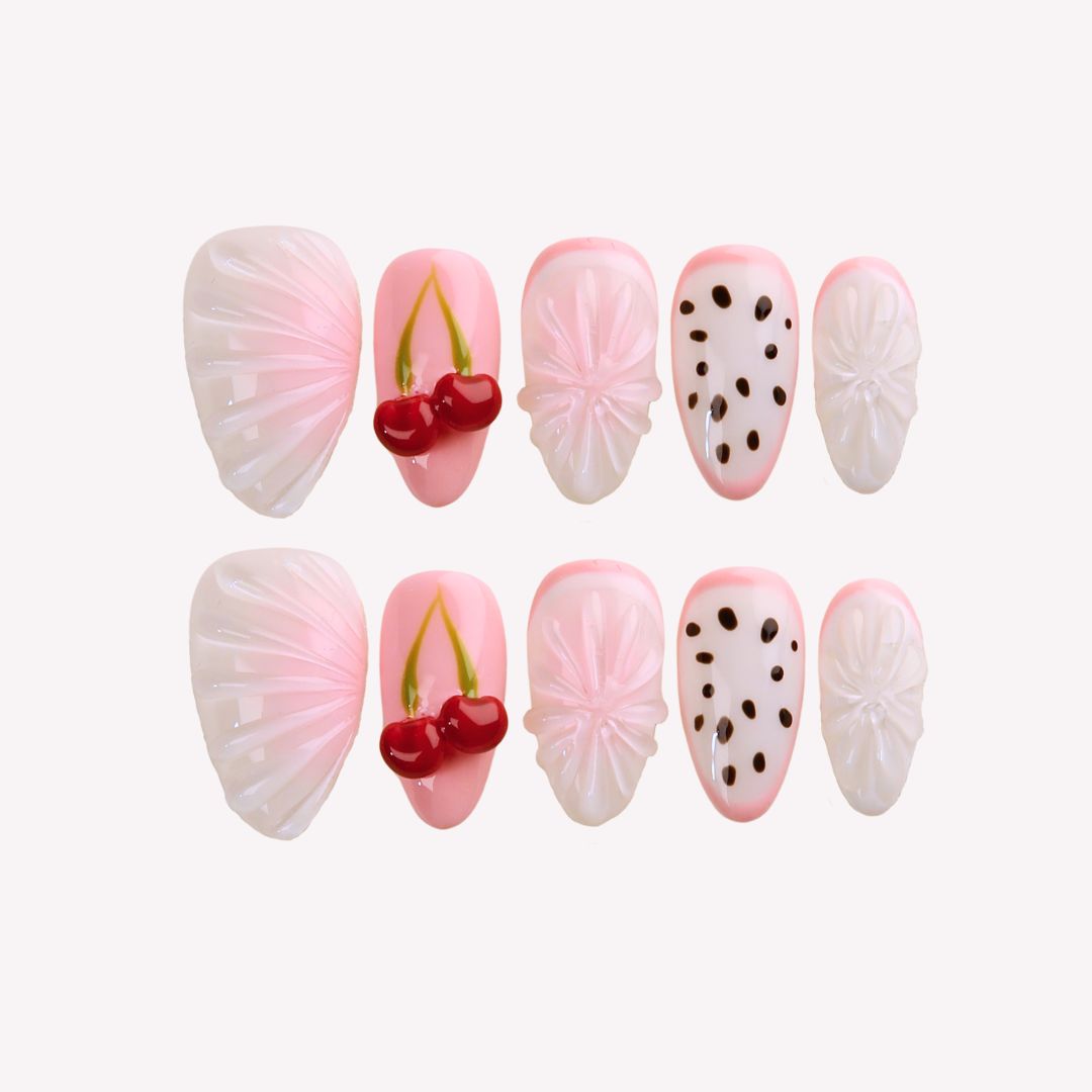 Indulge in a sweet and playful look with Cherry Smoothie Press-on Nails by HultyNail. This delightful design features charming cherry accents, capturing the fresh and fun essence of fruit elements. The nails are adorned with a 3D mermaid design, adding a touch of whimsical fantasy. The soft pink and white color palette creates a refreshing and vibrant aesthetic, perfect for any occasion. Whether you're sipping on your favorite summer drink or enjoying a day out, Cherry Smoothie brings a cheerful and stylish vibe to your fingertips.