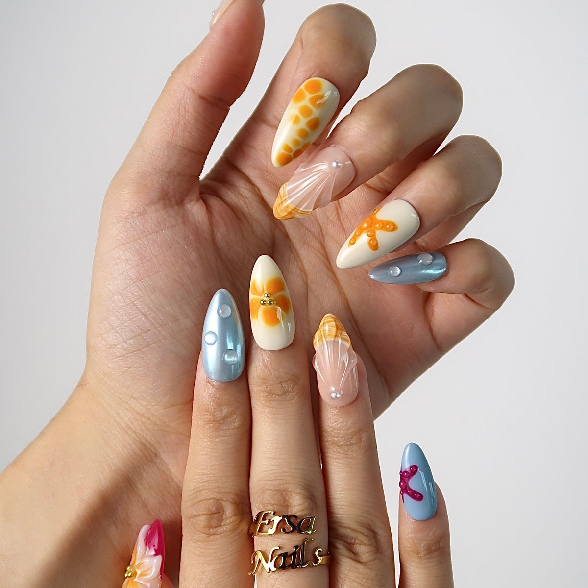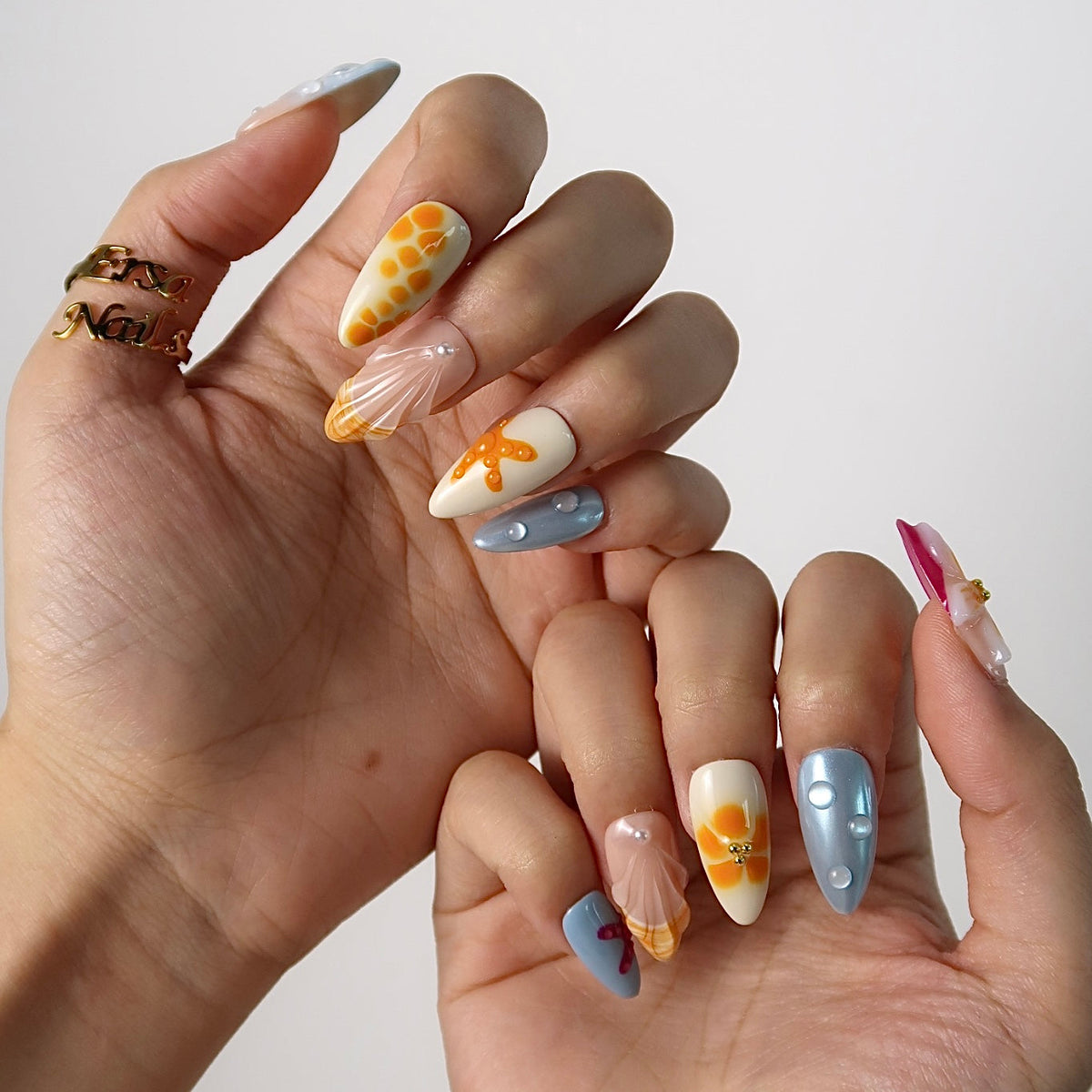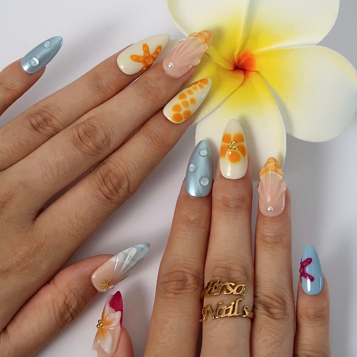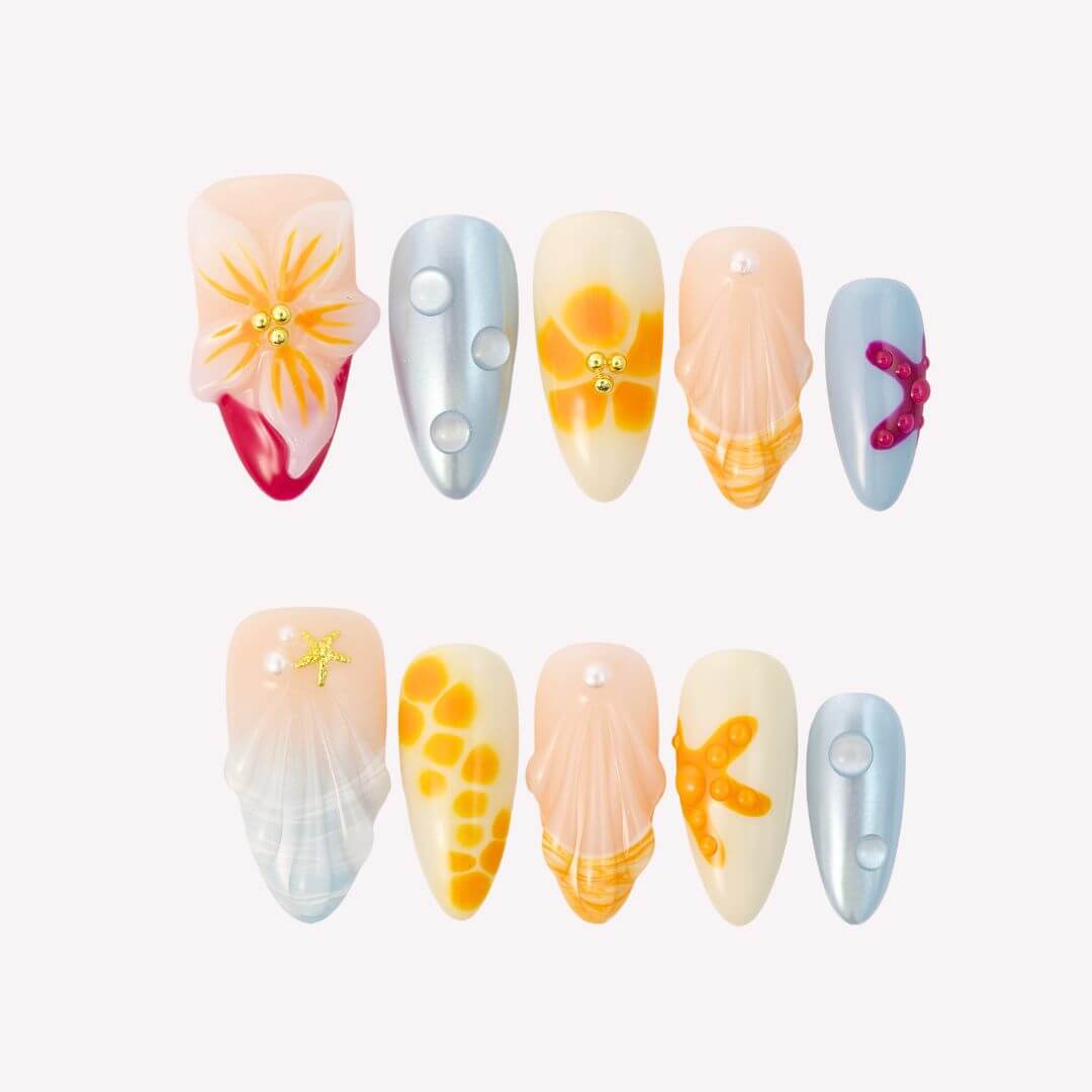 Escape to a seaside dream with Coastal Paradise from HultyNail. These press-on nails feature a nude base blended with ocean blue and sunset orange in a soft ombré design. Embellished with 3D florals, water droplets, starfish accents, mermaid-inspired details, gold starfish charms, and pearls — it’s a coastal getaway at your fingertips.