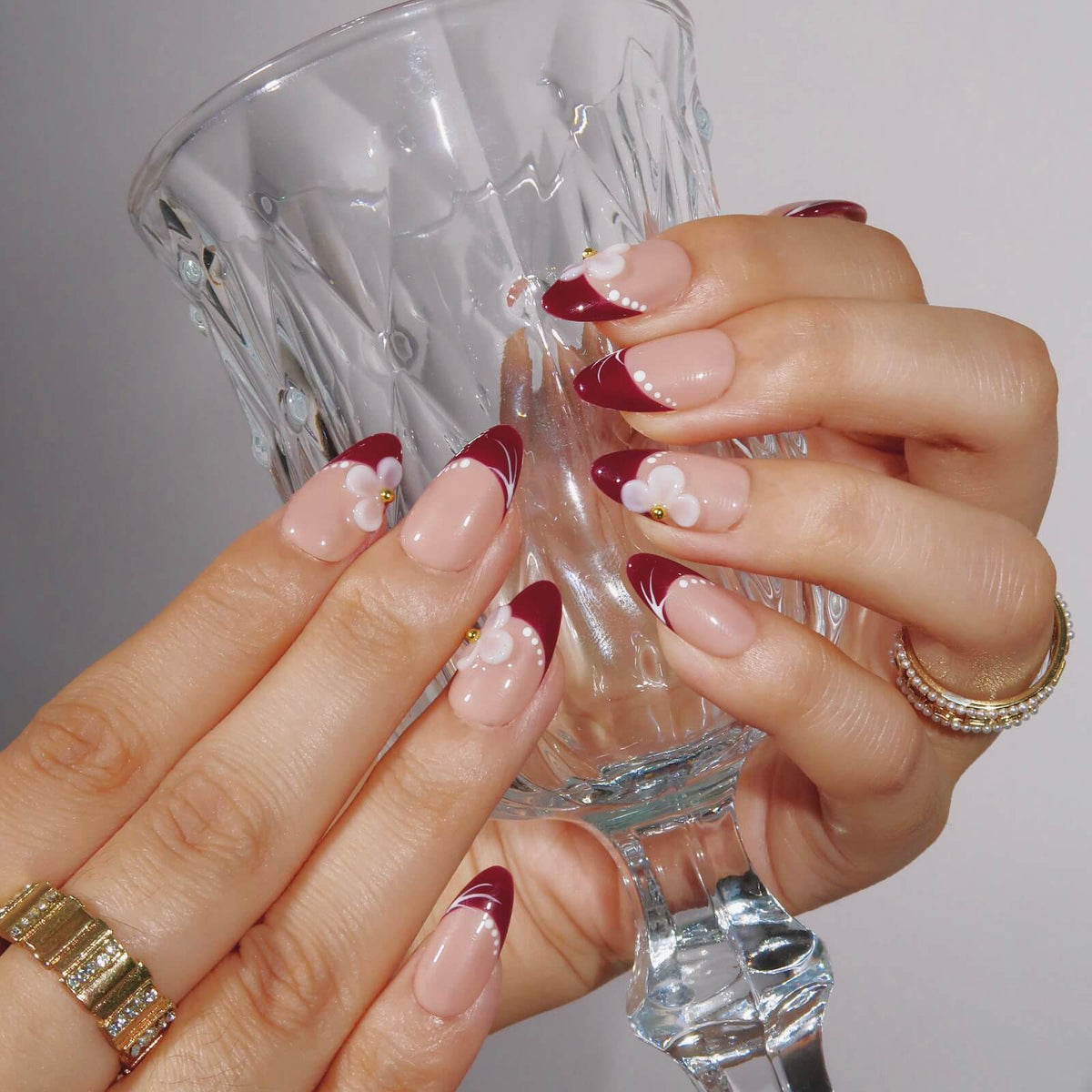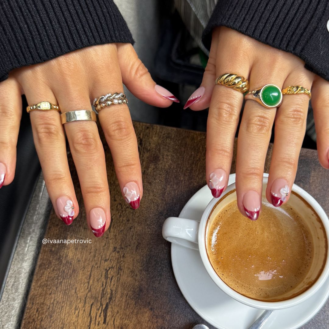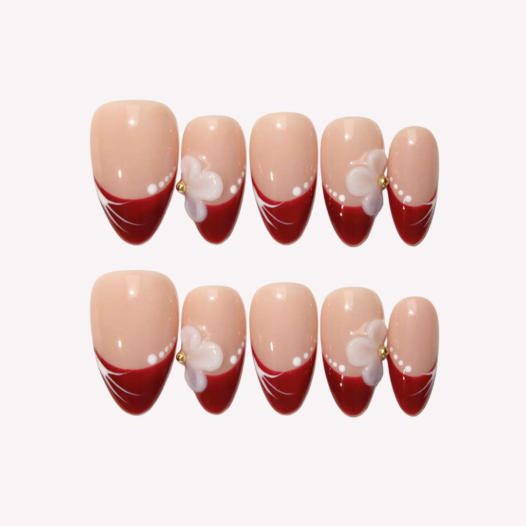 A timeless blend of elegance and boldness, Crimson Elegance features a nude base paired with striking red French tips. Delicate 3D white flowers add a romantic touch, while white lines and dots create a refined, intricate finish. This graceful design effortlessly elevates your style for any occasion.