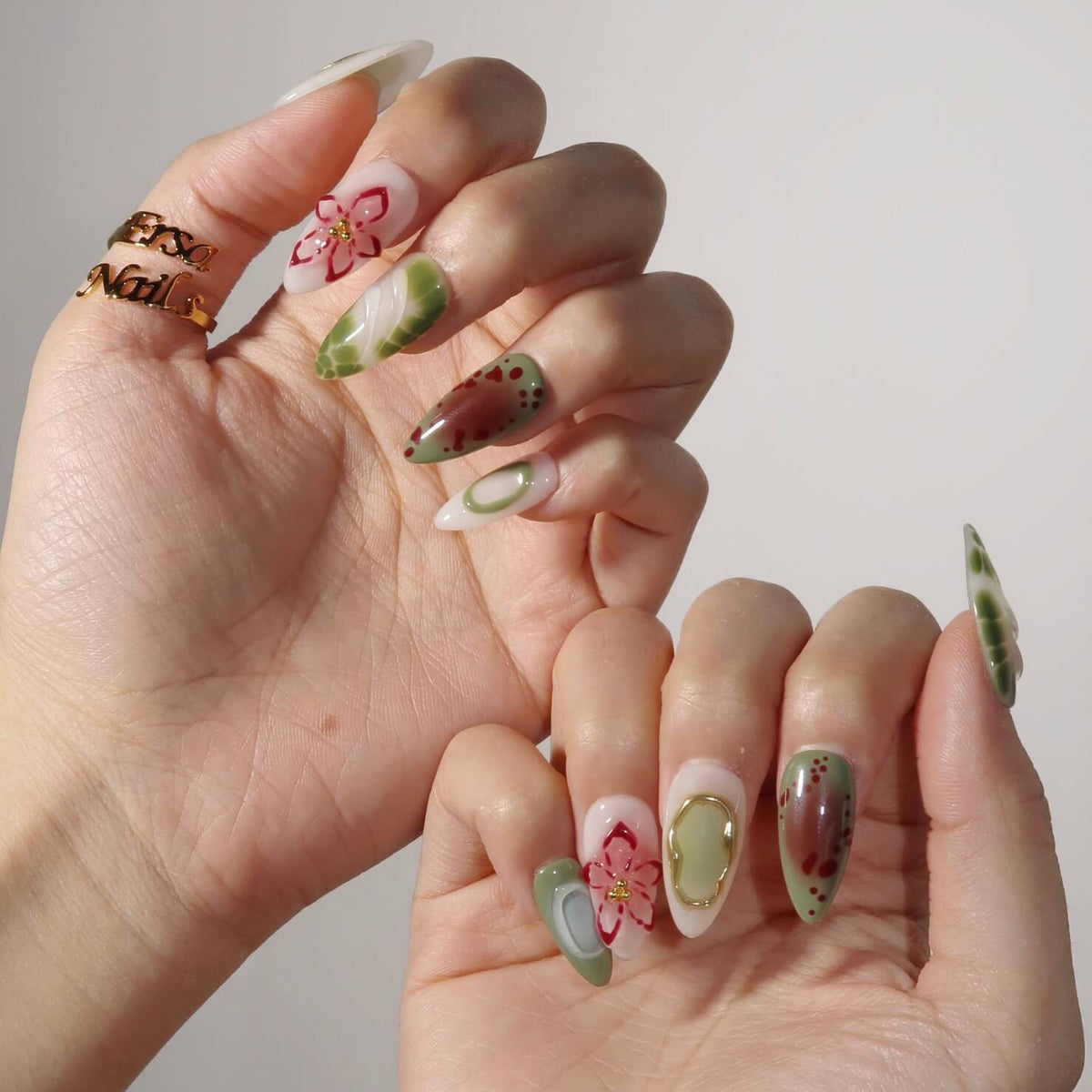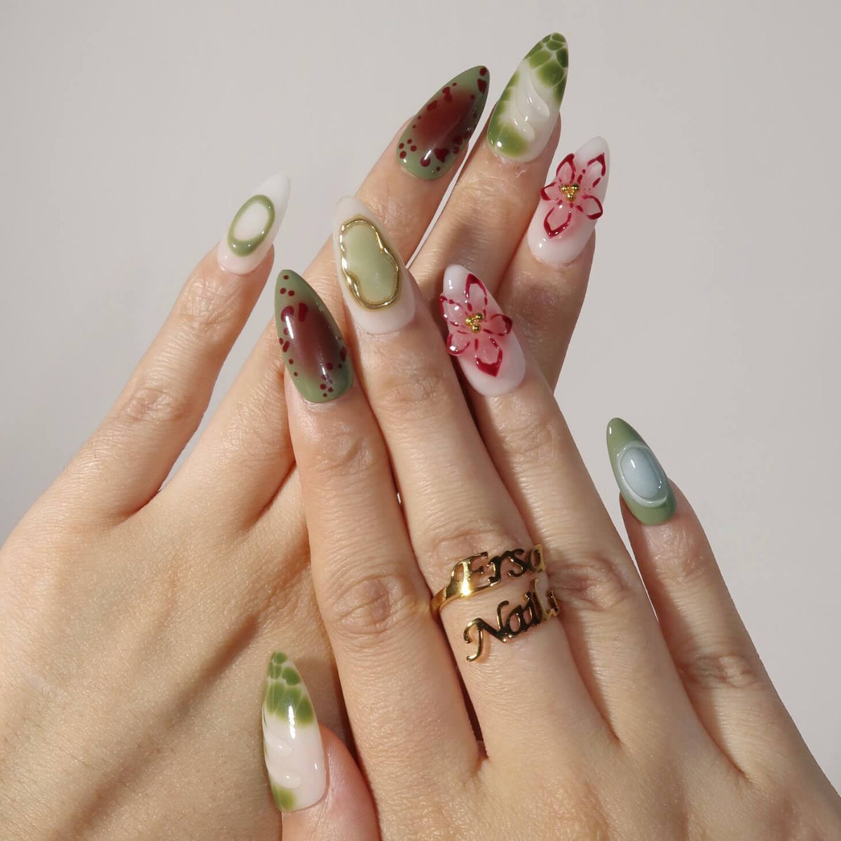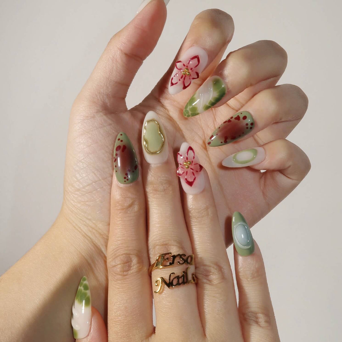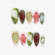 Embrace the earthy beauty of the Deep Woods press-on nails from swara Nails. Featuring a creamy white base with deep green and brown ombre designs, these nails evoke the tranquility of a forest. The 3D floral accents add a delicate touch, while golden elements bring a hint of elegance. Perfect for those who love nature-inspired styles, Deep Woods offers a chic, organic look that's as refreshing as a walk through the woods.