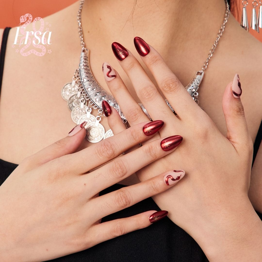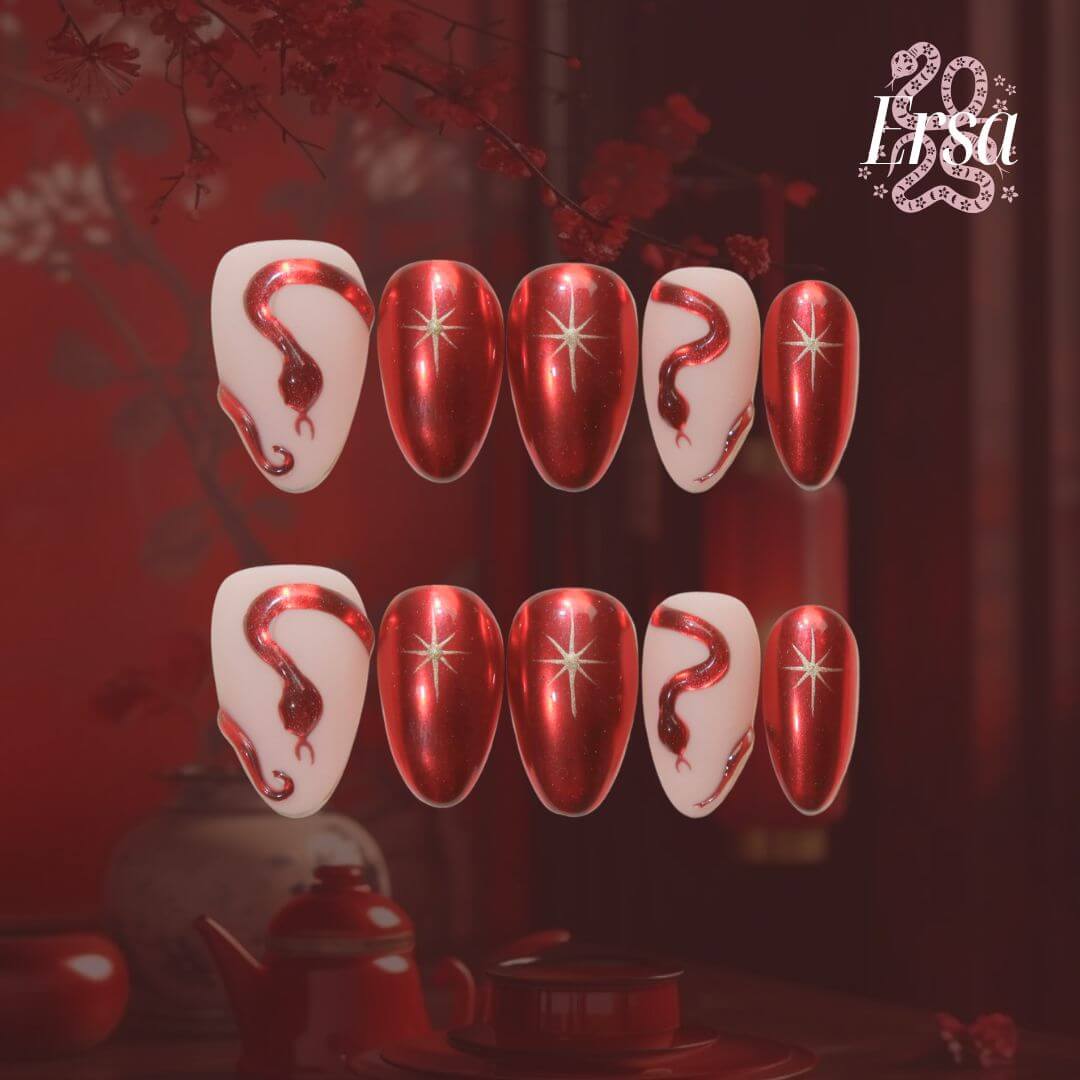 Unleash the power of Ruby Venom, a striking design that fuses bold red hues with a captivating metallic sheen. Inspired by the mystique of serpents, this set features intricate snake motifs that wind gracefully across each nail, symbolizing transformation and strength. The design is further enhanced with golden star accents, adding a touch of celestial magic to the fiery red base. Part of our Snake Year Collection, Ruby Venom embodies both danger and allure, making it the perfect choice for those who dare to stand out with a fierce and empowering look.