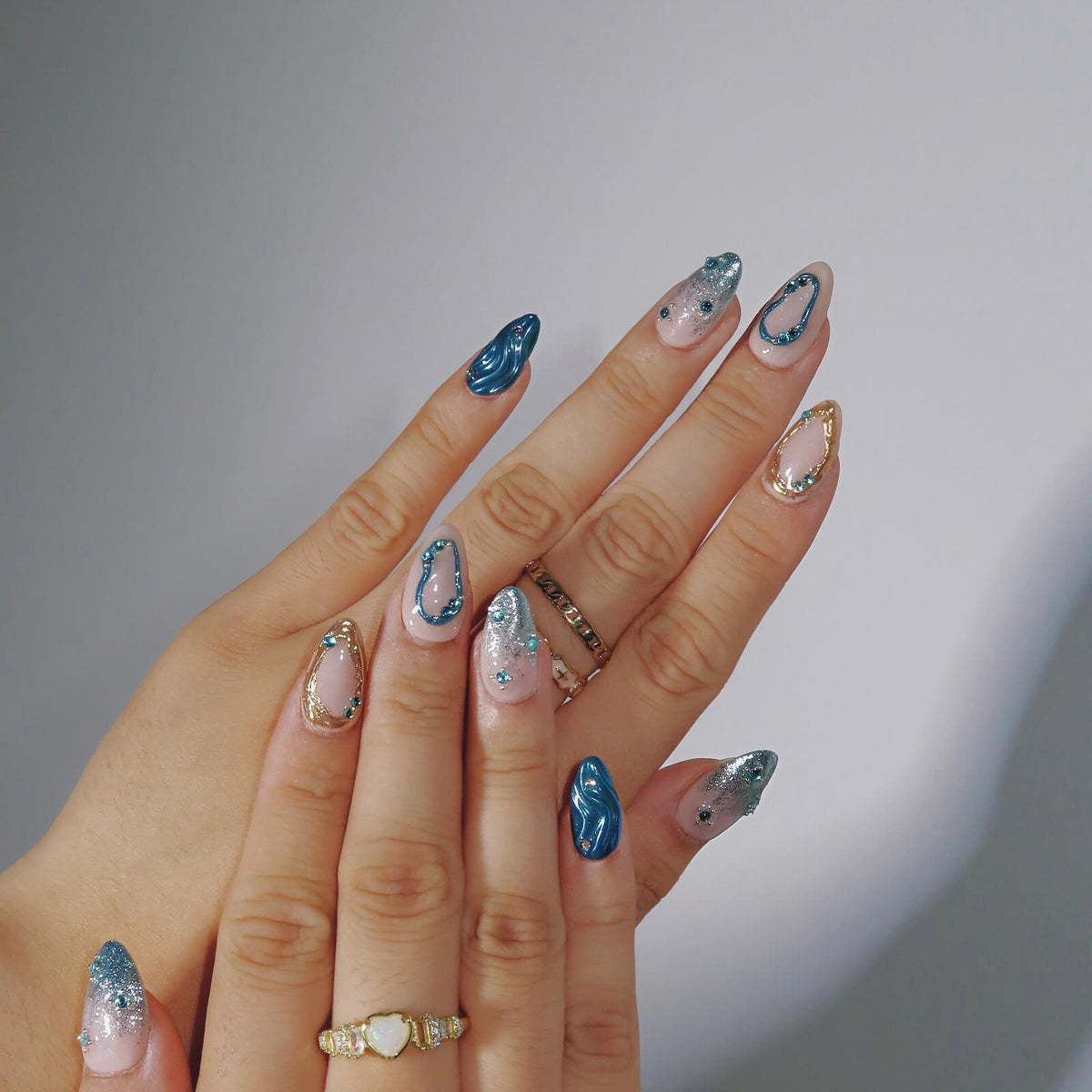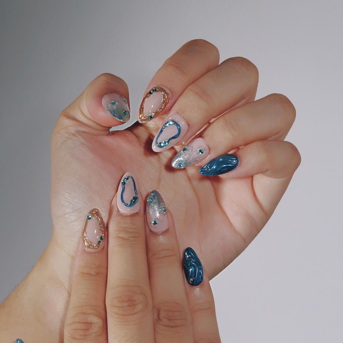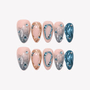 Unlock the beauty of elegance with Sapphire from HultyNail. This stunning set features a nude base with bold blue accents, blending seamlessly into tips adorned with a mesmerizing blue glitter gradient. Golden lines and metallic blue detailing add a touch of luxury, while blue rhinestones further elevate the design with their sparkling allure. Sapphire is the perfect choice for those who want a chic and sophisticated look with a pop of dazzling color.