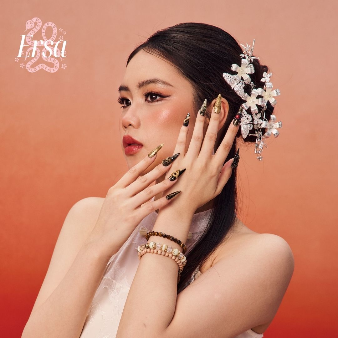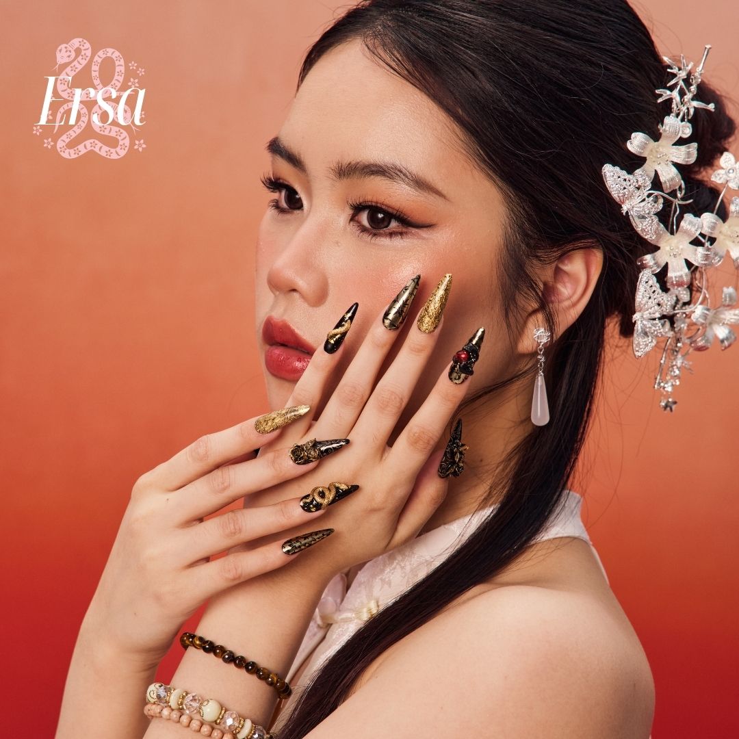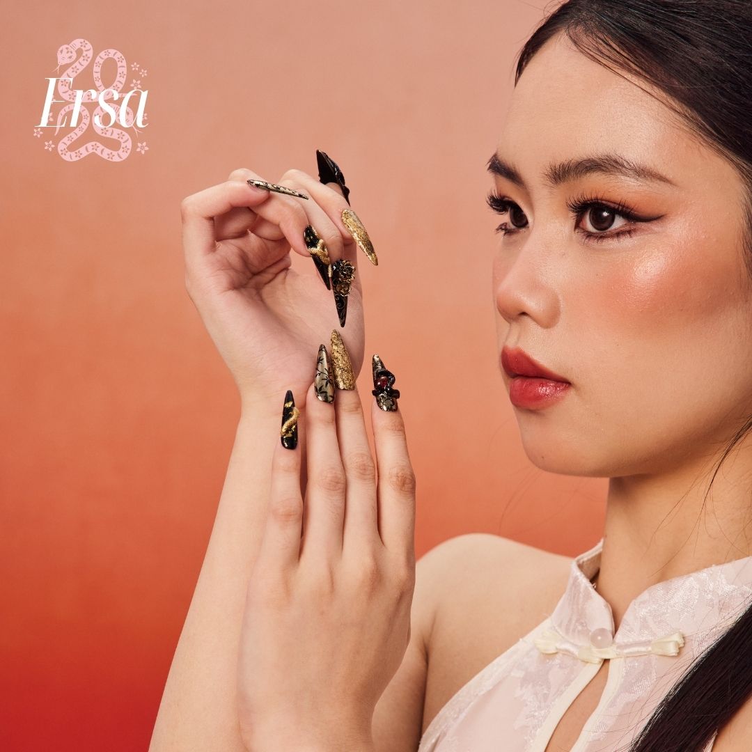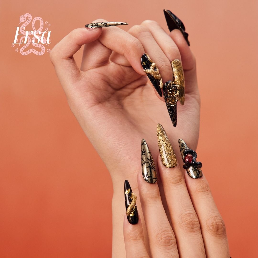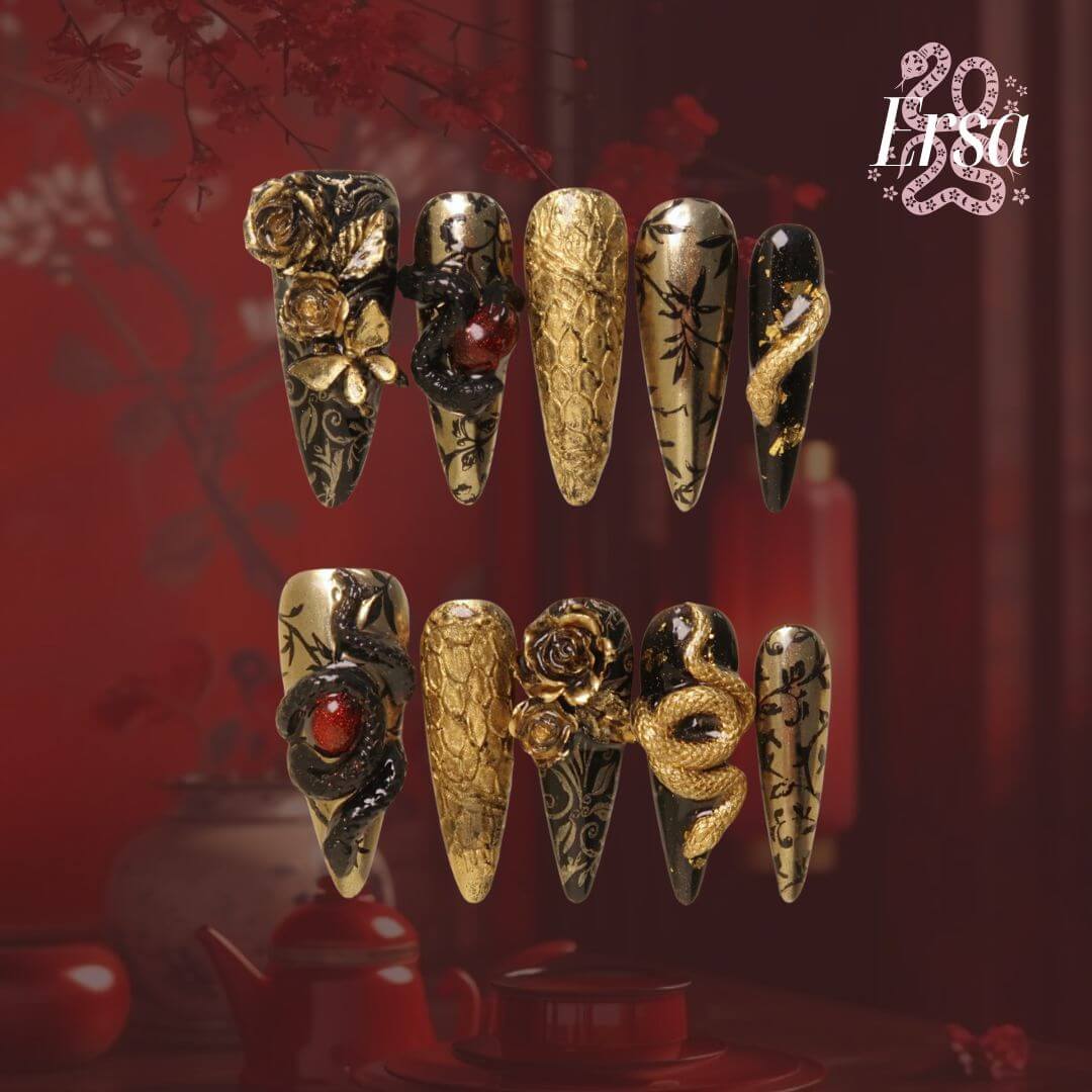 Indulge in the opulence of Silent Majesty, a stunning design inspired by the allure of the Snake Year. The nails feature a striking black and gold color palette, with intricate snake scale patterns as the base, exuding an air of mystery and strength. A bold, three-dimensional snake ornament graces the design, symbolizing power and elegance. Gold 3D rose embellishments add a luxurious, vintage touch, completing the regal aesthetic. With its combination of deep black, radiant gold, and sculptural details, Silent Majesty offers an exquisite blend of timeless beauty and fierce sophistication.