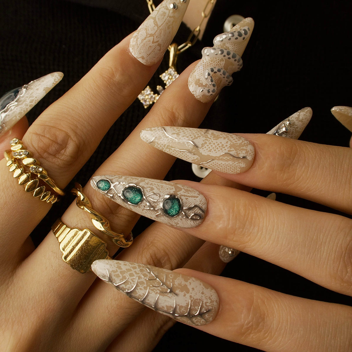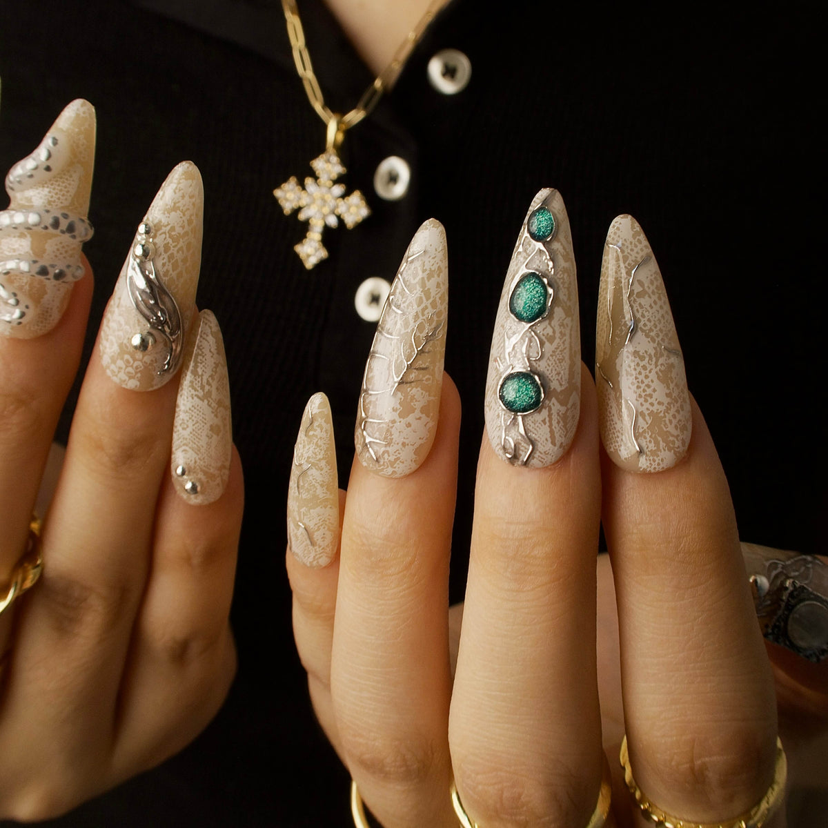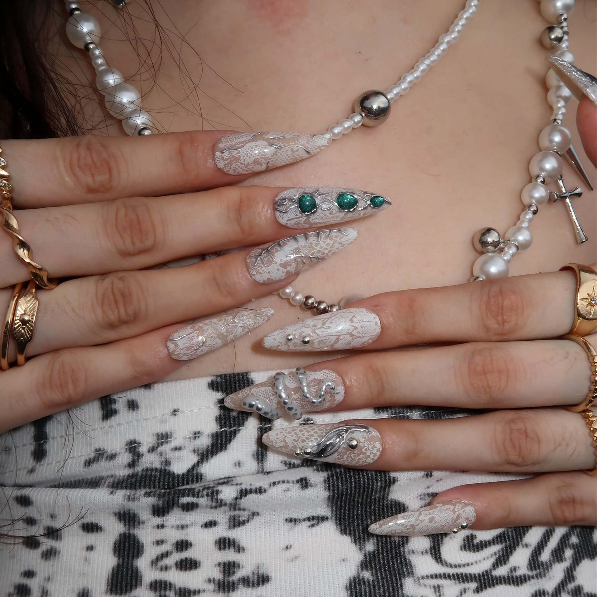 Silver Venom by swaraNails is a striking press-on nails set made for bold festival moments. Featuring a nude base adorned with white lace patterns, shimmering silver lines, and hypnotic green cat eye accents, this set is finished with a statement 3D snake embellishment that commands attention. A daring blend of elegance and edge—perfect for the music festival crowd.