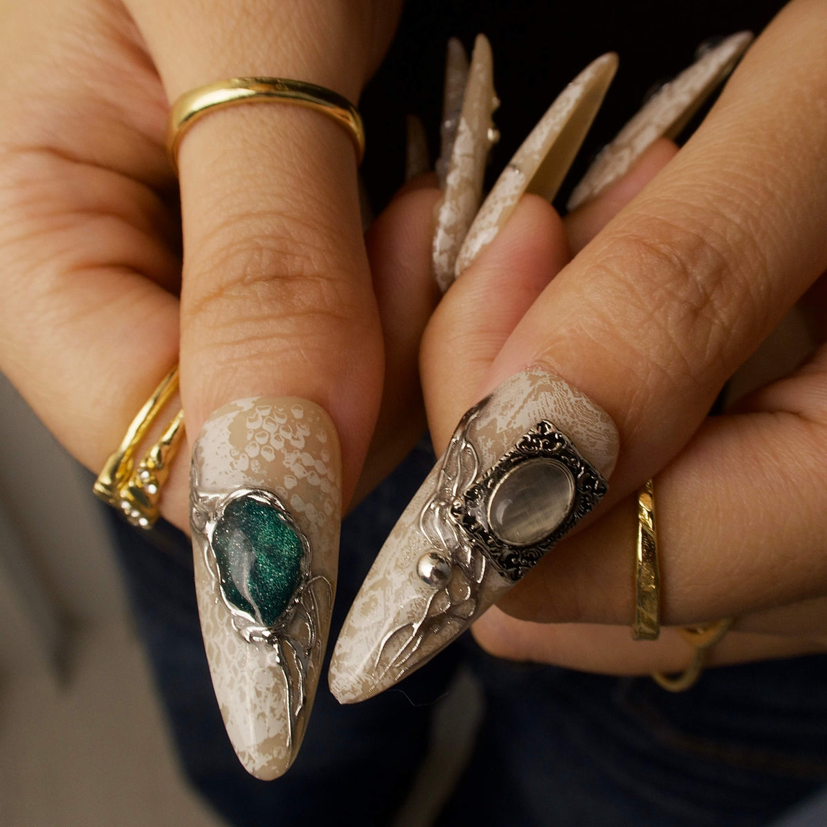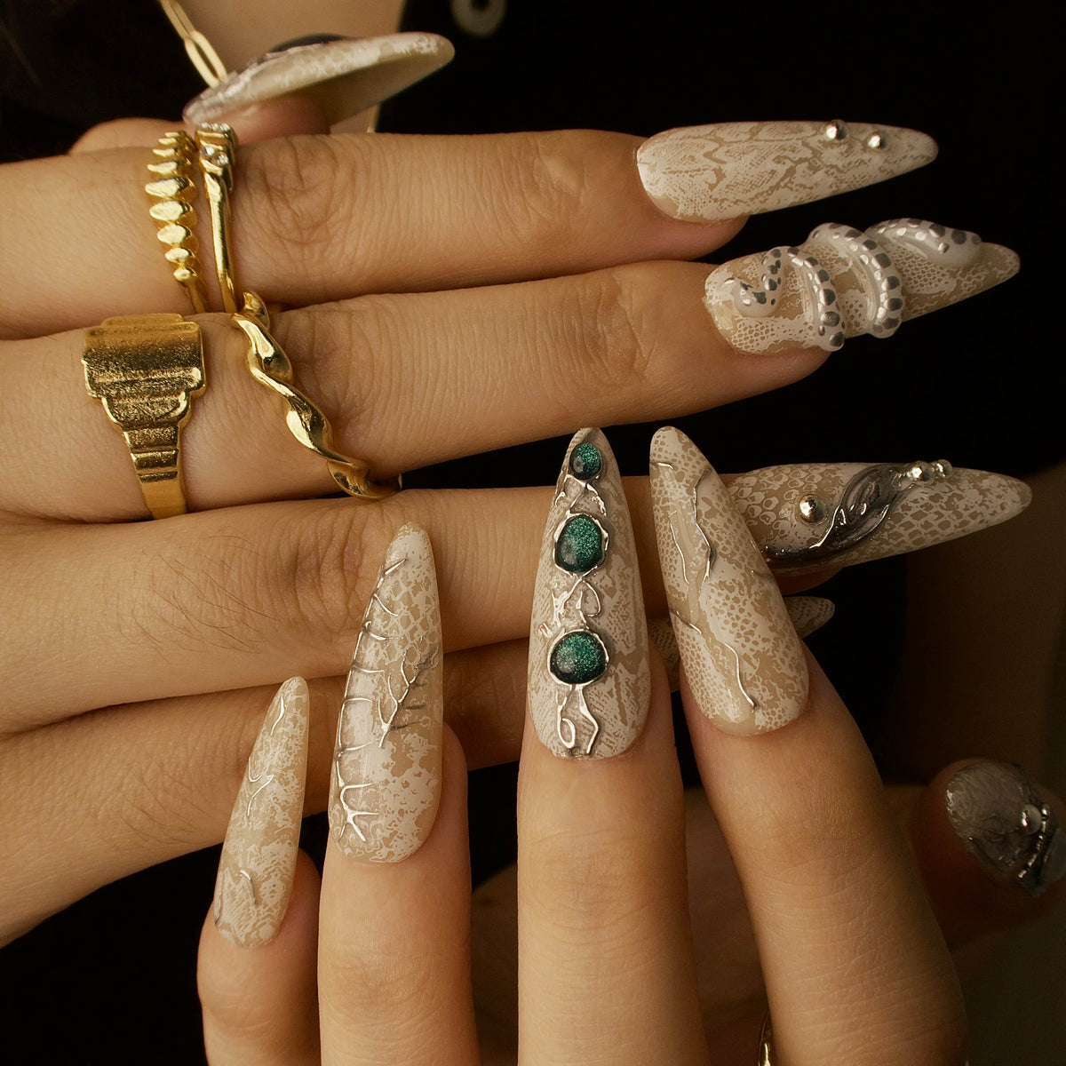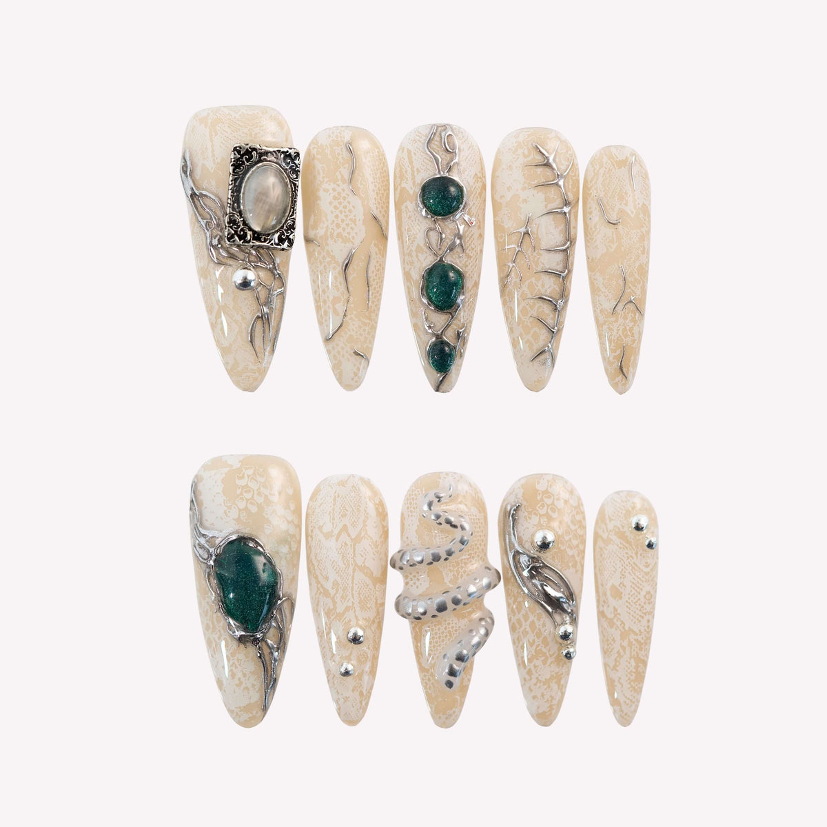 Silver Venom by swaraNails is a striking press-on nails set made for bold festival moments. Featuring a nude base adorned with white lace patterns, shimmering silver lines, and hypnotic green cat eye accents, this set is finished with a statement 3D snake embellishment that commands attention. A daring blend of elegance and edge—perfect for the music festival crowd.