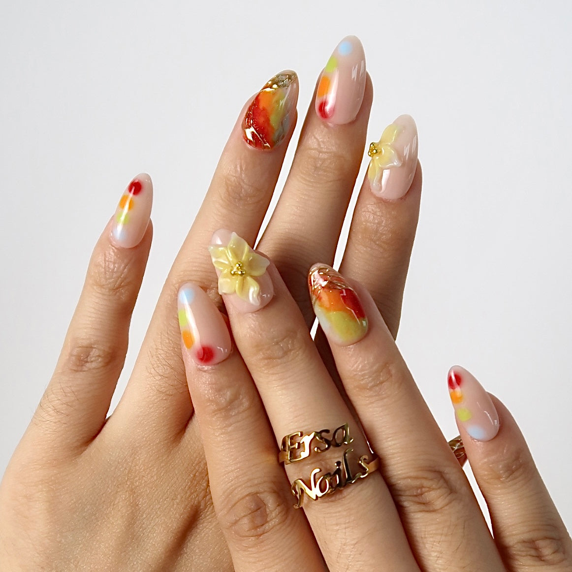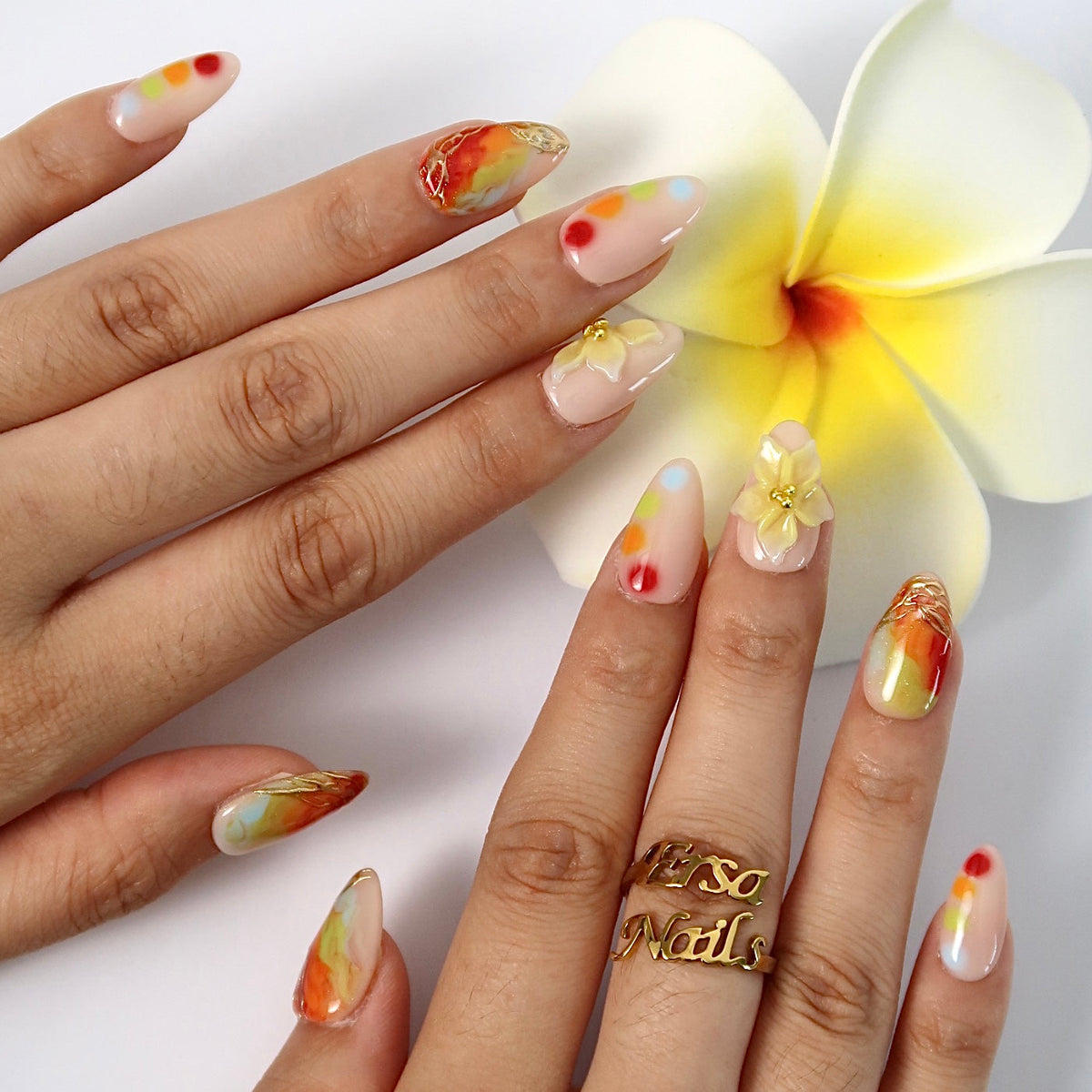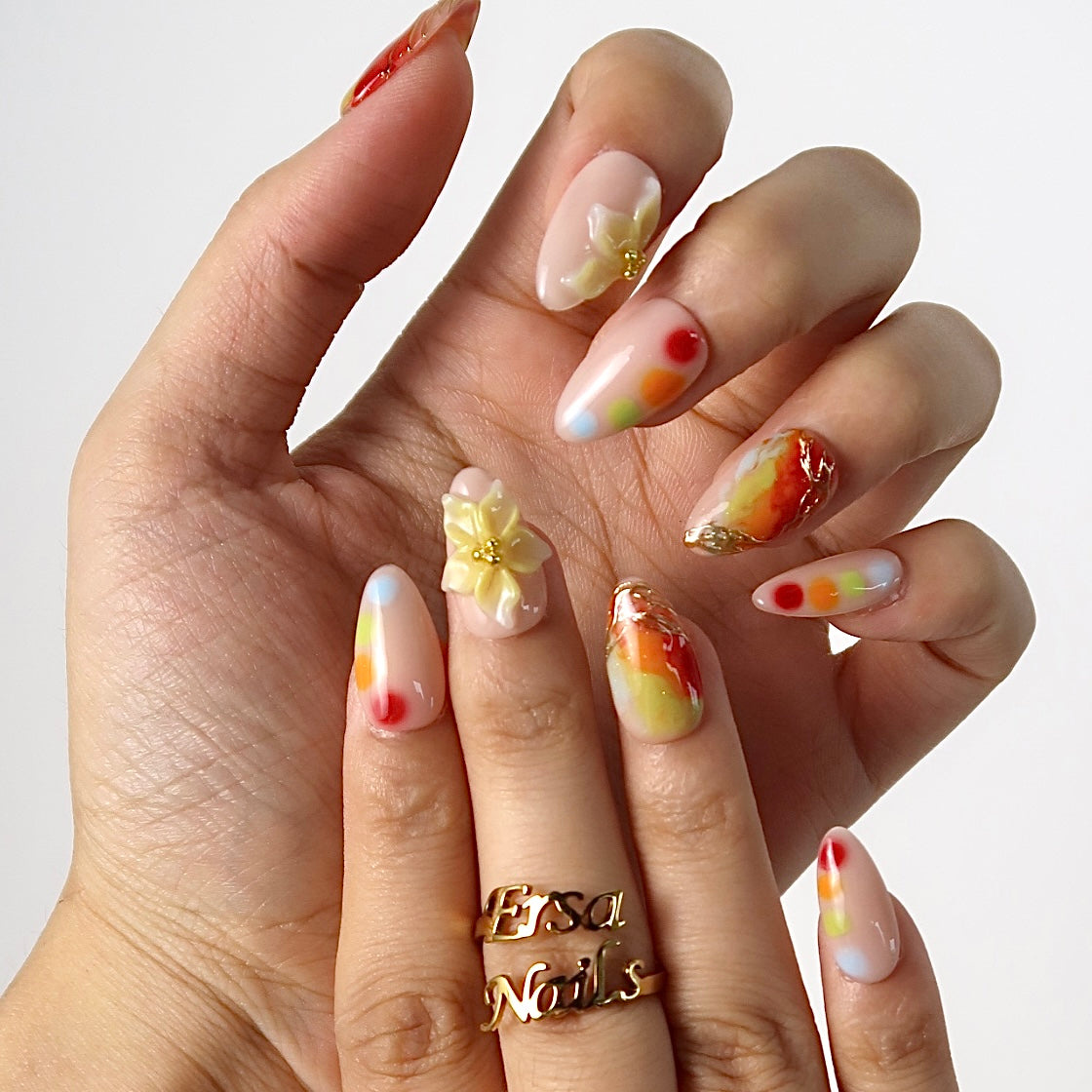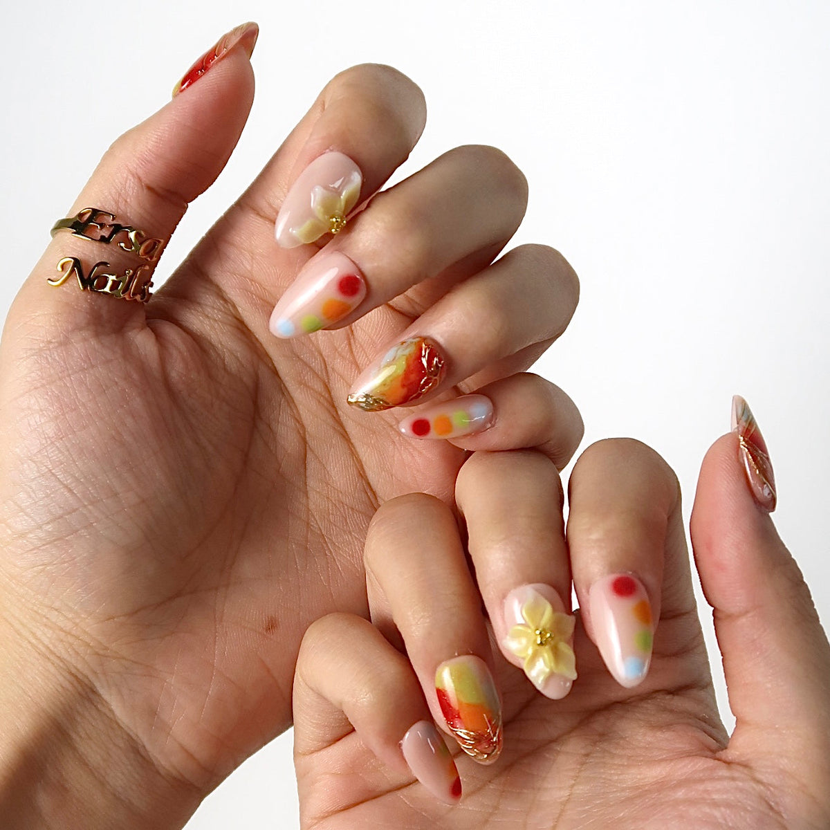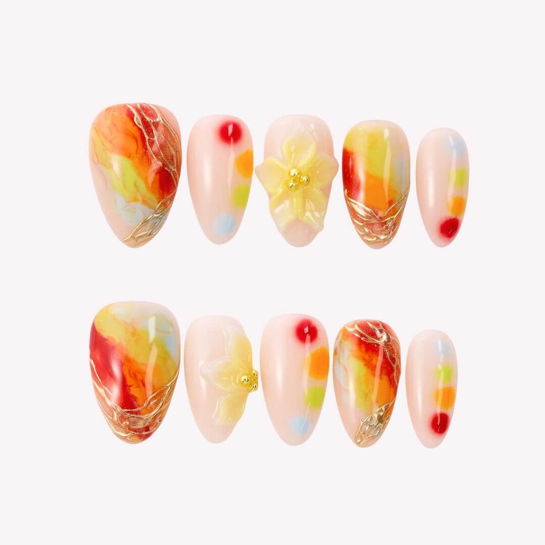 Get ready to turn heads with HultyNail’ Splashy press-on nails! Featuring a chic nude base bursting with vivid red, orange, green, and blue watercolor blends, this design is brought to life with stunning 3D floral accents and shimmering gold lines. Perfect for making a bold, artistic statement wherever you go!