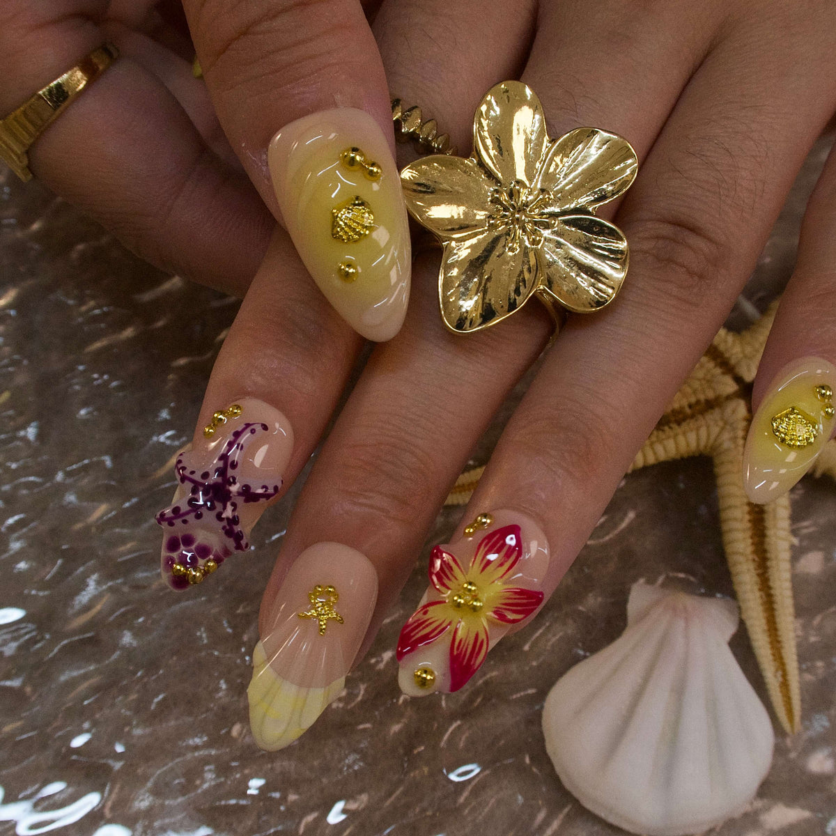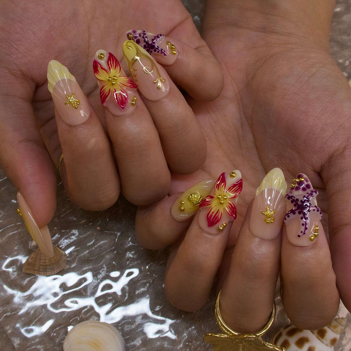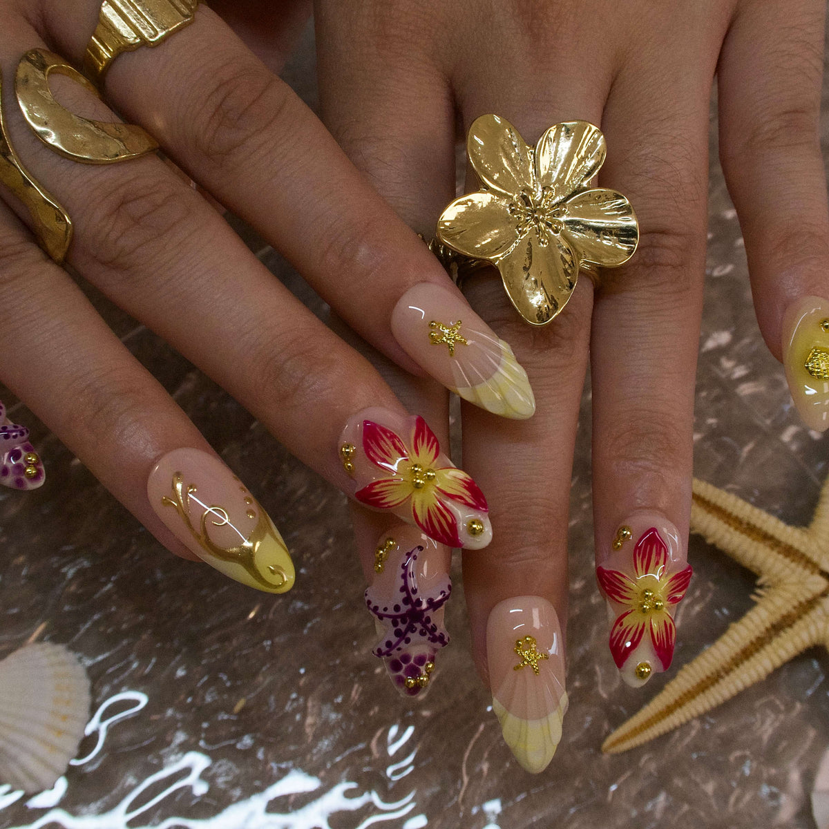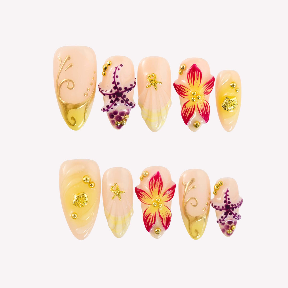 Starfish Waltz by HultyNail plunges you into a sun - kissed ocean paradise. Set against a soft peach base, it blends vivid coral flowers, purple starfish, and dainty gold sea - inspired accents. Each nail tells a story of tropical reefs, with 3D - like blooms and shimmering details that capture the essence of a beach getaway. Ideal for bringing a touch of coastal charm to festivals or summer outings.