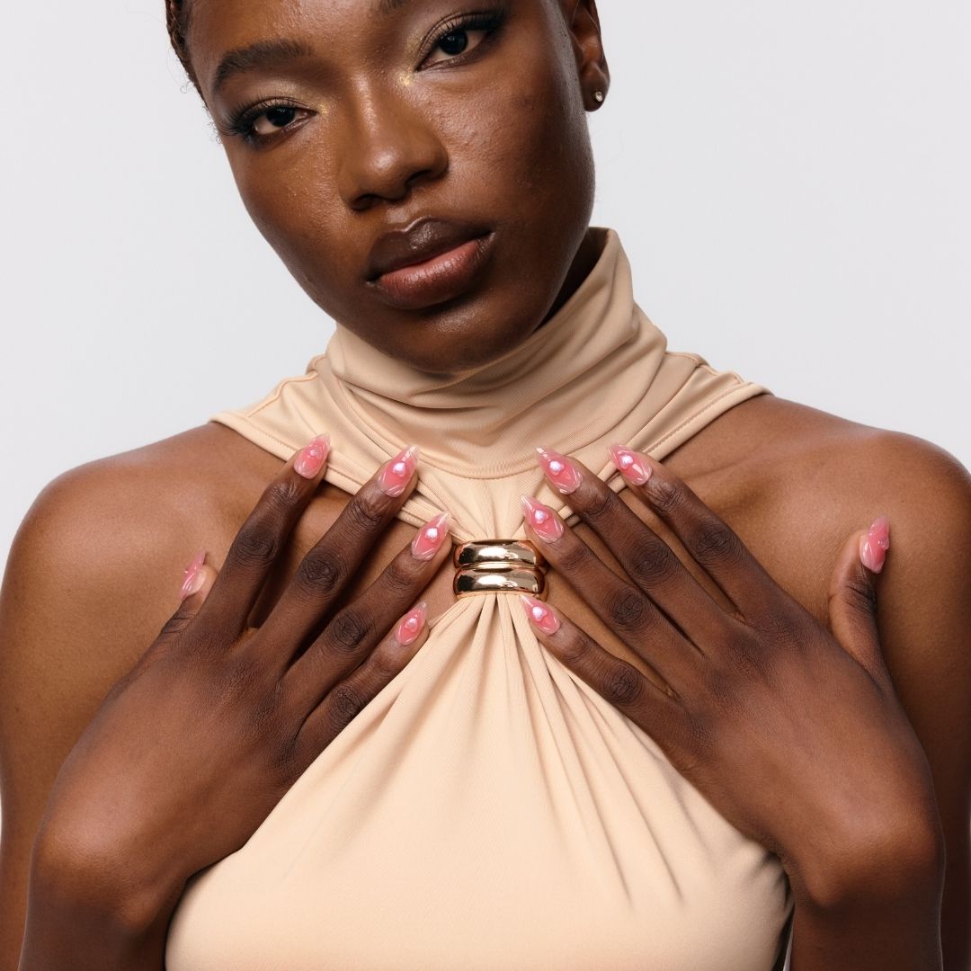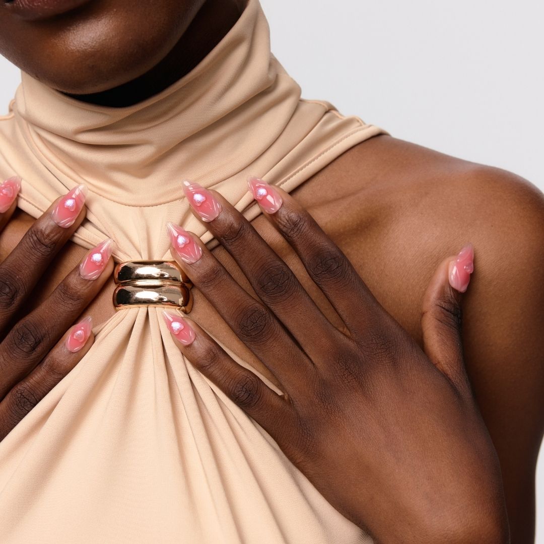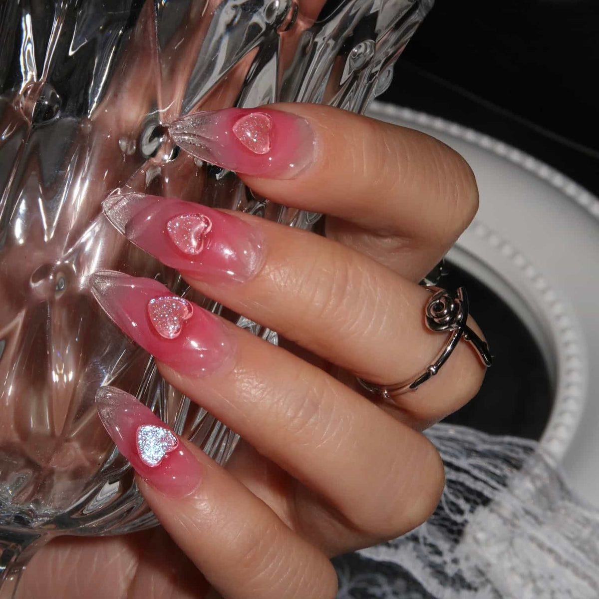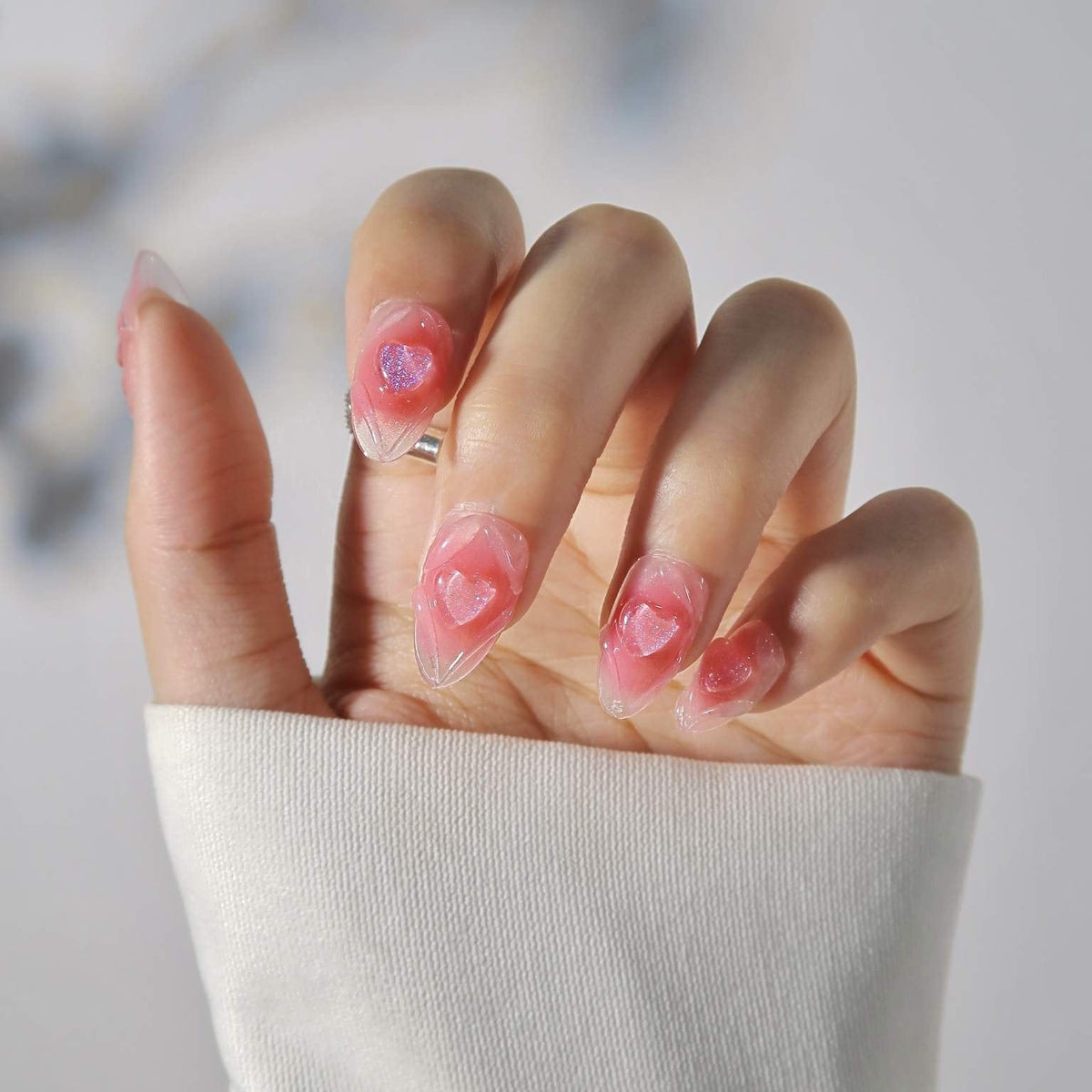 Sweetheart press on nails set is a romantic ode to love's tender touch. Soft pink swirls dance with glimmering glitter hearts, encapsulating the fluttering excitement of a first crush. These nails, with their translucent finish and delicate sparkle, are perfect for adding a whisper of romance to any ensemble. Whether for a date night or a self-care day, let your fingertips blossom with the sweet, enchanting allure of affection.