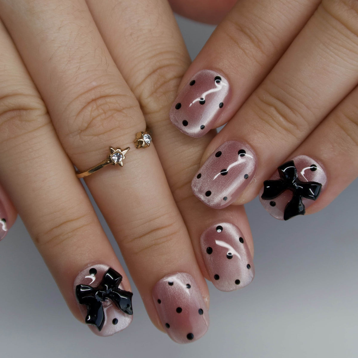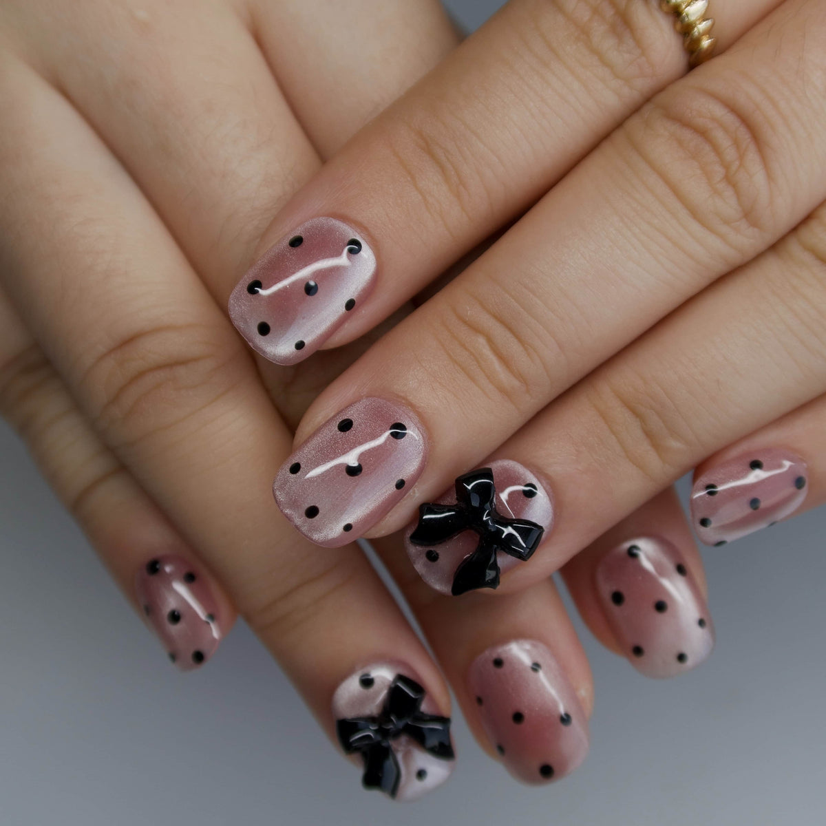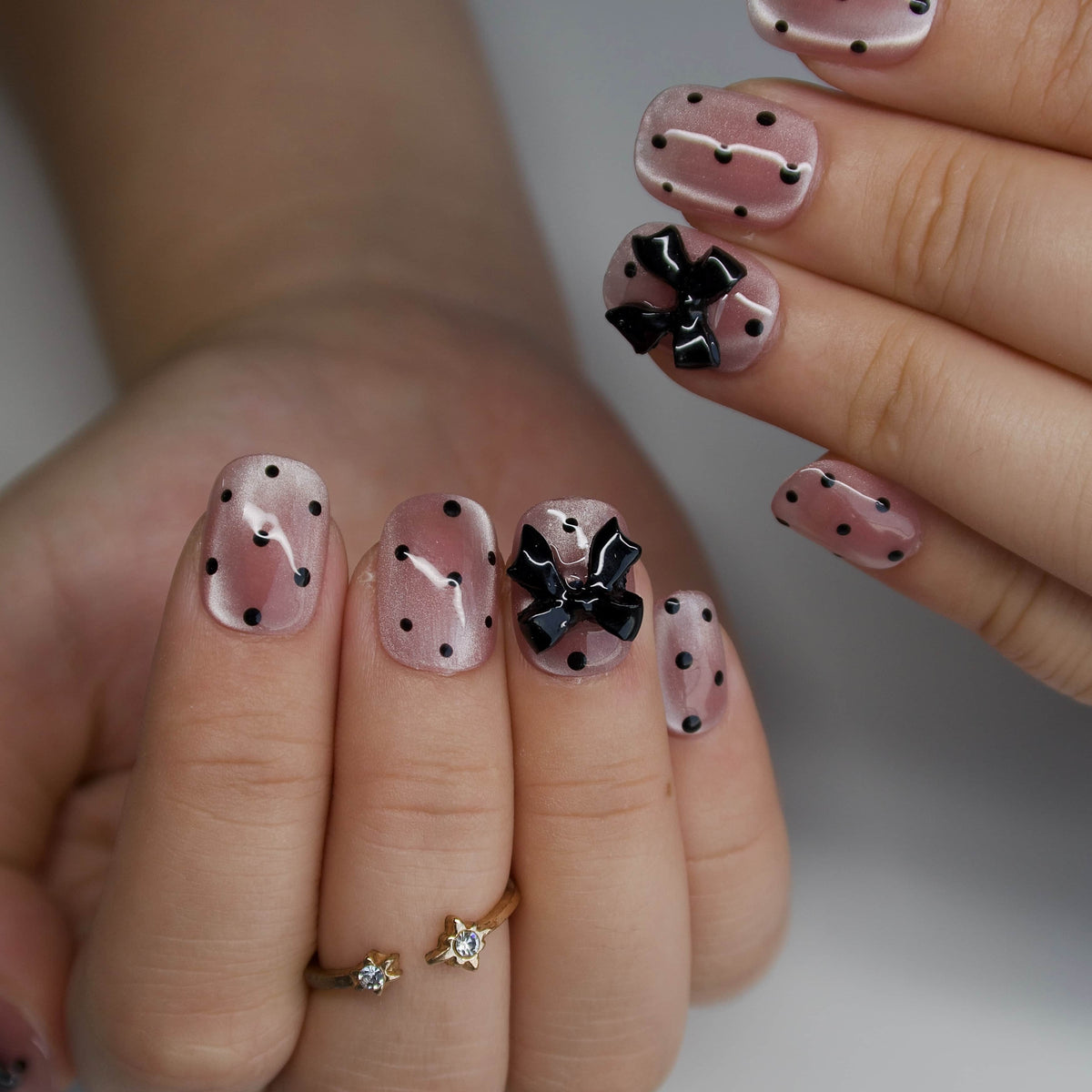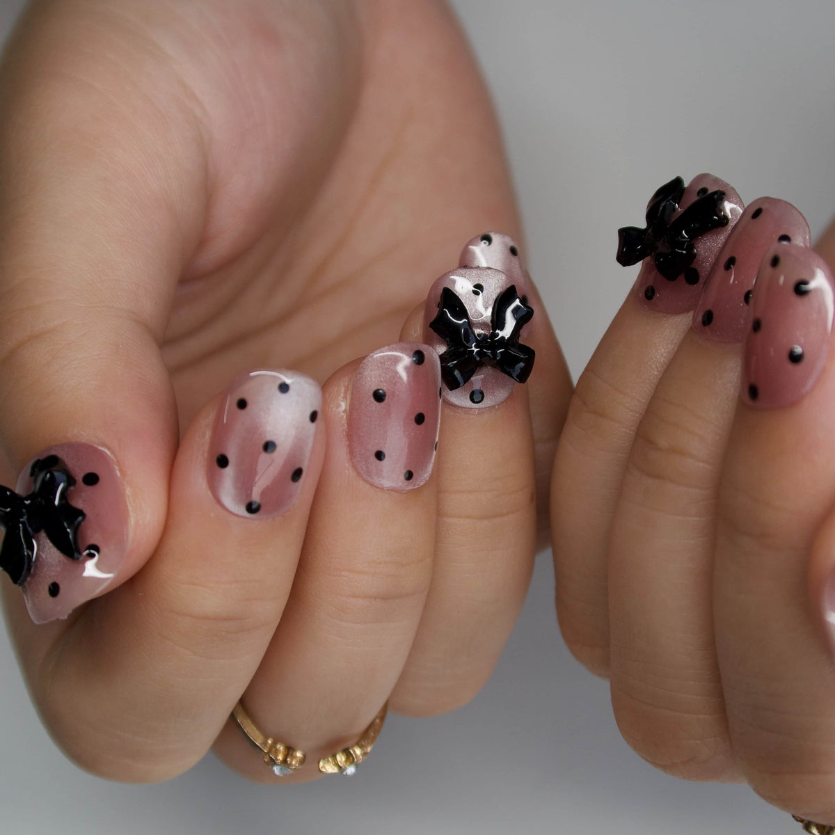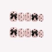 The Dress by HultyNail is an utterly charming press - on nails set that radiates sweet sophistication. Featuring a lovely blend of soft pink hues, classic black polka dots, and cute black bow accents, it brings to mind the whimsical charm of vintage - inspired fashion, like a delightful scene from a retro storybook. The pairing of the playful polka dots and the elegant bows, along with the smooth, polished finish, creates a lovely, feminine vibe. It's perfect for adding a touch of adorable charm to both everyday life and special occasions. Cute yet full of style, it's a wonderful choice for those who adore sweet and nostalgic nail looks.