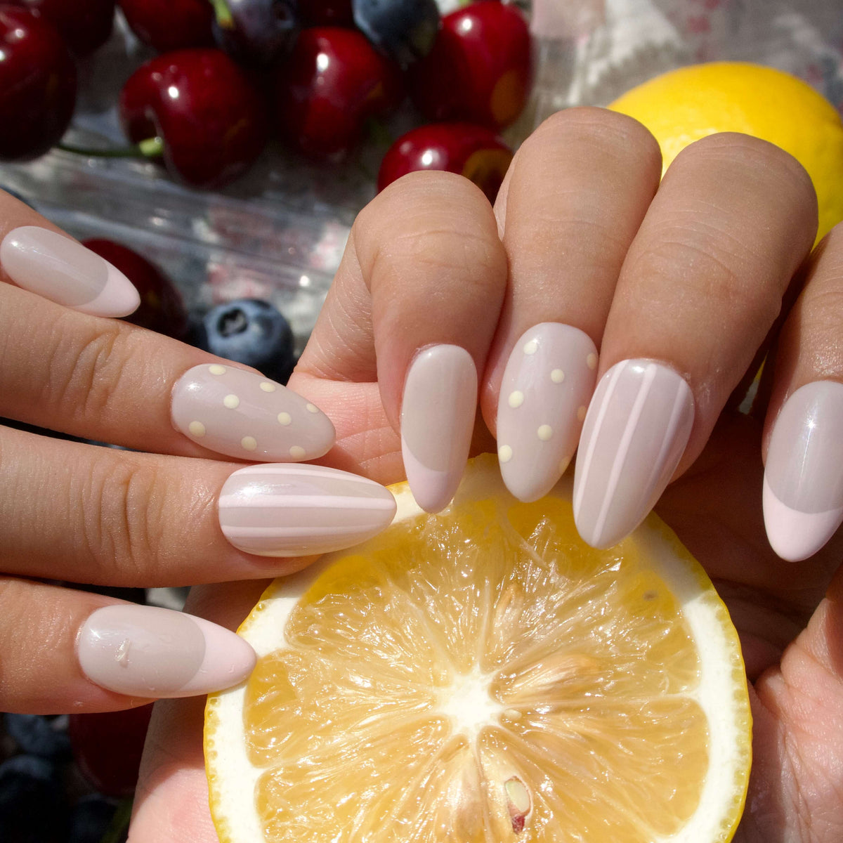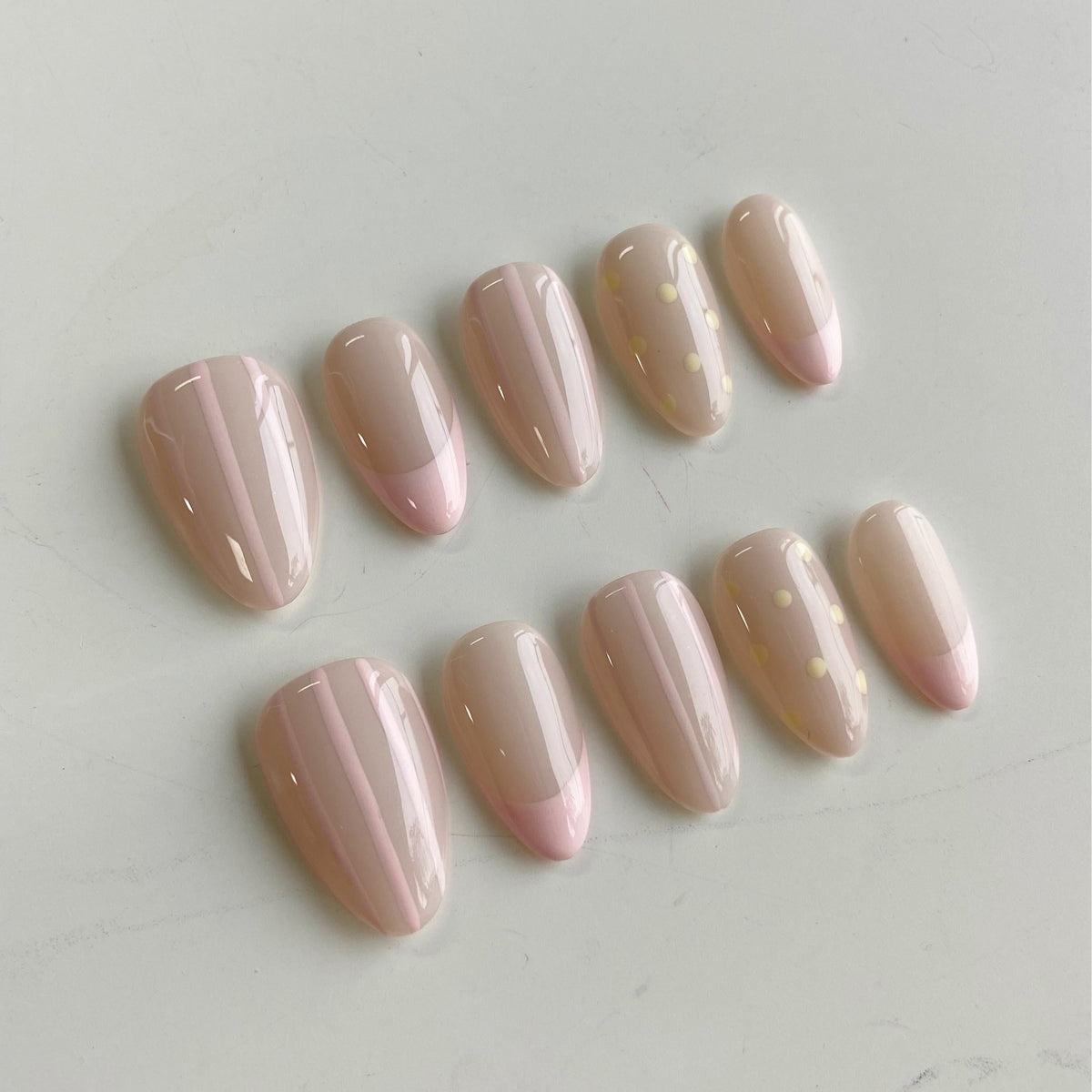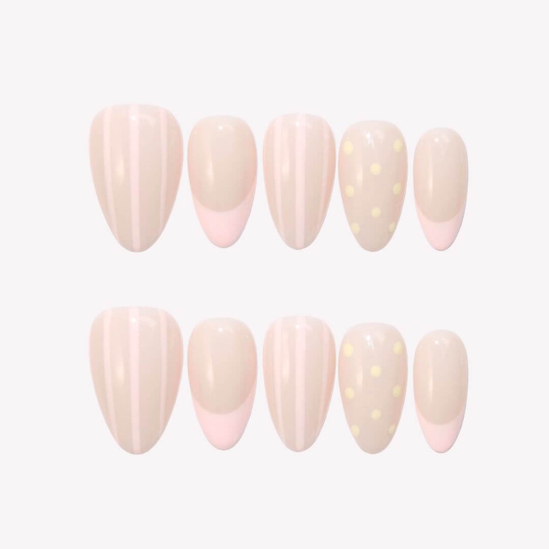Let your nails breathe with effortless charm in Time to Unwind by HultyNail. These nude-based press-on nails blend soft pink tones with delicate stripes and a modern French tip design. A pop of pale yellow polka dots on the ring finger adds a playful twist—perfect for those slow, relaxing days when all you need is a touch of sweetness.
