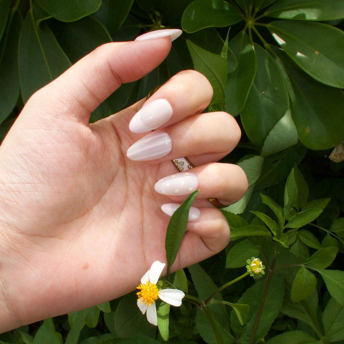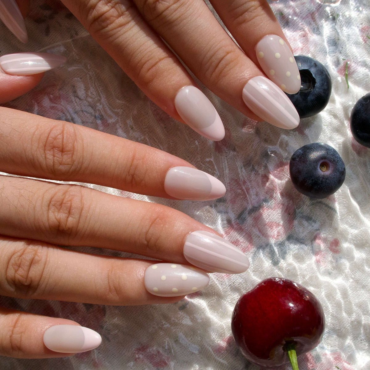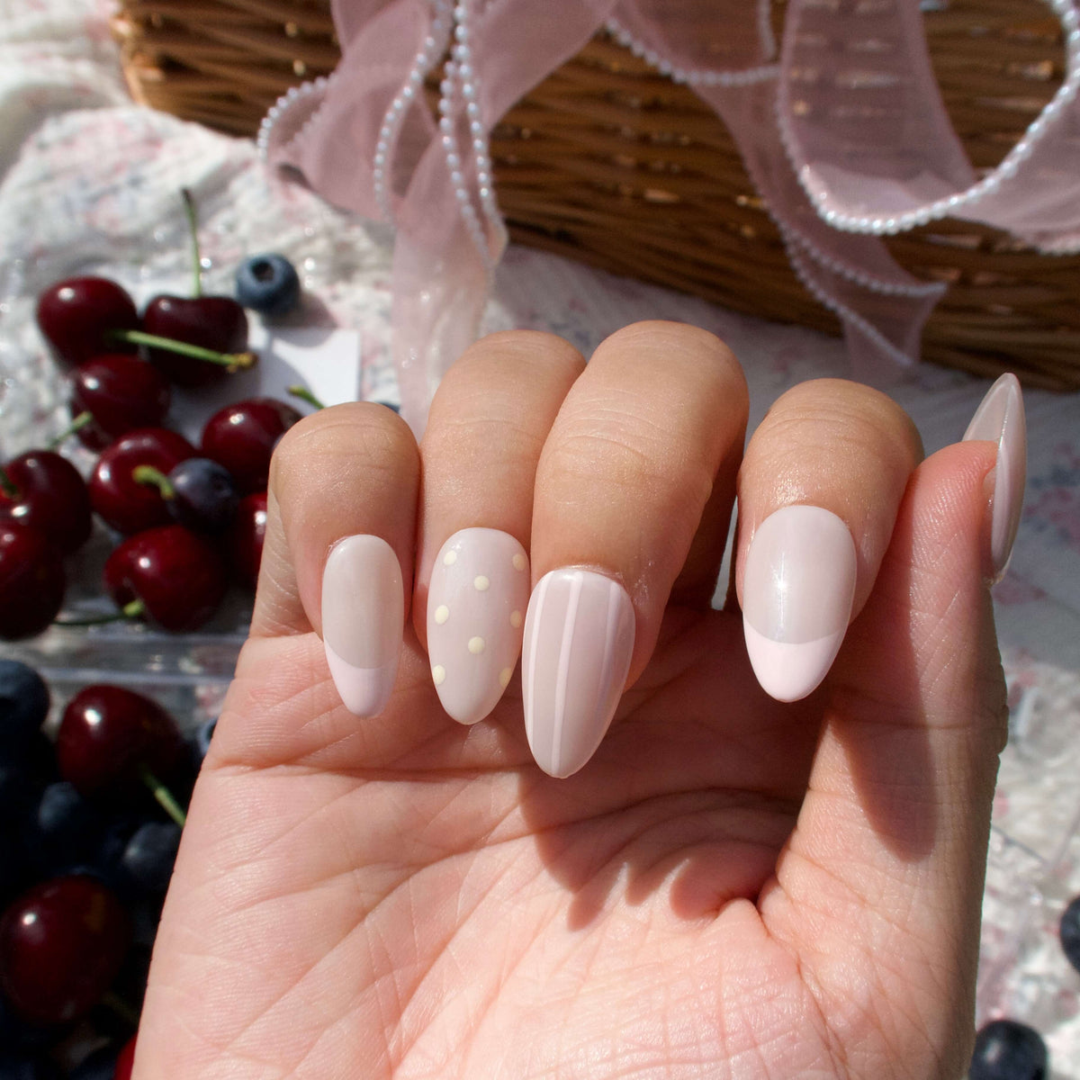 Let your nails breathe with effortless charm in Time to Unwind by HultyNail. These nude-based press-on nails blend soft pink tones with delicate stripes and a modern French tip design. A pop of pale yellow polka dots on the ring finger adds a playful twist—perfect for those slow, relaxing days when all you need is a touch of sweetness.