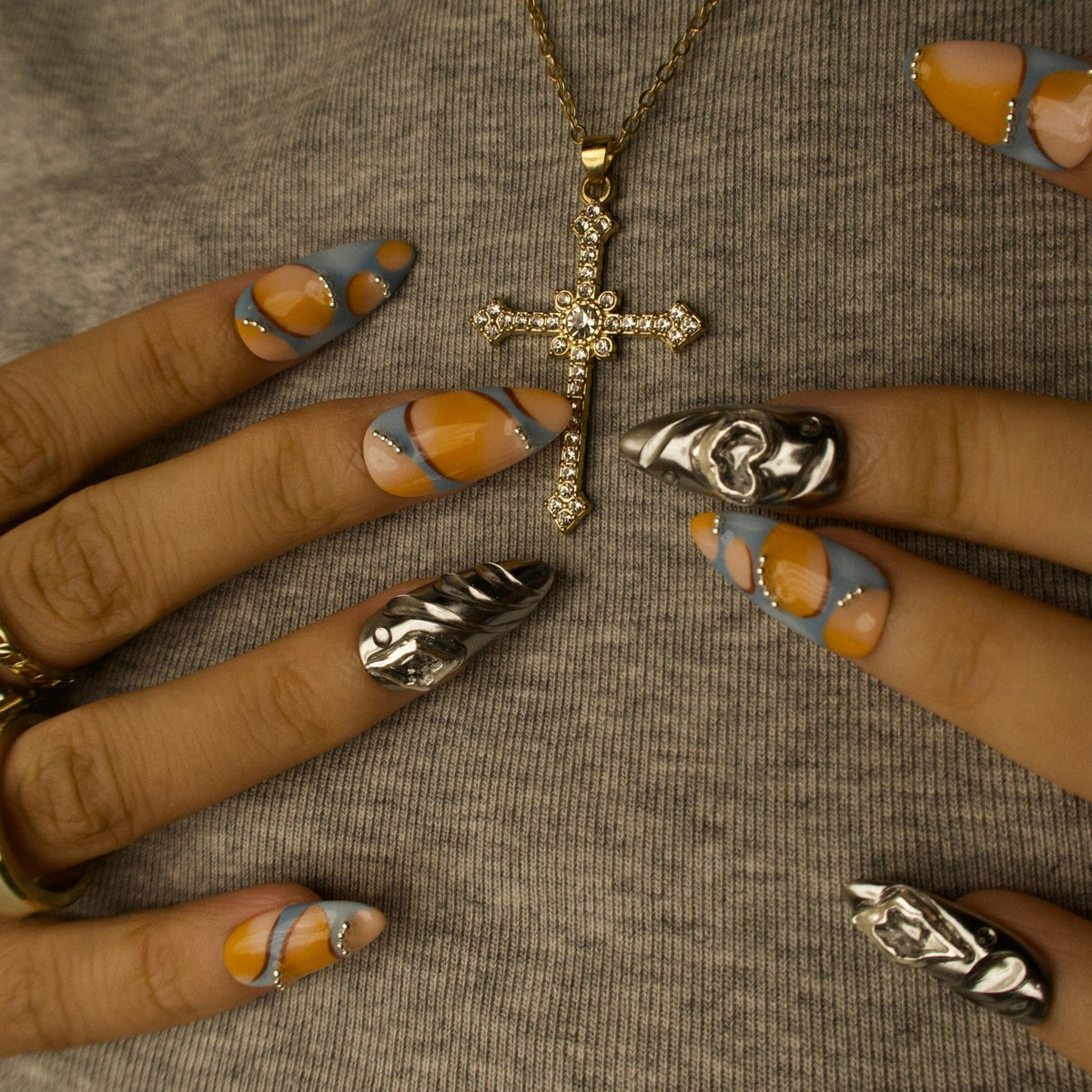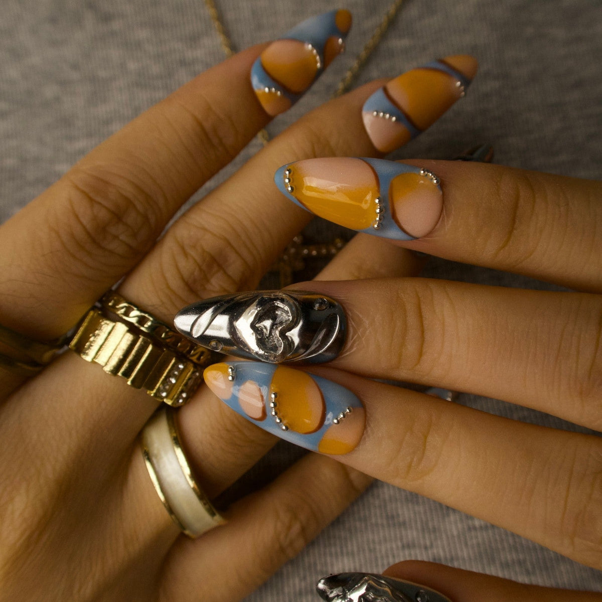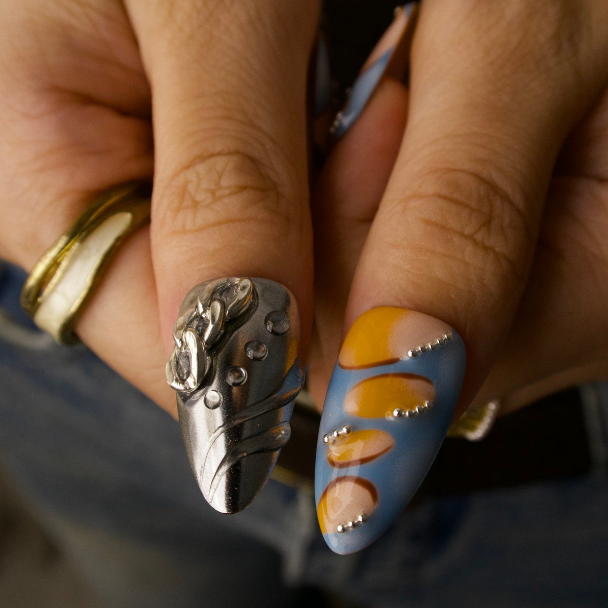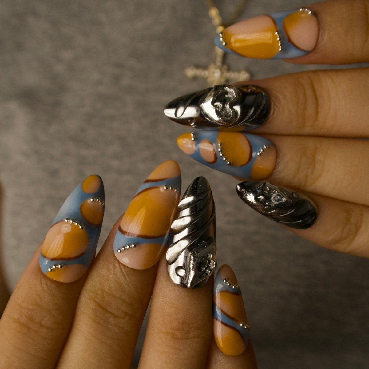 Break free from the ordinary with Unchained Soul by Swara Nails. These statement press-on nails combine a nude base with vivid orange marbling and shimmering silver, accented by silver beads, heart charms, and edgy chain details. With a 3D mermaid finish that adds depth and movement, this set captures fearless self-expression and coastal rebellion in one striking look.