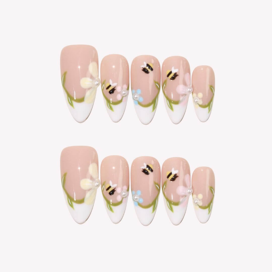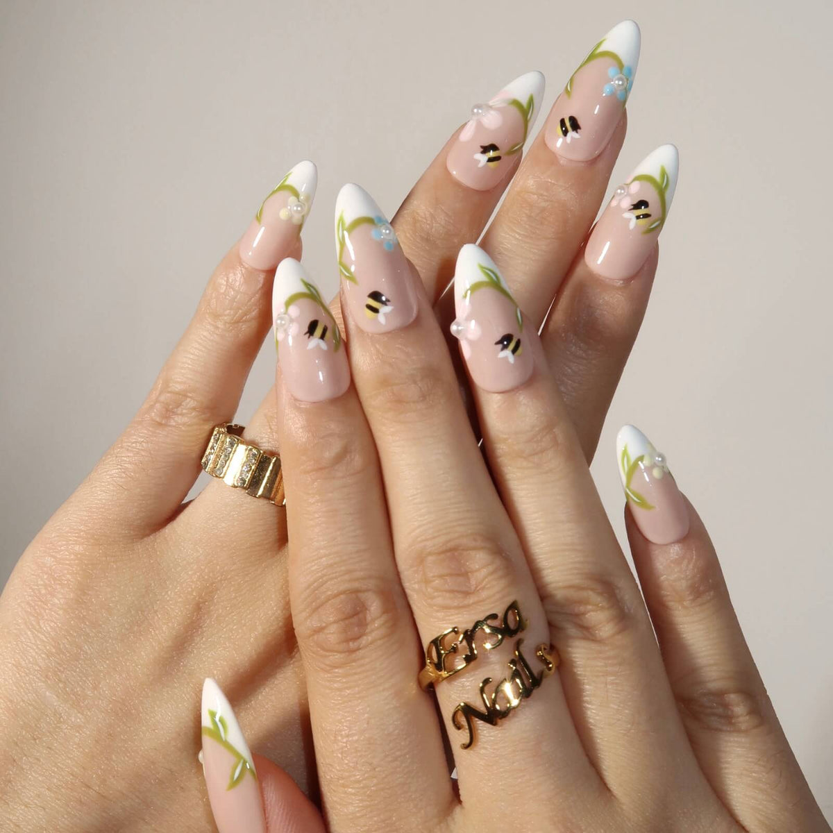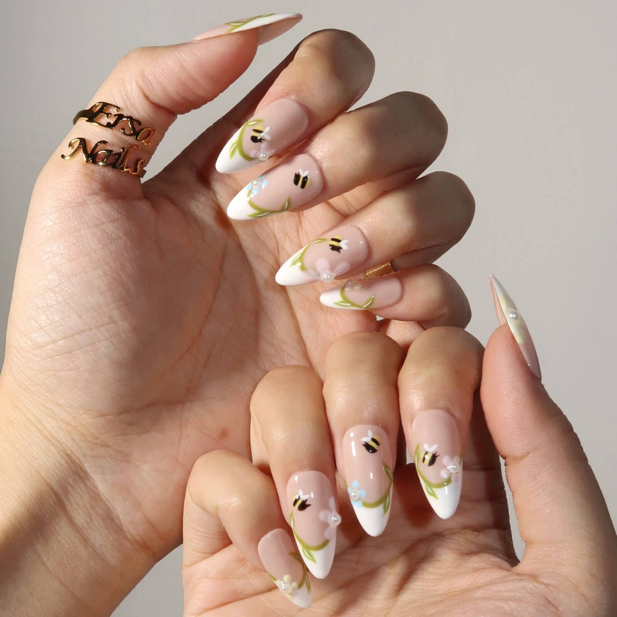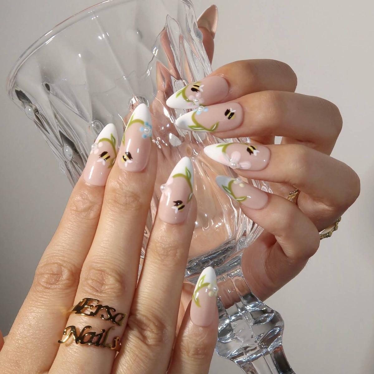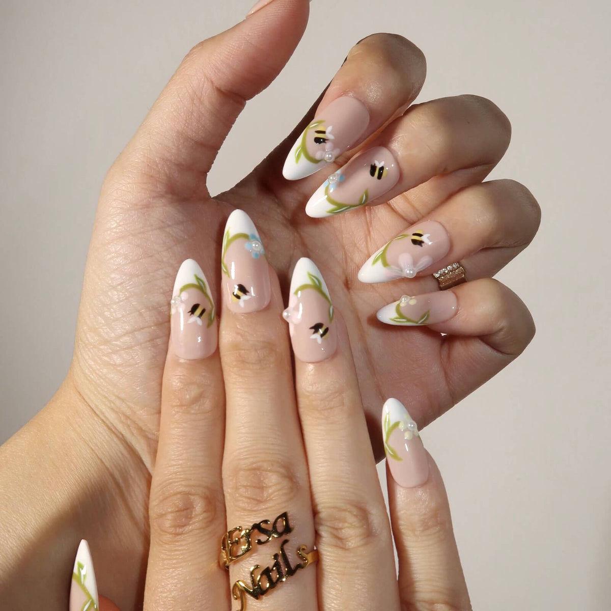 Embrace nature’s charm with the Verdant Poem press-on nails from swara Nails. Delight in a classic white French tip over a soft nude base, adorned with delicate green branches, blooming florals, and tiny bee accents. Bring a touch of fresh elegance to your nails with this effortlessly graceful design.