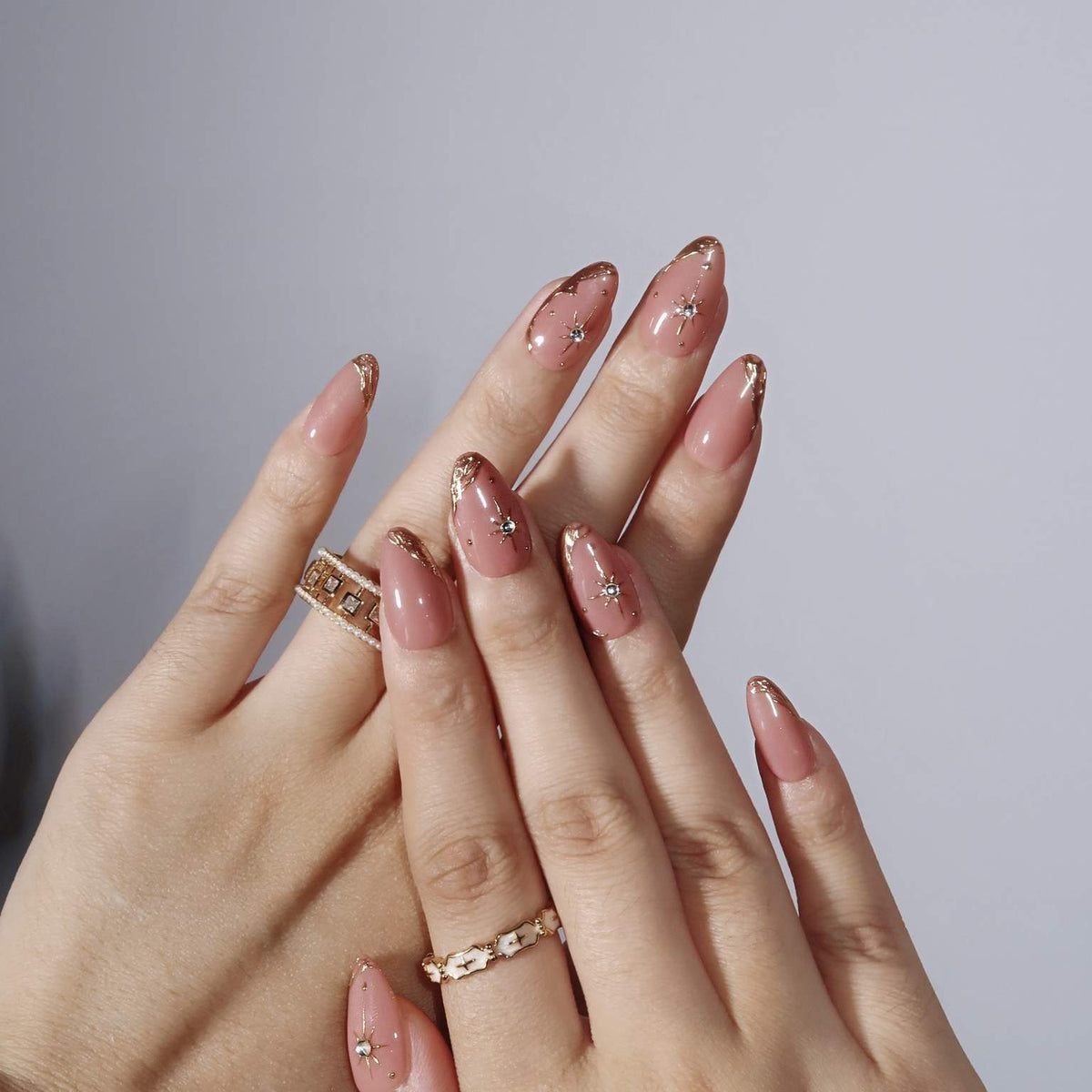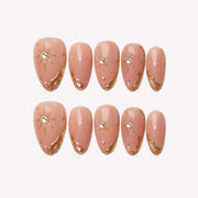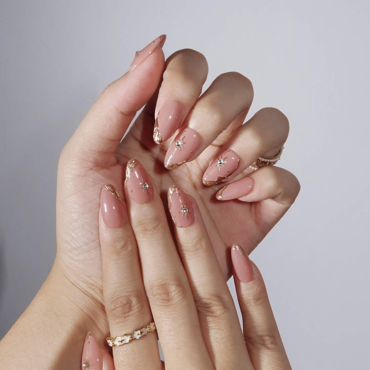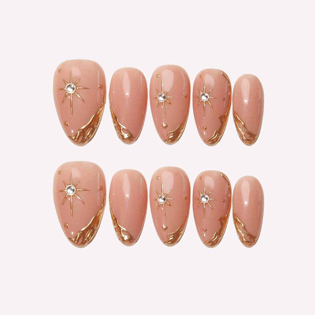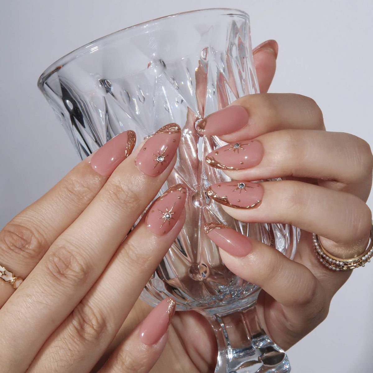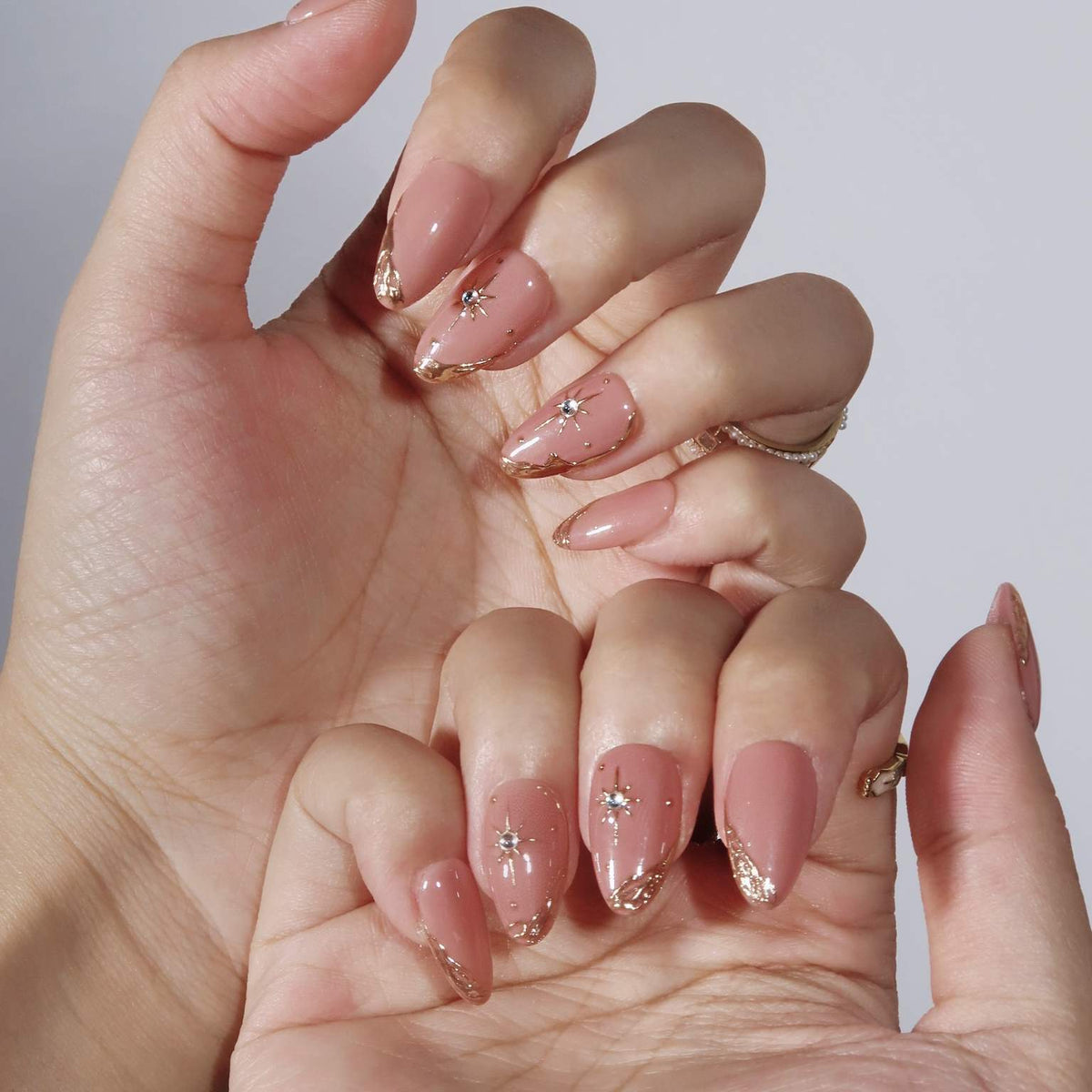 Aurora's Touch by swara Nails brings a celestial glow to your fingertips. Featuring a soft nude base, this design is delicately adorned with golden star accents that capture the magic of the night sky. Sparkling rhinestones add a touch of luxury, while golden lines at the tips offer a refined, elegant finish. Effortlessly chic and easy to apply, Aurora's Touch is perfect for adding a bit of cosmic elegance to any occasion.