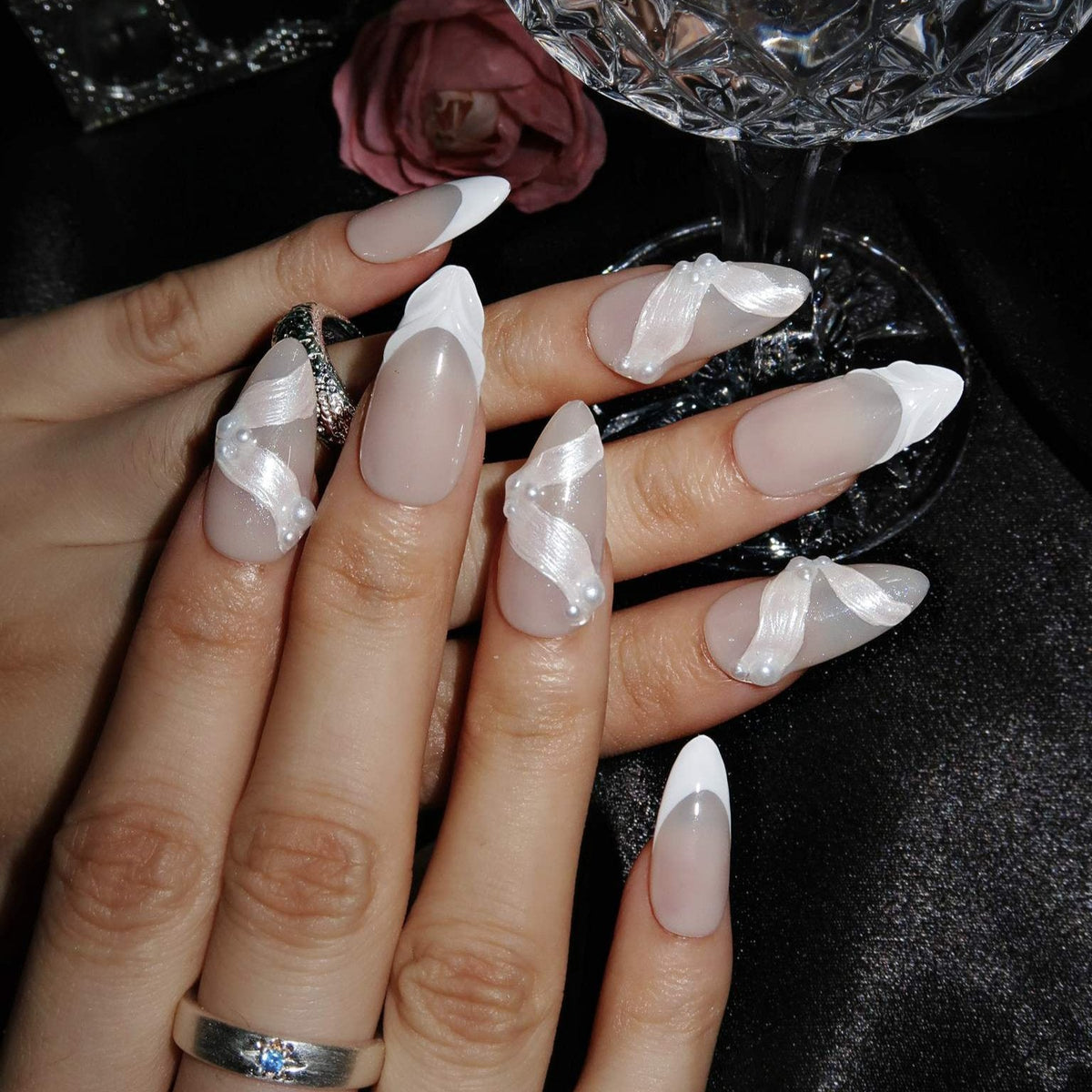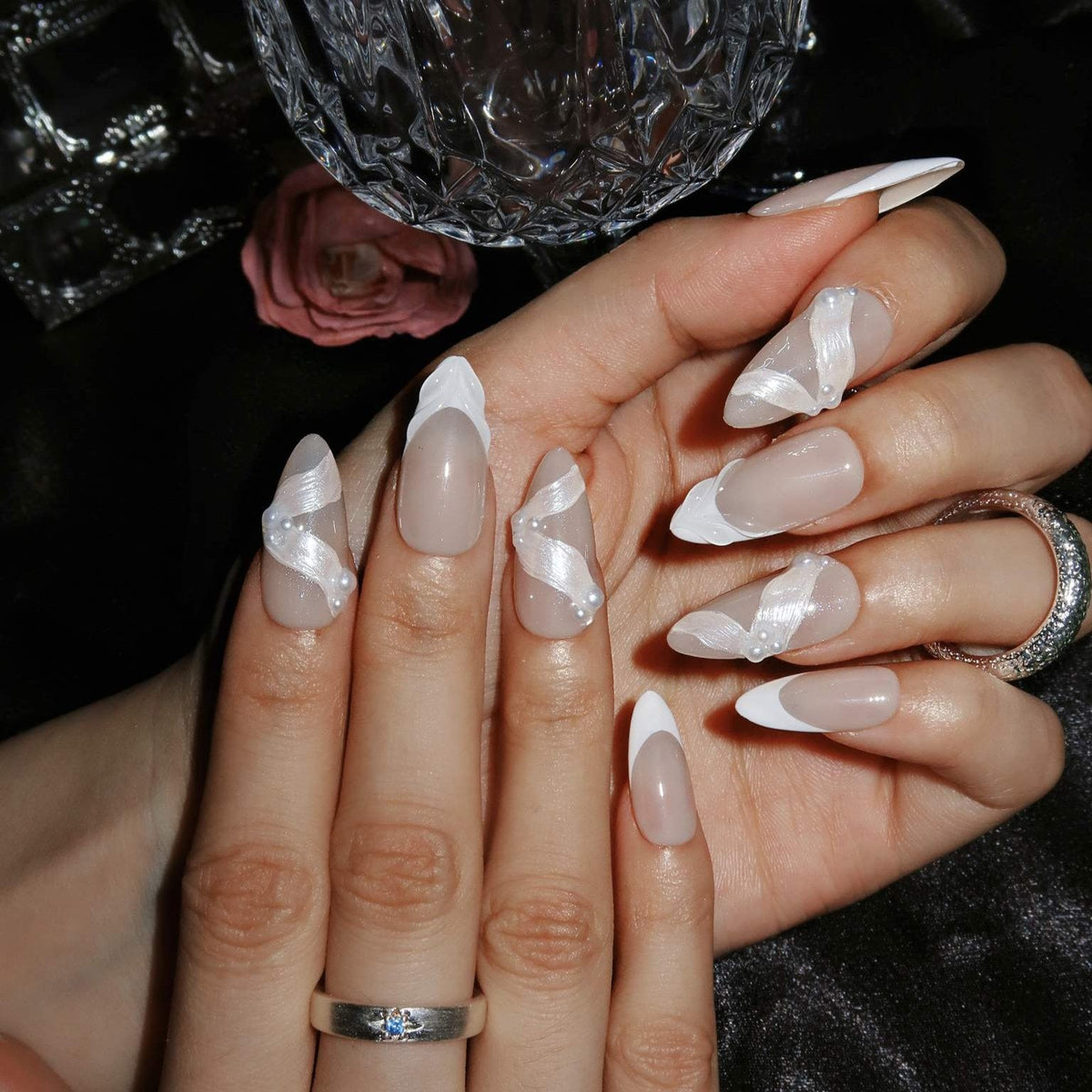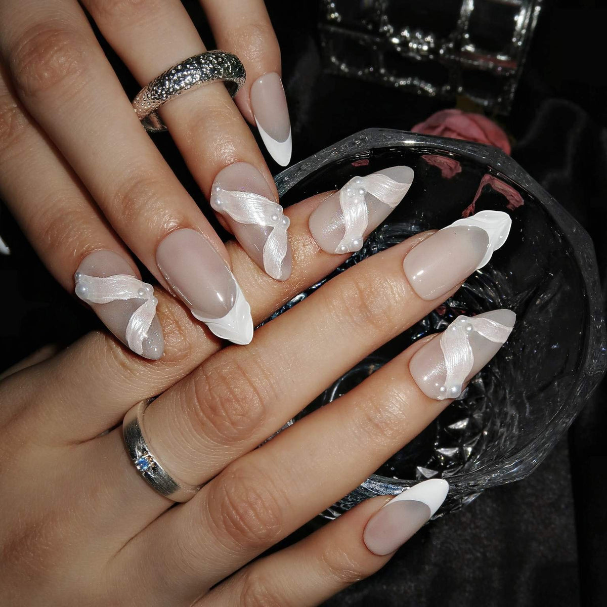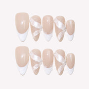 Introducing Silken Ties by HultyNail, a set that weaves the grace of silk into the strength of design. This ensemble features a unique blend of matte and sheen finishes, resembling the delicate play of light on silk threads. Each nail is a canvas showcasing a subtle, yet impactful accent of shimmering gloss against a dusky base, reminiscent of a silken scarf gently wrapped around your fingertips. The central highlight is the artfully crafted bow, giving a sense of movement and sophistication. These press-on nails are an epitome of understated luxury, perfect for anyone who values a touch of class that speaks volumes in whispers. Silken Ties isn't just a set of press-on nails; it's a statement of elegance that binds together contemporary fashion with timeless charm.