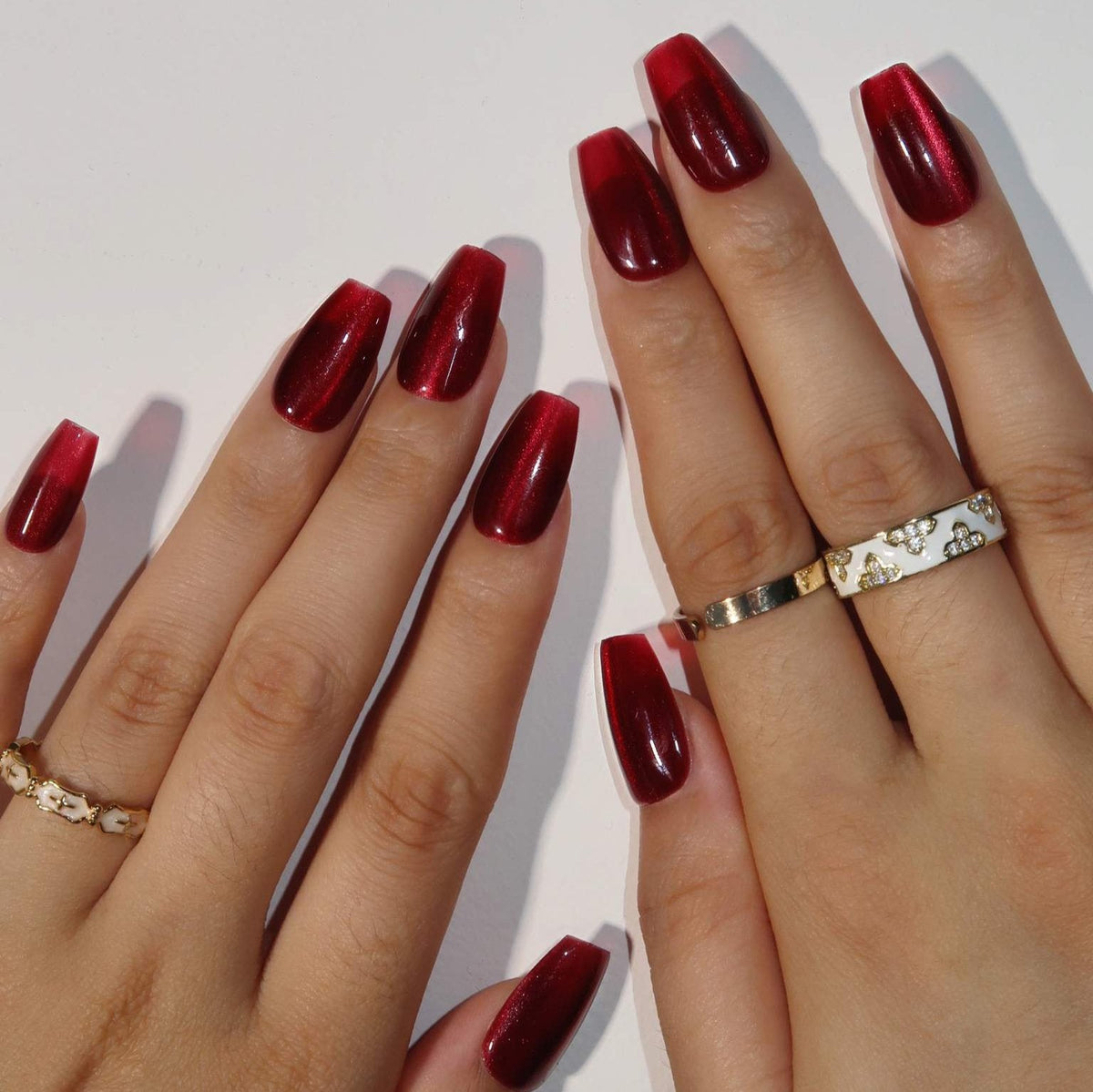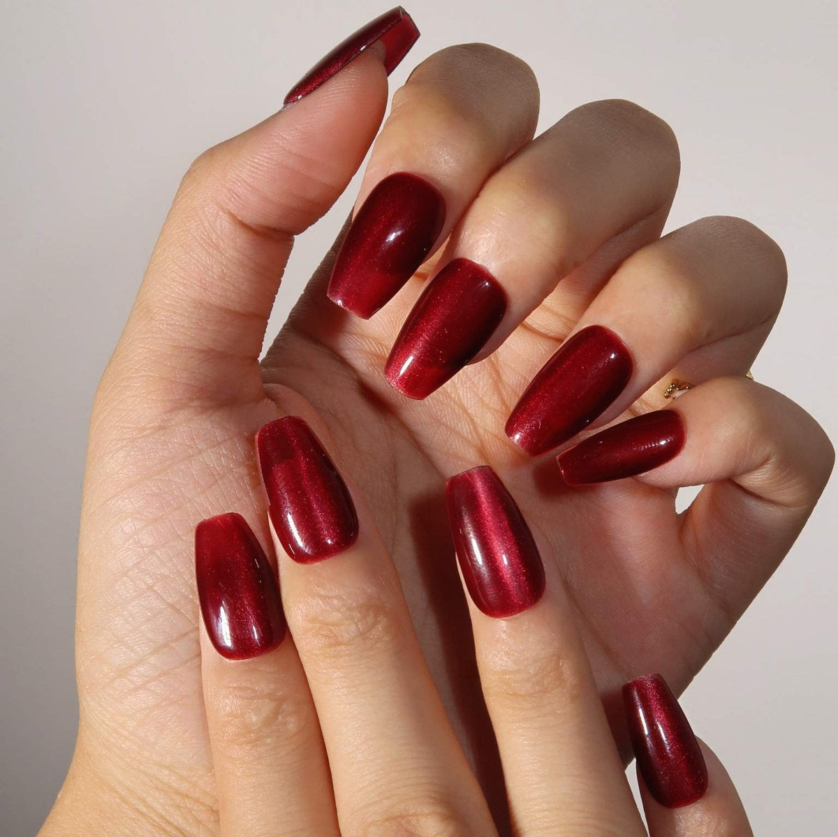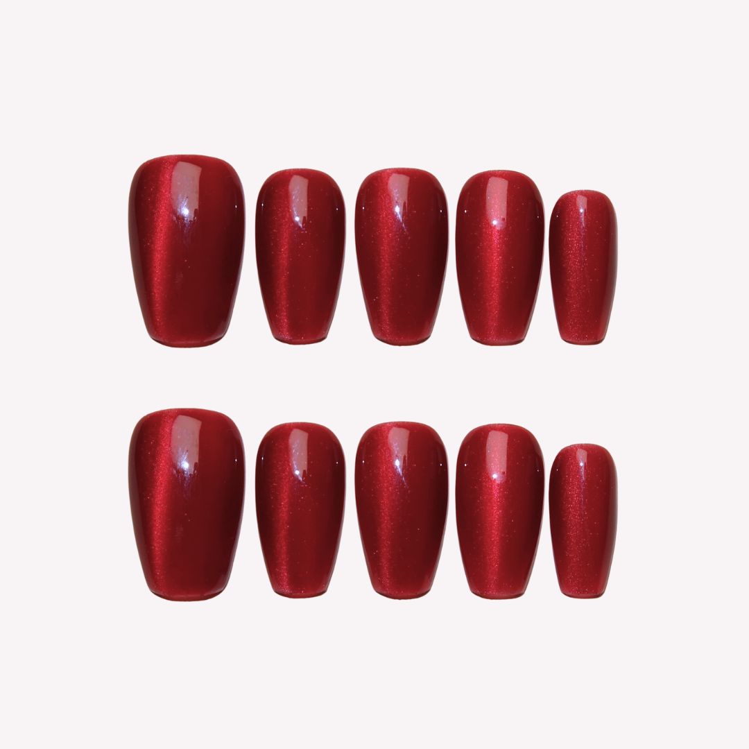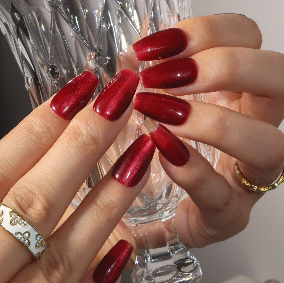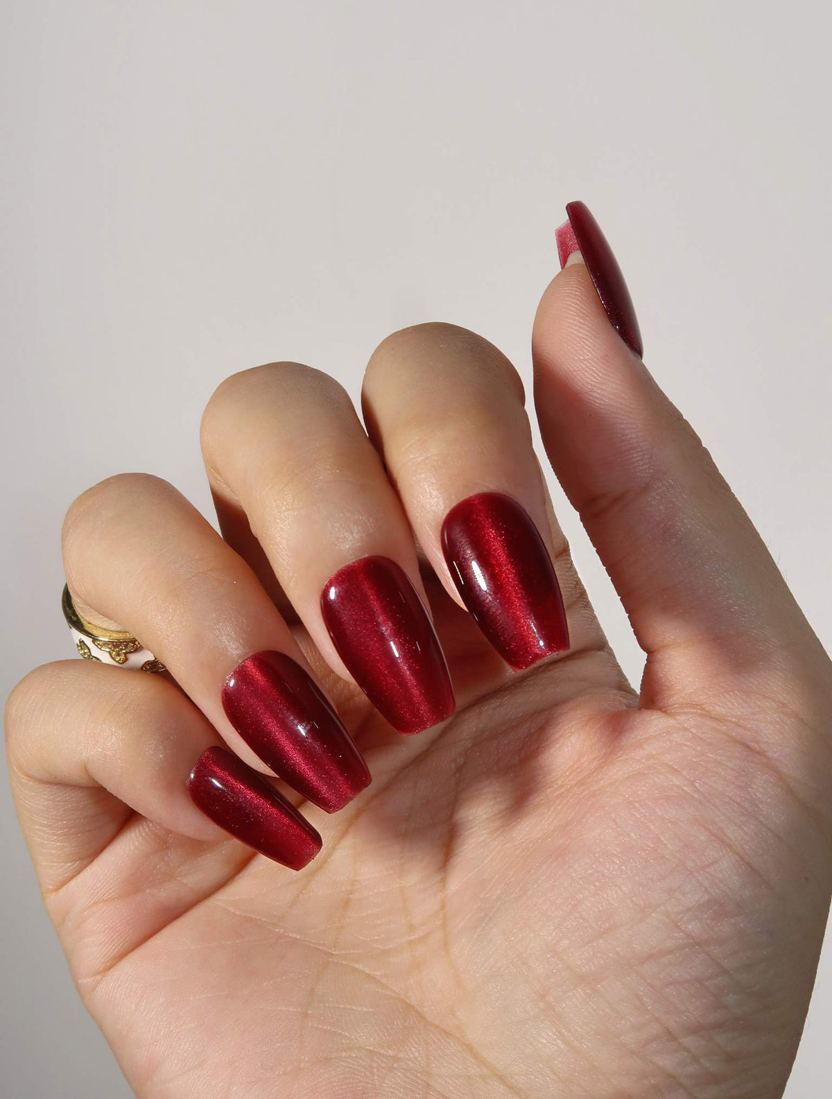 Reveal understated elegance with HultyNail' Hidden Gem press-on nails. Featuring a minimalist design with a deep red cat-eye effect, this set exudes sophistication and allure. Perfect for those who appreciate a bold yet refined look that adds a touch of mystery and glamour to any style.