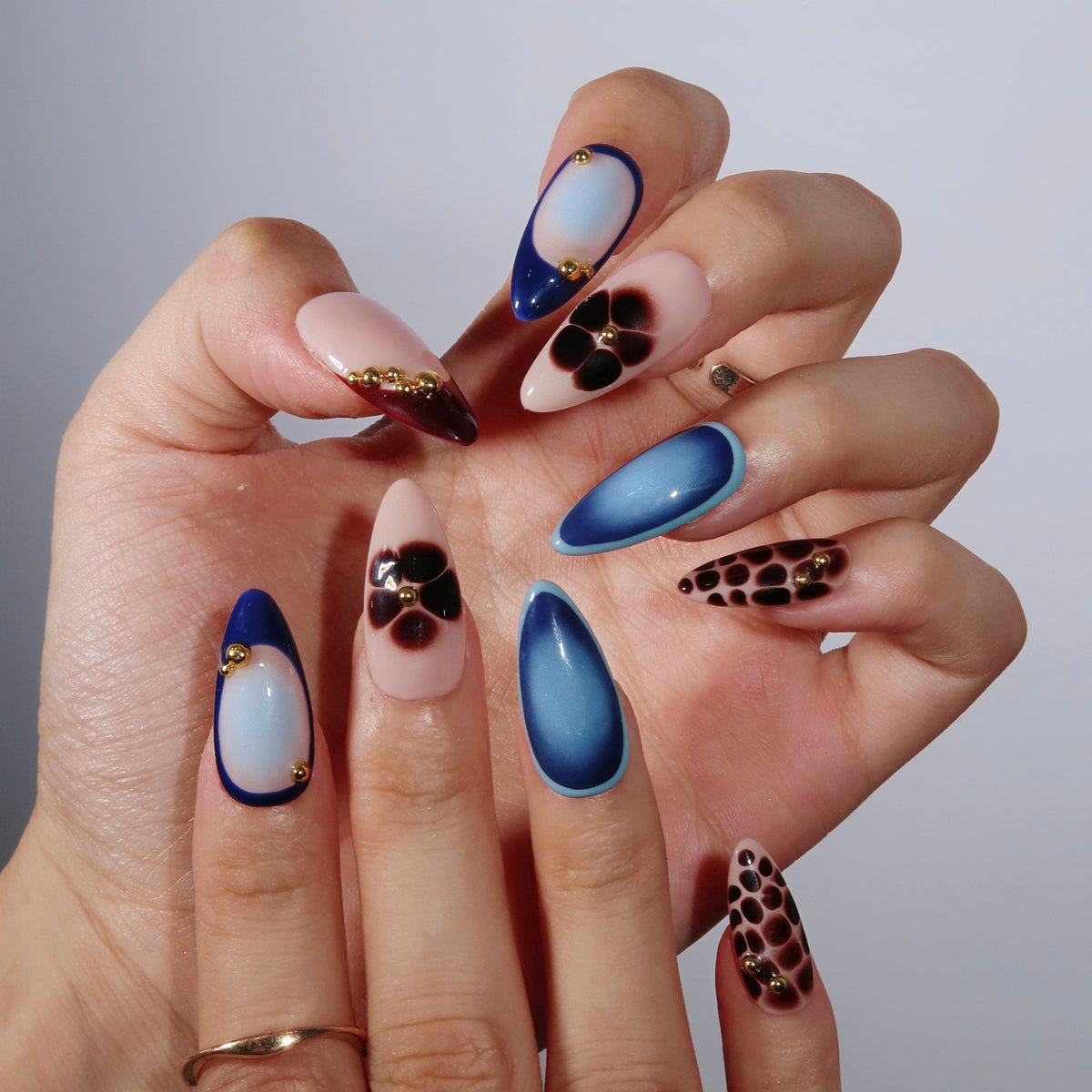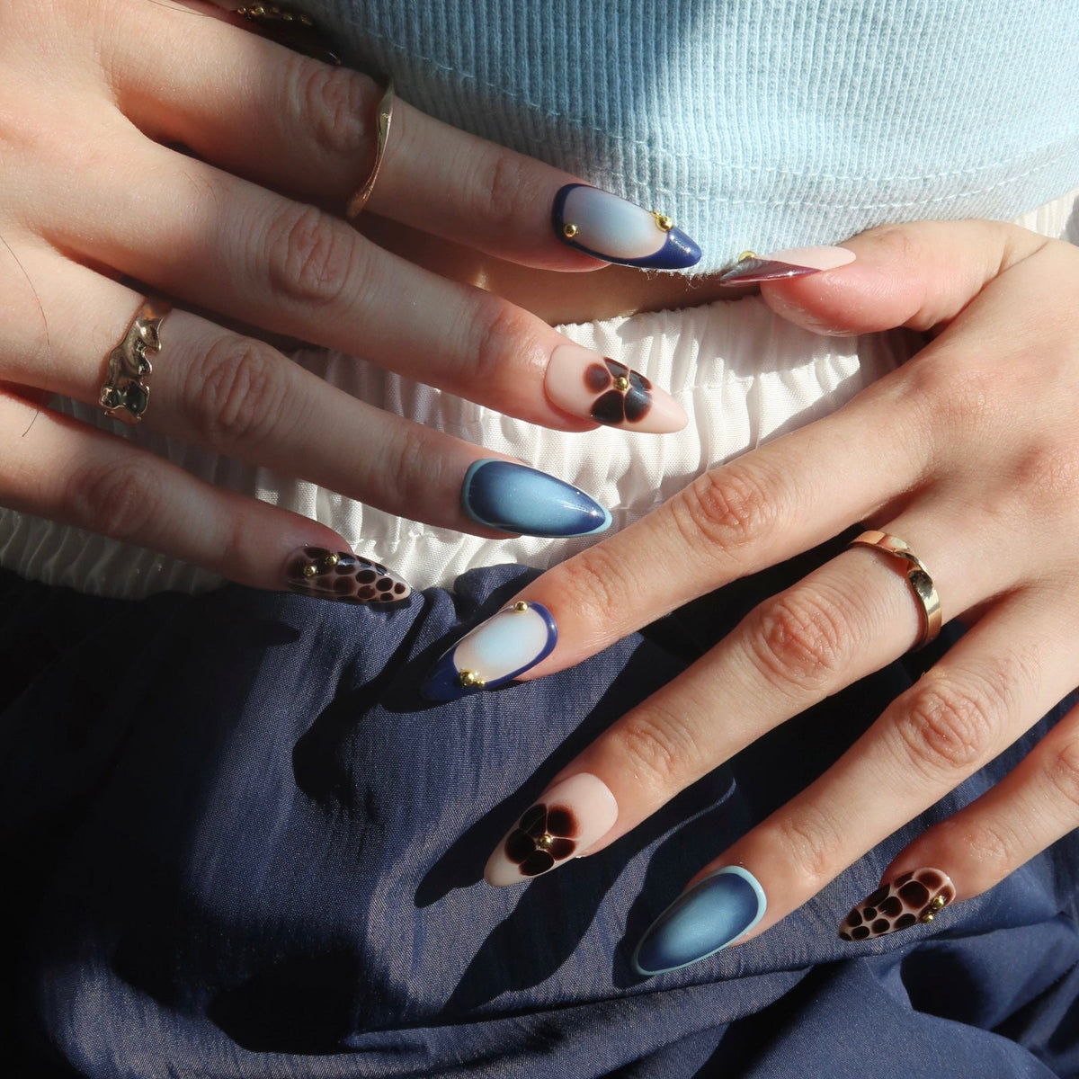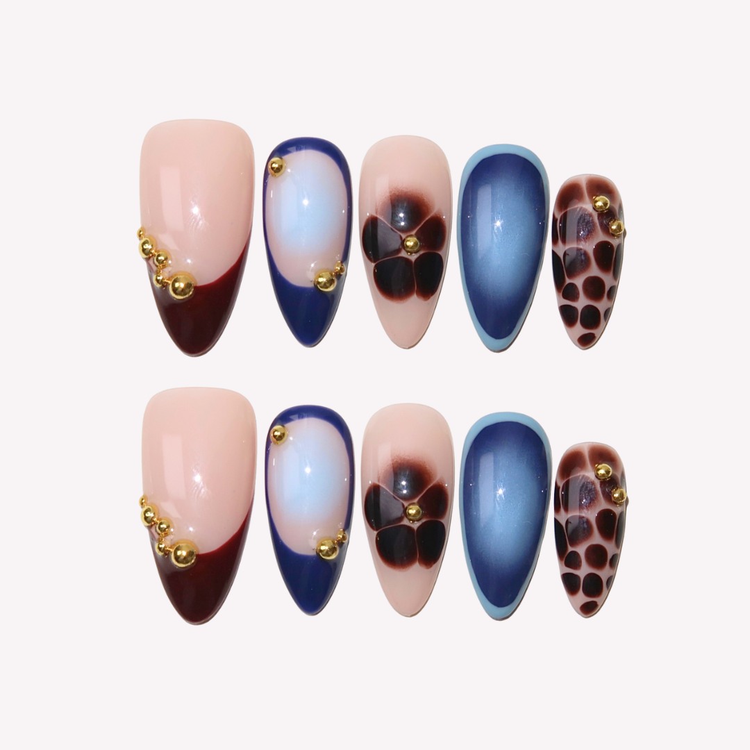 Embrace the allure of the night with Midnight Muse by HultyNail. This medium almond set combines deep maroon, rich navy blue, and playful floral designs, capturing the mystery and elegance of evening blooms. With a sleek cat-eye shimmer, tortoiseshell accents, and gold bead details, Midnight Muse brings a bold yet sophisticated edge to your style. Perfect for evening events or adding a touch of glamour to your everyday look, these press-on nails are your ultimate accessory for a chic, night-inspired vibe.