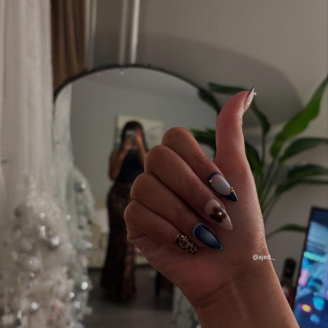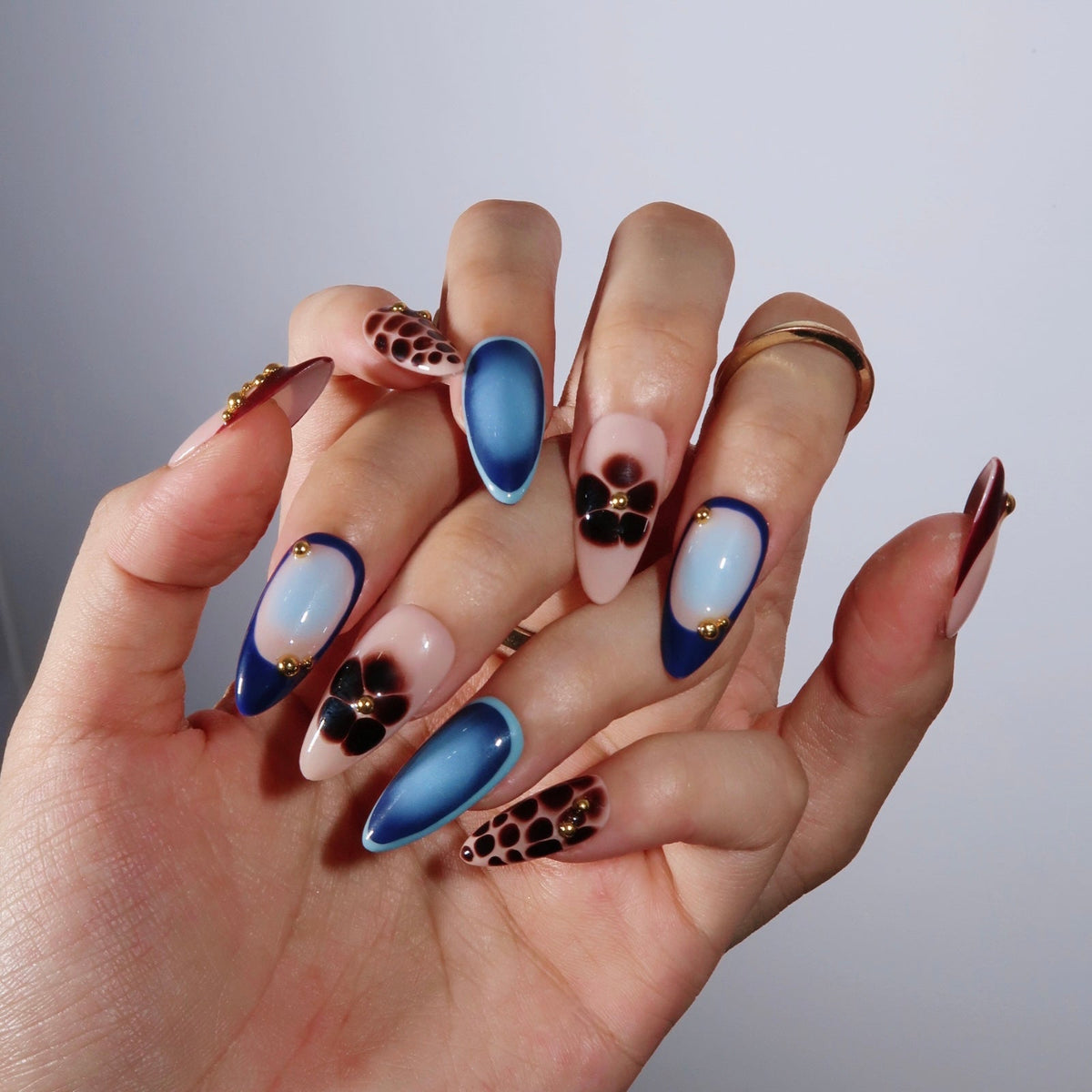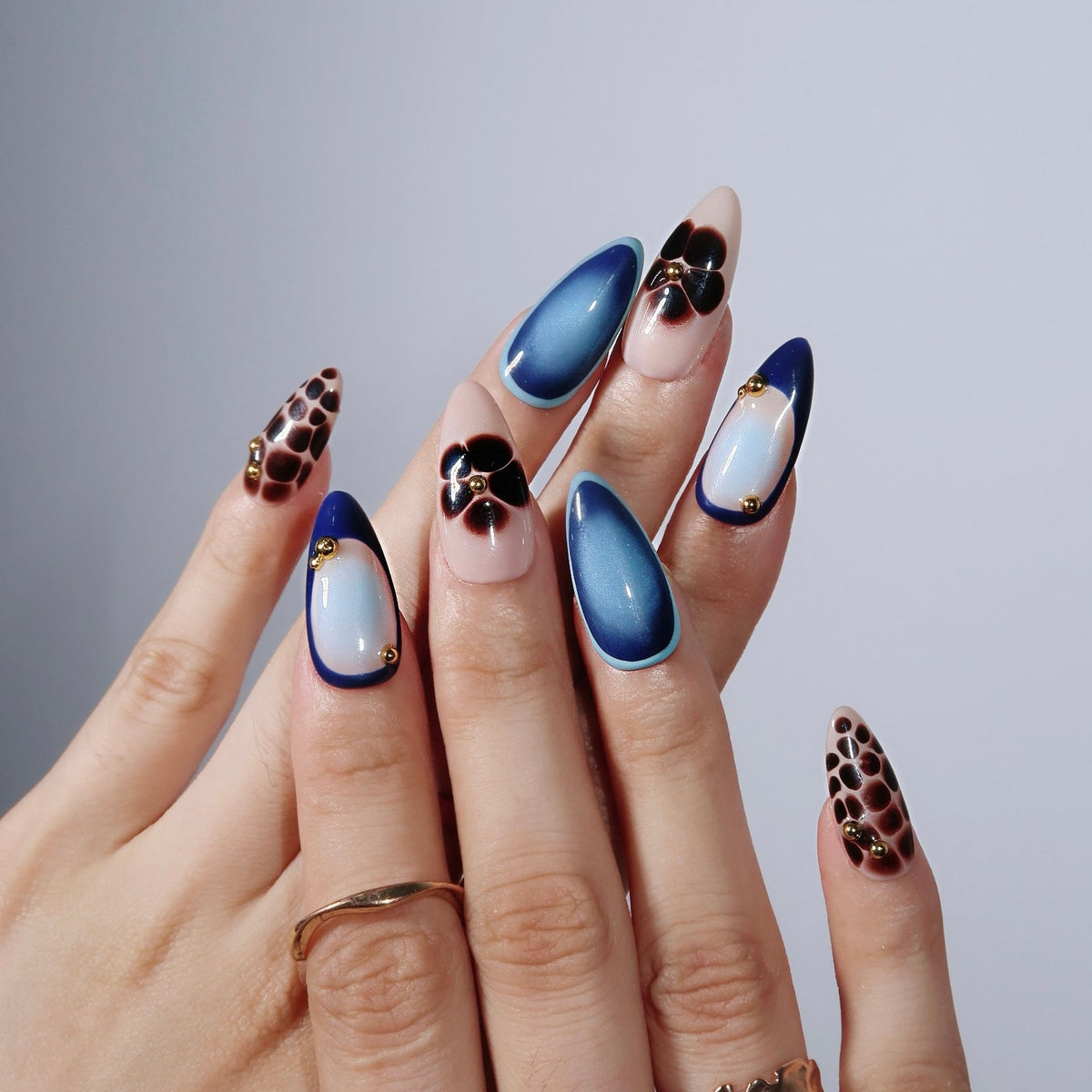 Embrace the allure of the night with Midnight Muse by HultyNail. This medium almond set combines deep maroon, rich navy blue, and playful floral designs, capturing the mystery and elegance of evening blooms. With a sleek cat-eye shimmer, tortoiseshell accents, and gold bead details, Midnight Muse brings a bold yet sophisticated edge to your style. Perfect for evening events or adding a touch of glamour to your everyday look, these press-on nails are your ultimate accessory for a chic, night-inspired vibe.