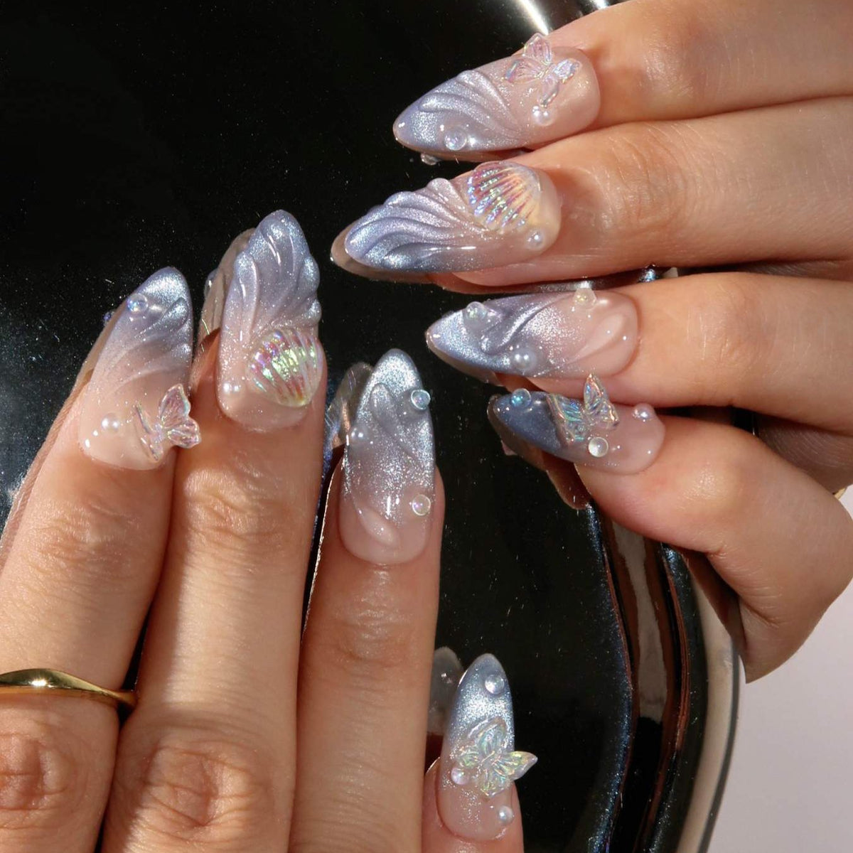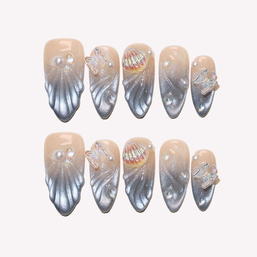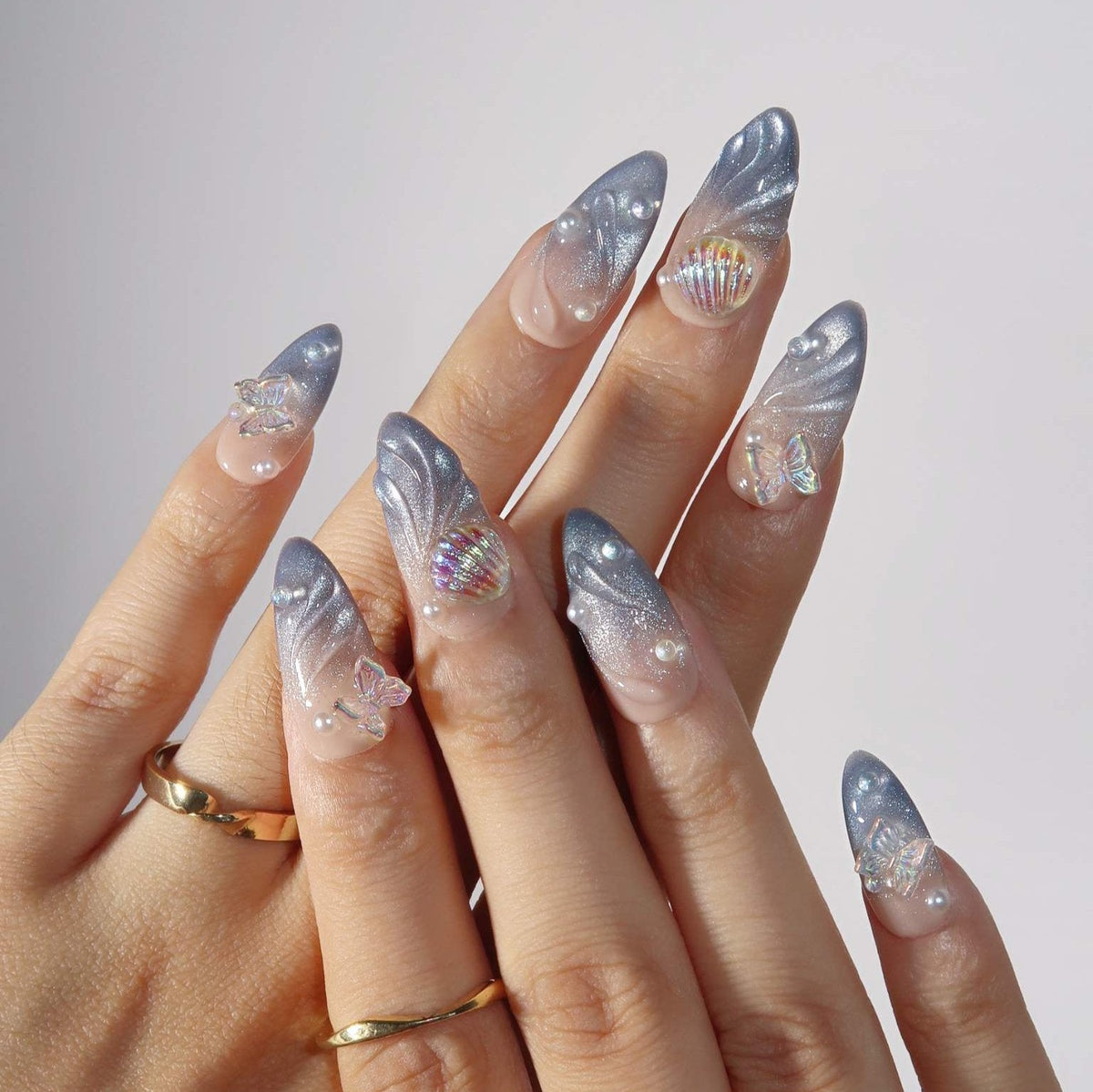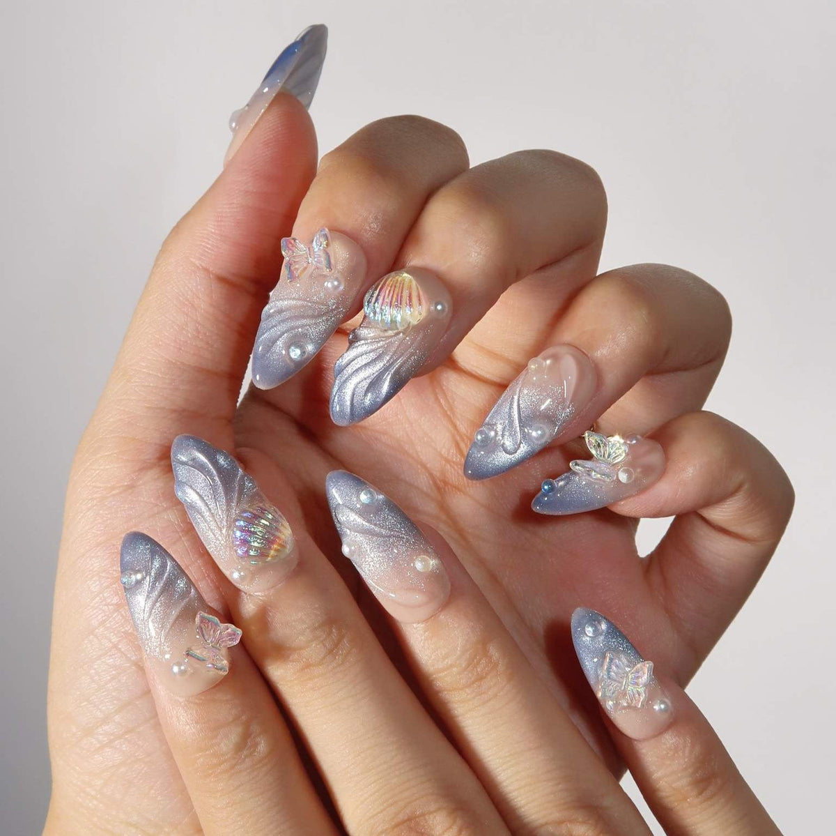 Transform your nails into a magical canvas with Starlit Fairytale Press-on Nails by HultyNail. Featuring a captivating silver cat-eye gradient that shimmers like stars in the night sky, this design brings a sense of wonder to your fingertips. Adorned with delicate pearls, enchanting butterfly accents, and charming seashell embellishments, these nails evoke the beauty of a dreamlike fairytale. Perfect for those who love to add a touch of fantasy and elegance to their look, Starlit Fairytale captures the essence of a mystical and elegant night.