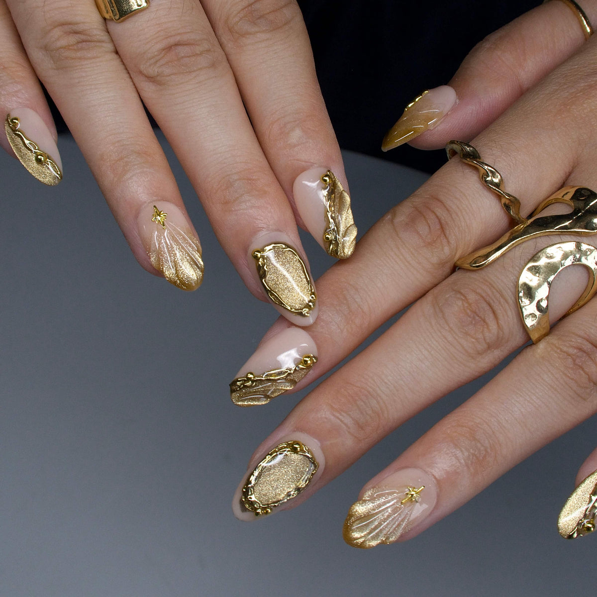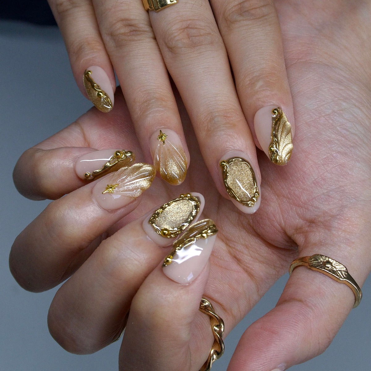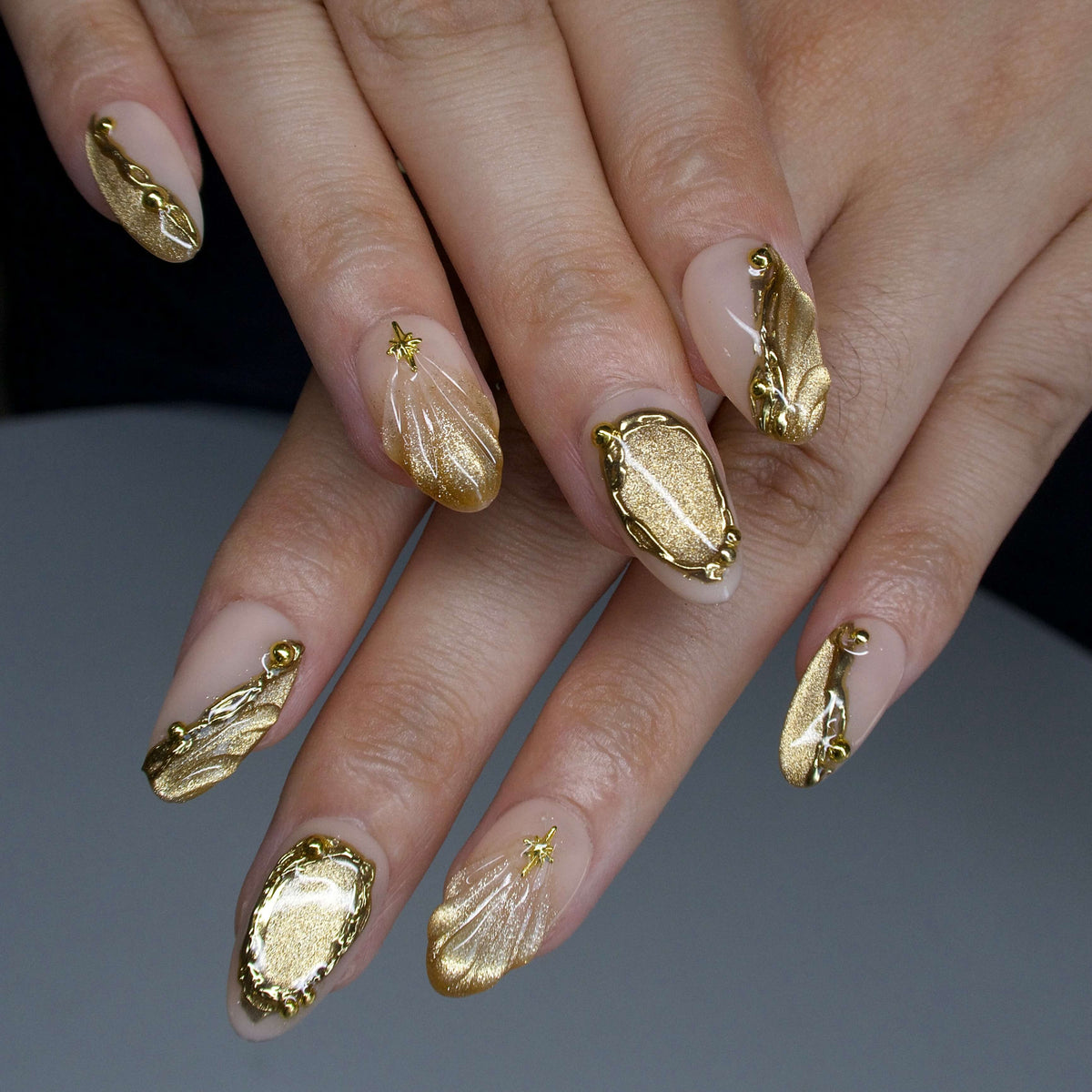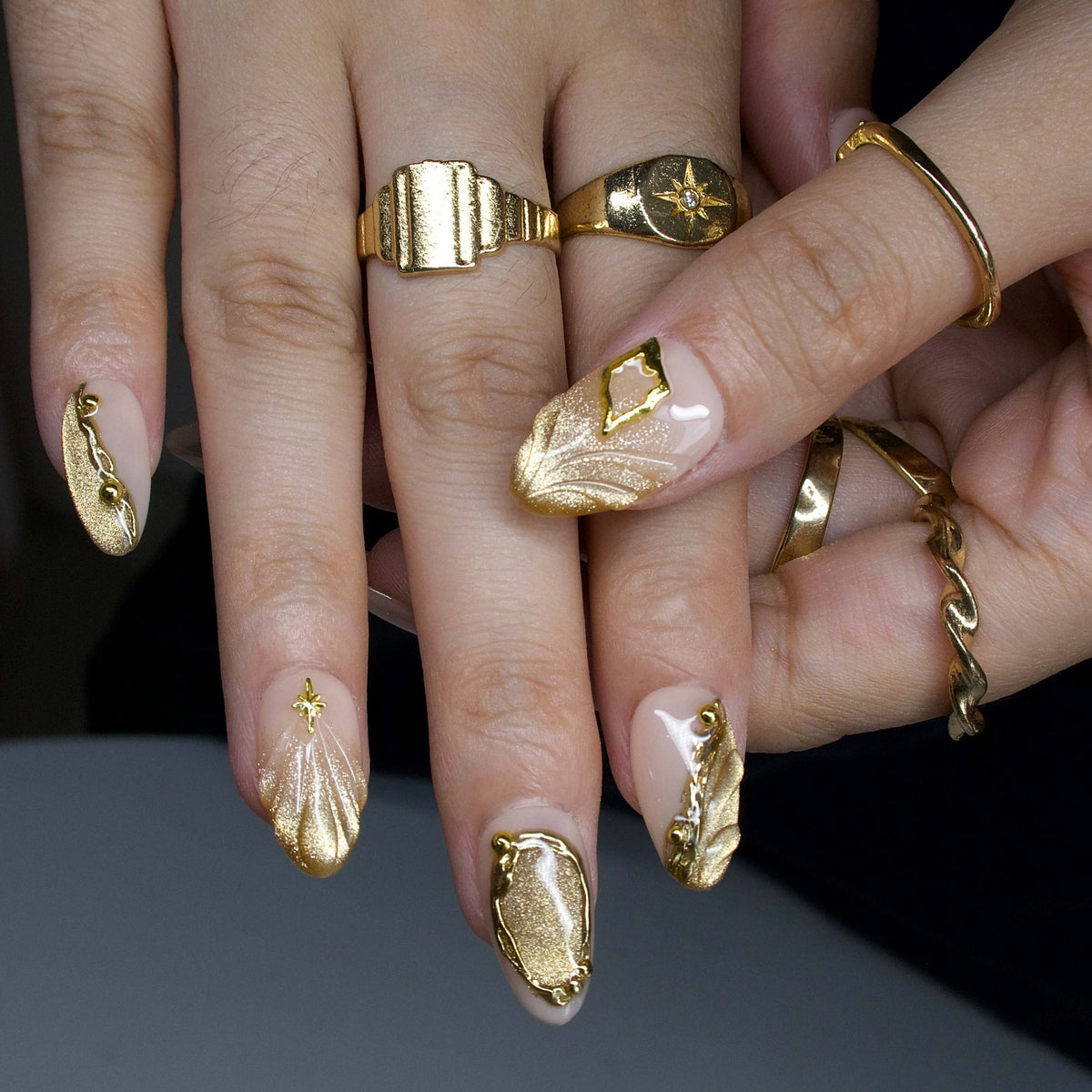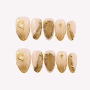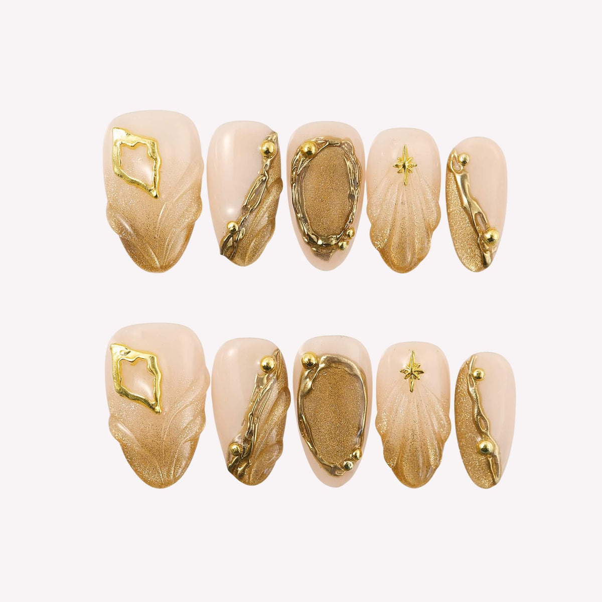 Artemis' Glint by hultynail draws inspiration from the grace and radiance of the goddess Artemis. The nails feature a soft, neutral palette reminiscent of moonlit sands, creating an understated yet elegant base. Delicate golden accents mimic the glint of moonlight, with intricate patterns that evoke a sense of celestial charm. Whether for a refined daytime look or an evening of festival, these press - on nails are a perfect blend of subtlety and luxury.