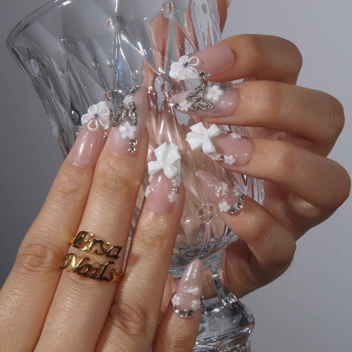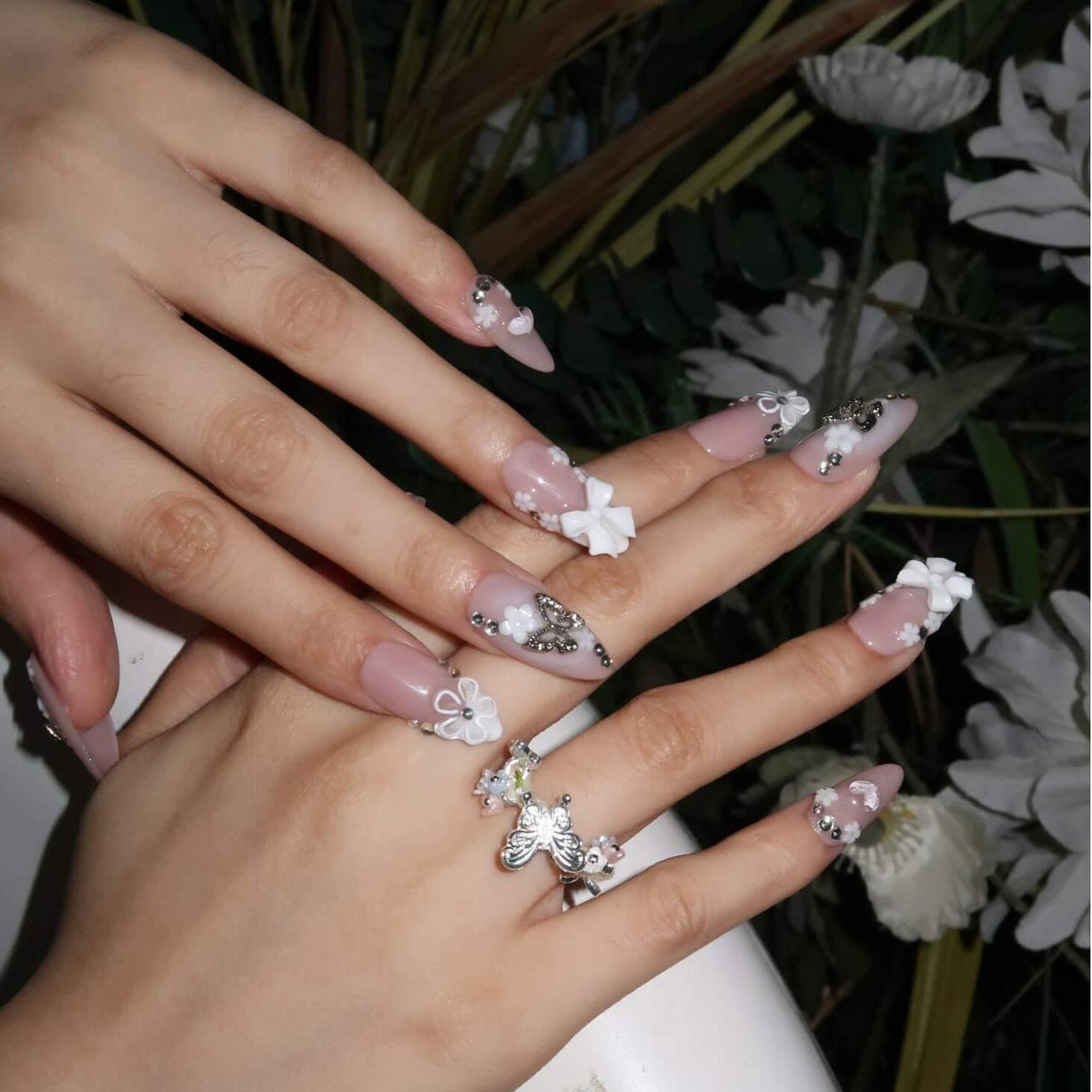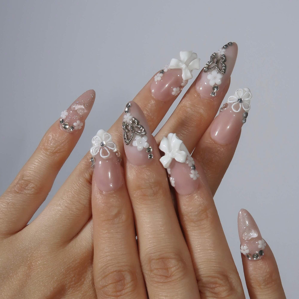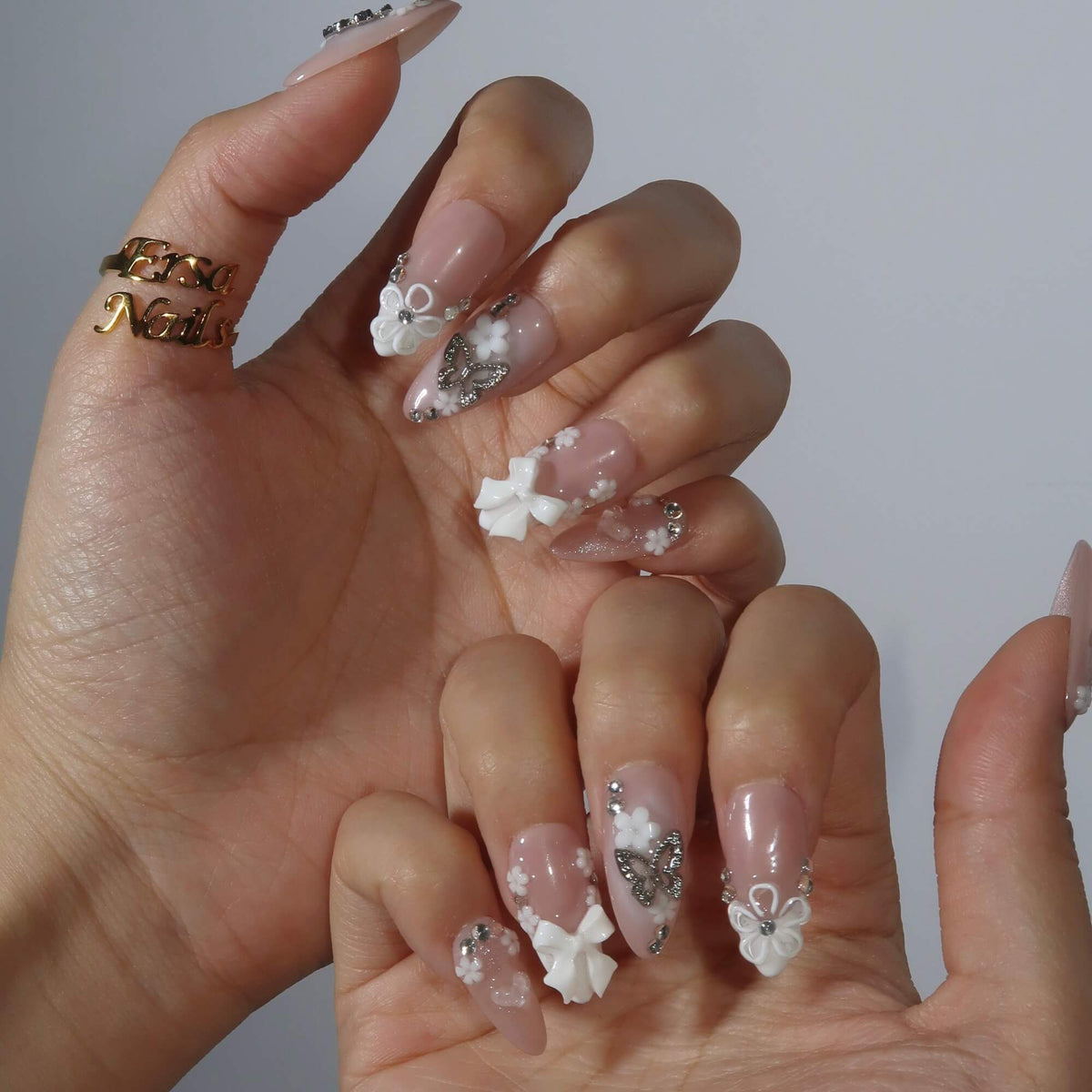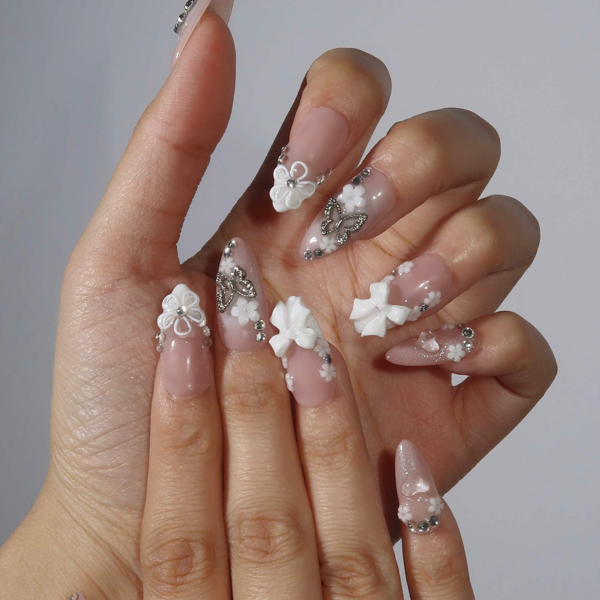 Embrace delicate elegance with Butterfly Kisses from Swara Nails. Featuring a soft nude base and a classic white French tip design, this set is adorned with 3D white floral accents and sparkling diamond embellishments. A playful touch of butterfly-shaped rhinestones adds a whimsical yet sophisticated flair, making Butterfly Kisses the perfect choice for those looking to add a refined, feminine charm to their look.