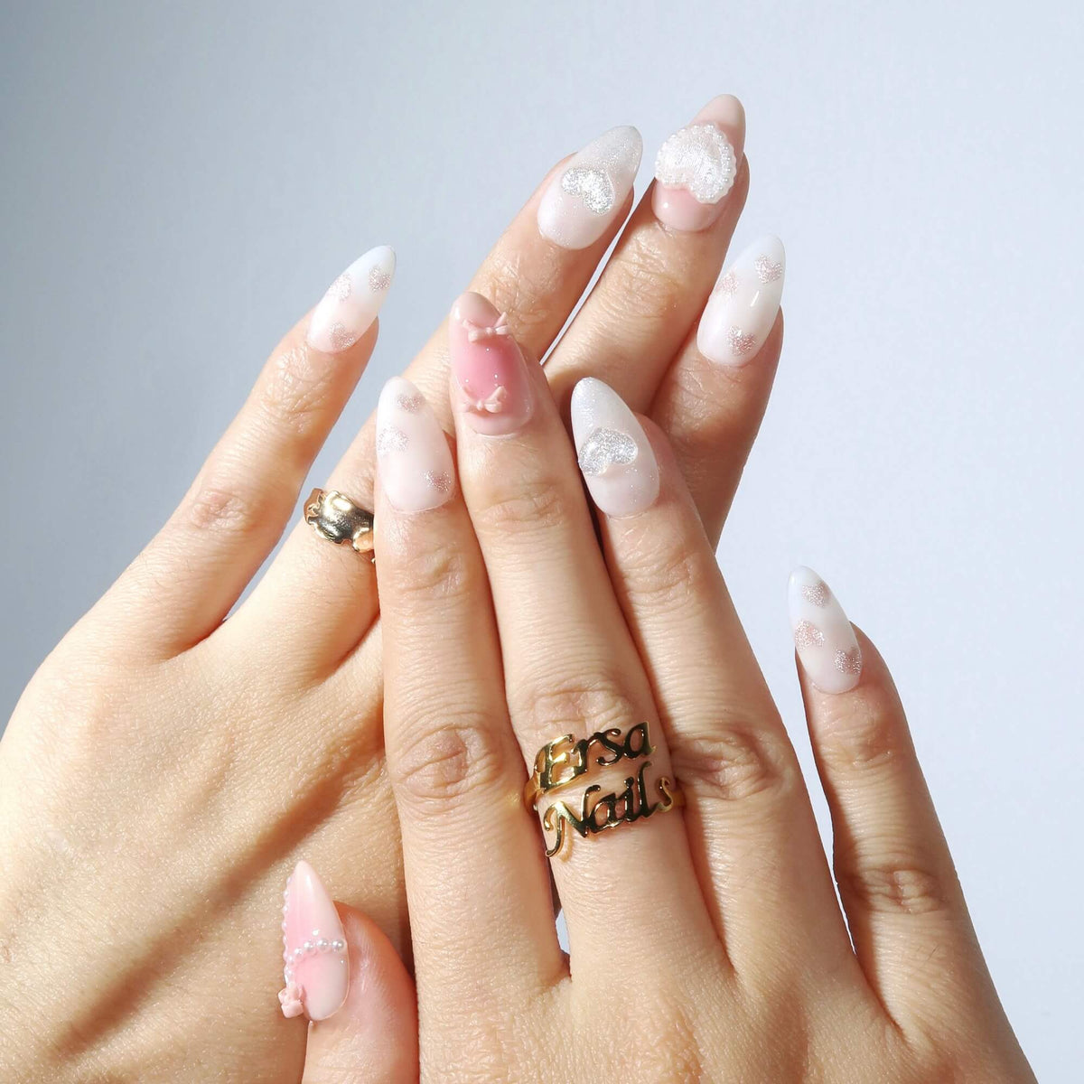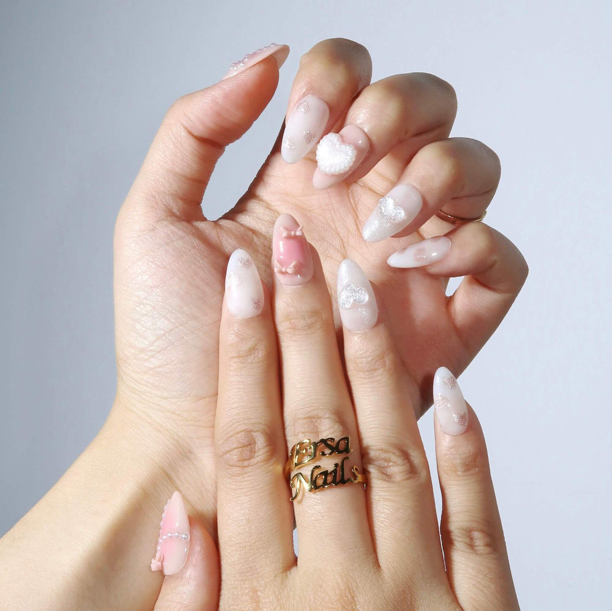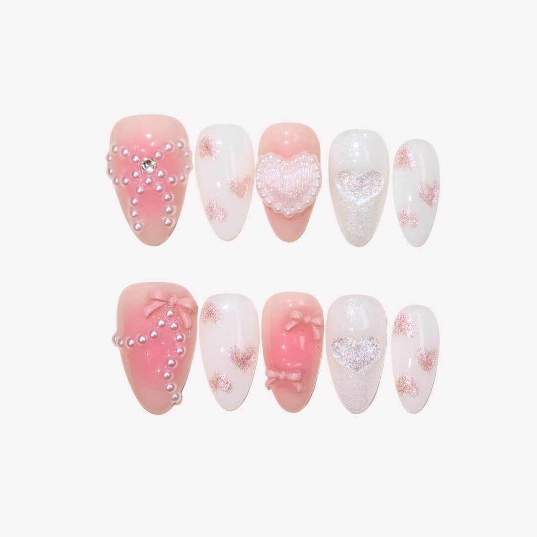 Embrace the softness of love with Cherished Heart by swara Nails, a delicate press-on nail set that radiates warmth and charm. Featuring a beautiful pink and white color palette, the soft pink aura design creates a dreamy effect, while heart patterns and exquisite pearl, heart, and bow embellishments add a touch of elegance. Perfect for those who cherish the beauty of sweet, heartfelt moments.