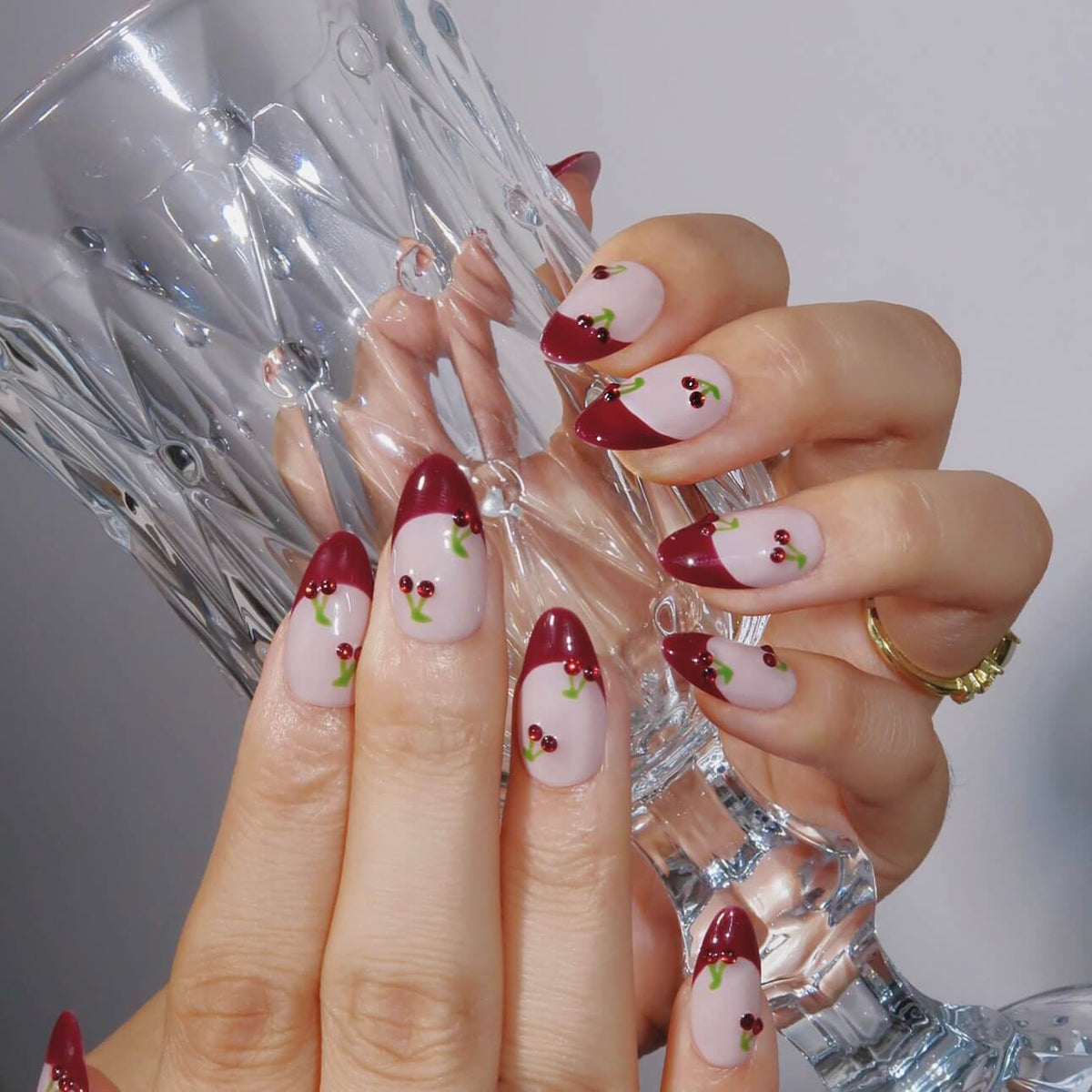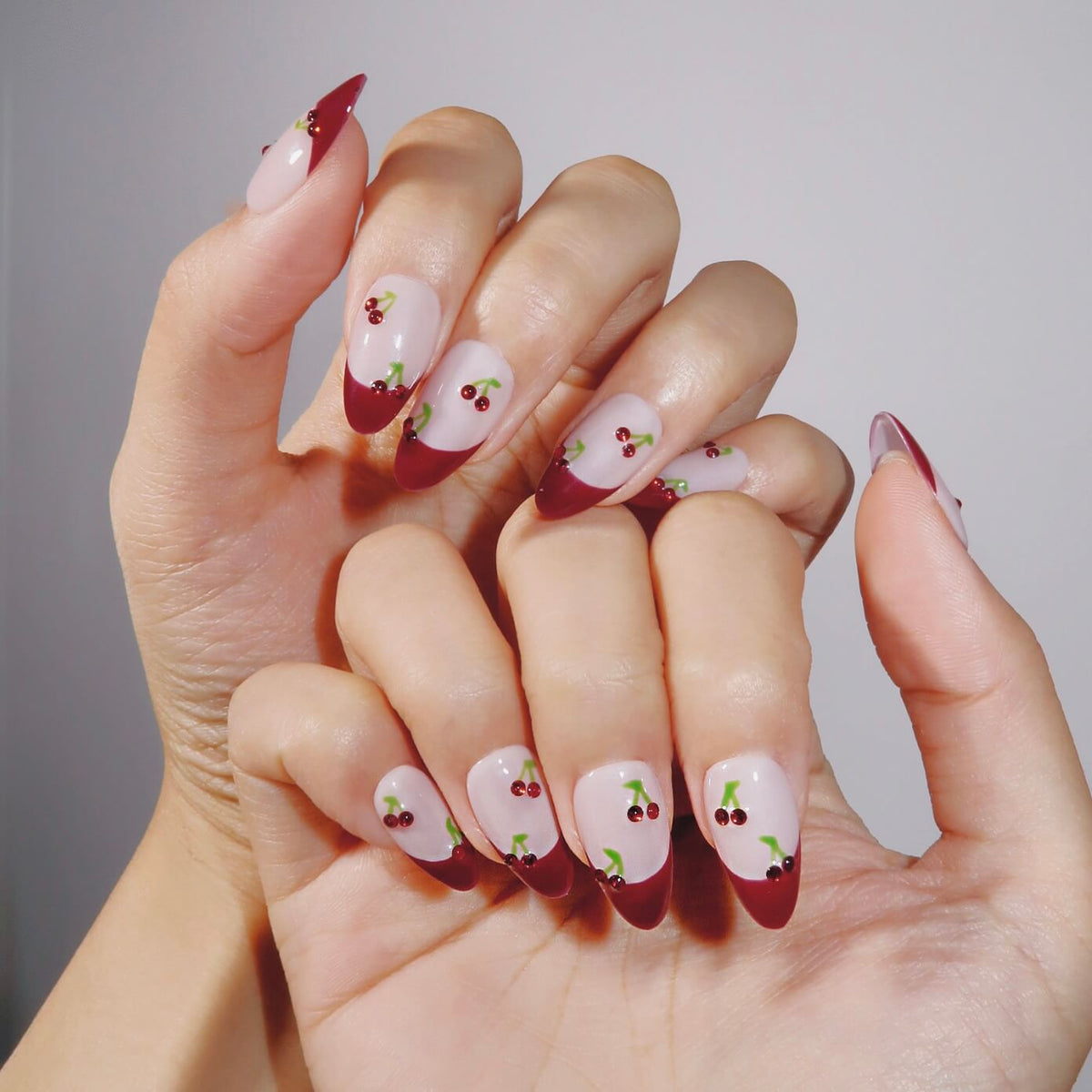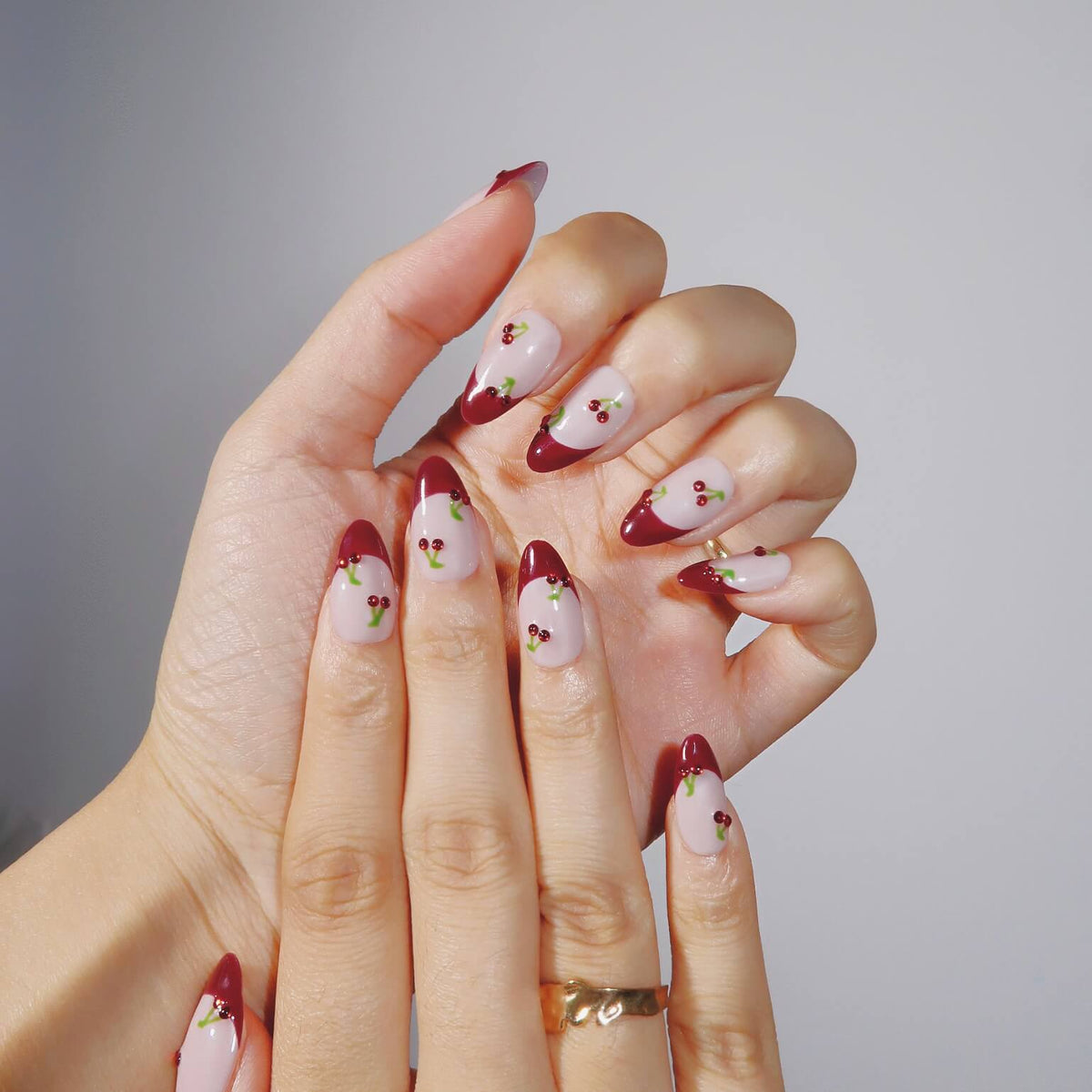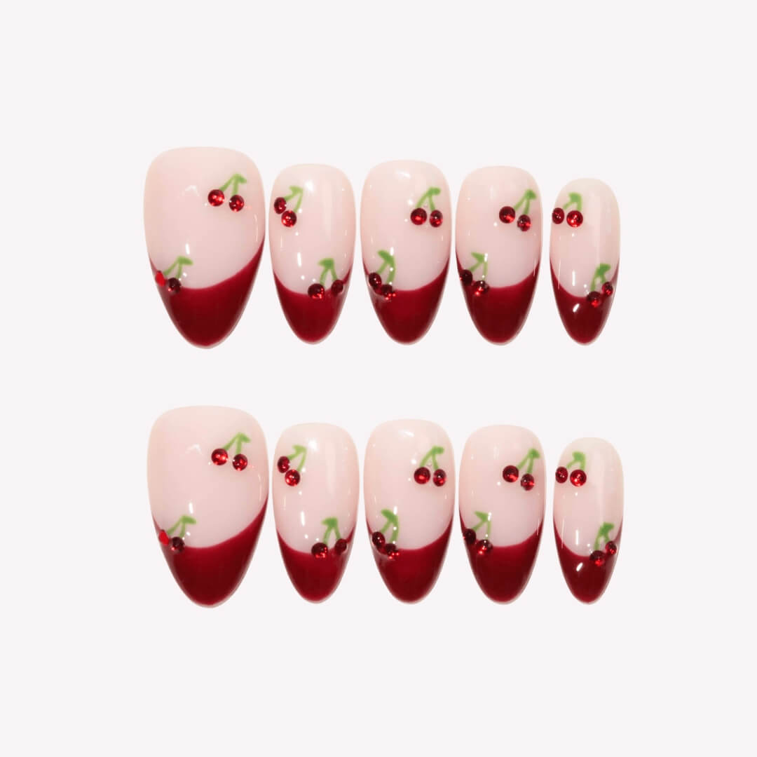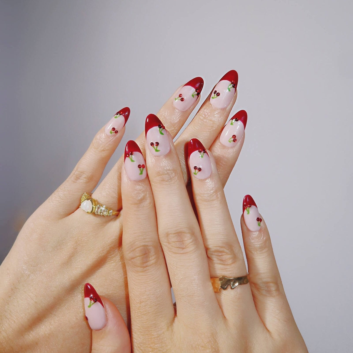 Cherry on Top by HultyNail brings a playful yet chic vibe to your nails. A nude base is complemented by bold red French tips, while charming cherry embellishments add a whimsical touch. Perfect for those who enjoy a fun pop of color with a refined twist, Cherry on Top offers a fresh, youthful design that stands out with sophistication.