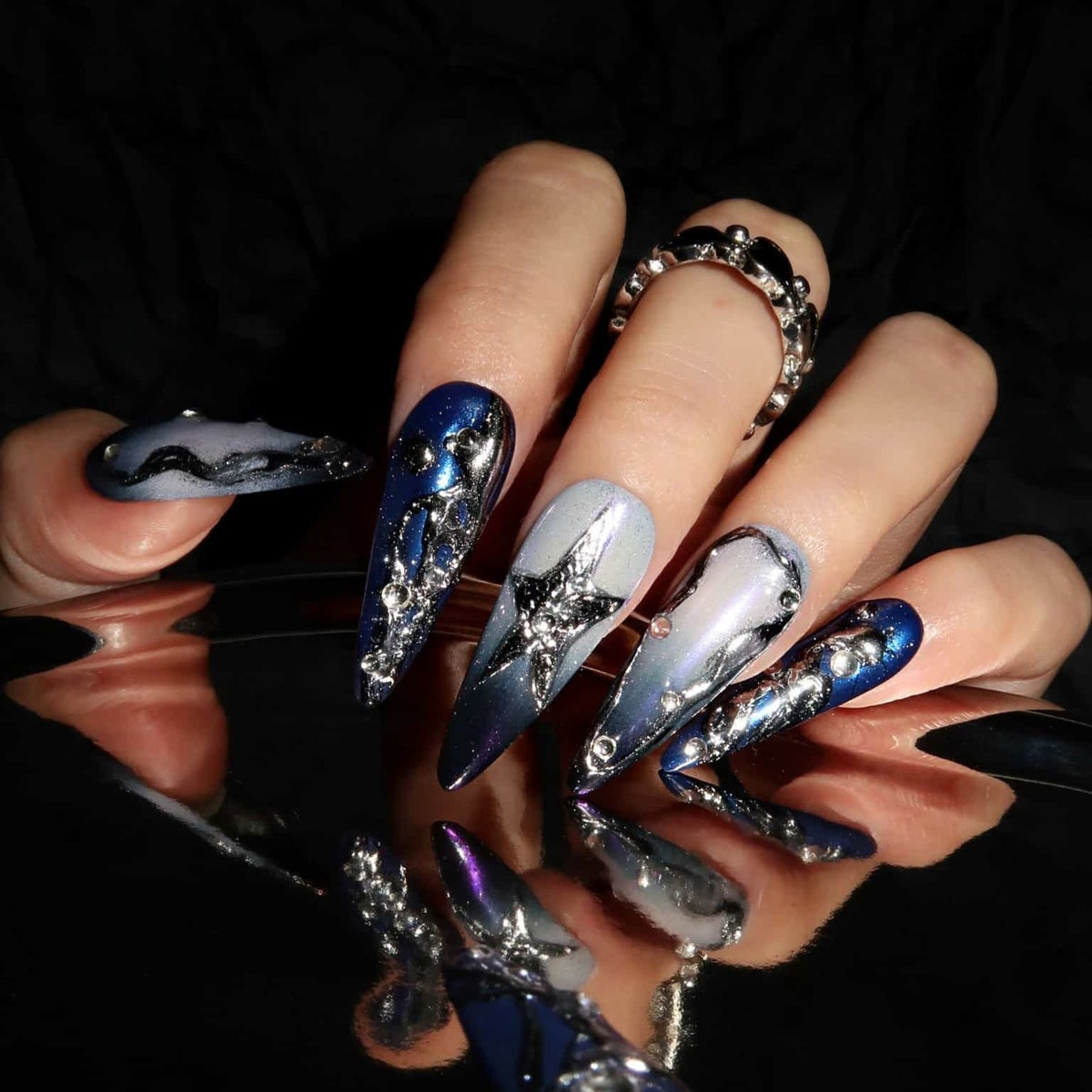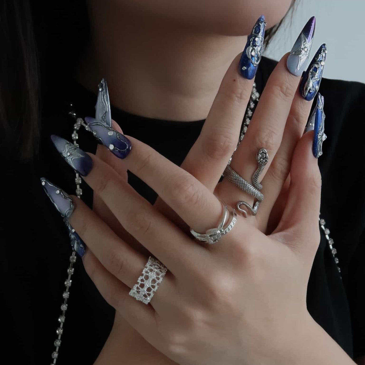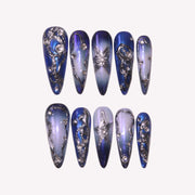 Glide through the celestial dance with Cosmic Girl press on nails, where deep space blues and twilight purples blend seamlessly, evoking the majestic tapestry of the cosmos. Adorned with rhinestones that glimmer like stars in the firmament, each nail is a fragment of the universe waiting to be explored. These nails are not just accessories; they're a tribute to the galactic wonders above, perfect for anyone who dreams of starlit skies and wishes to carry the sparkle of the stars with them.