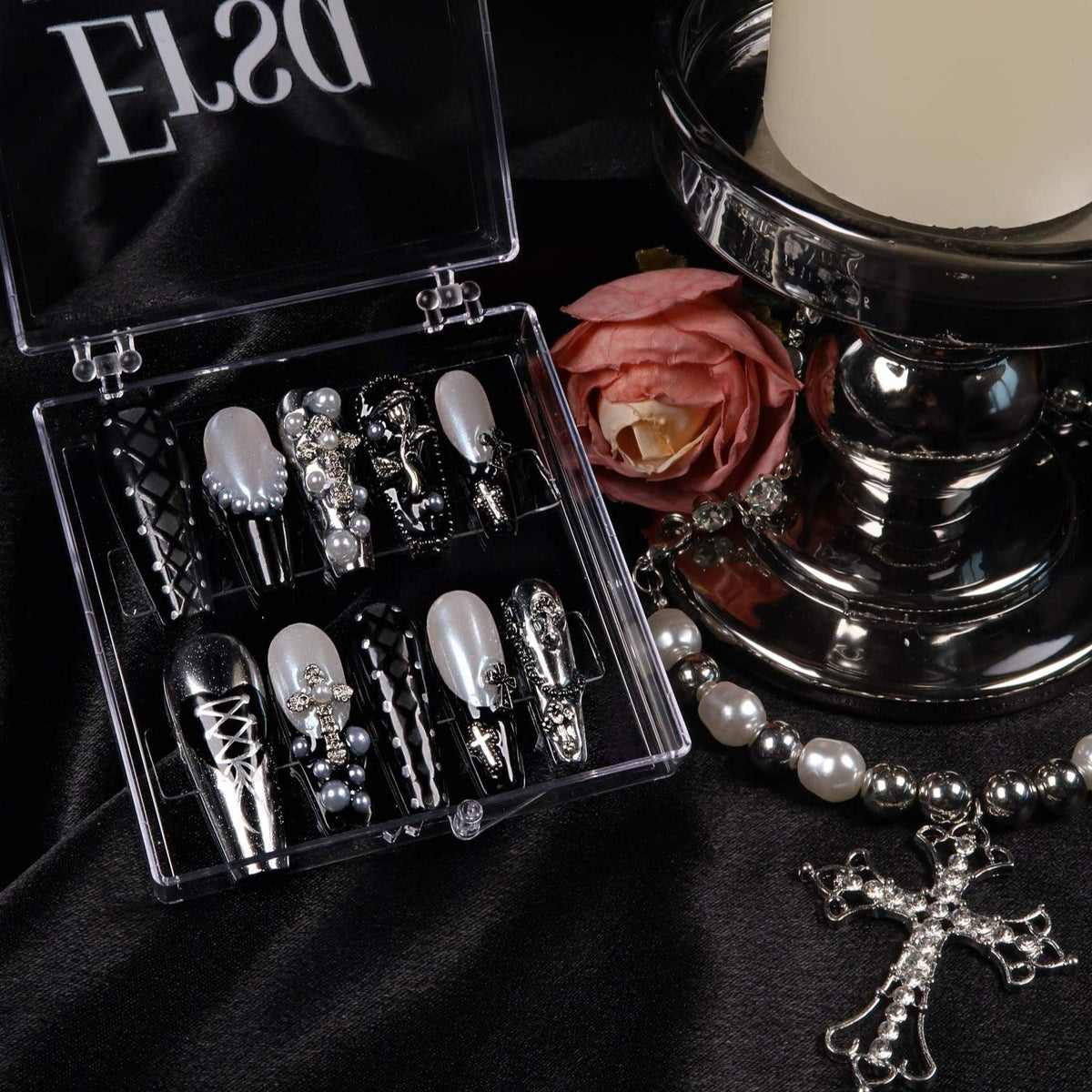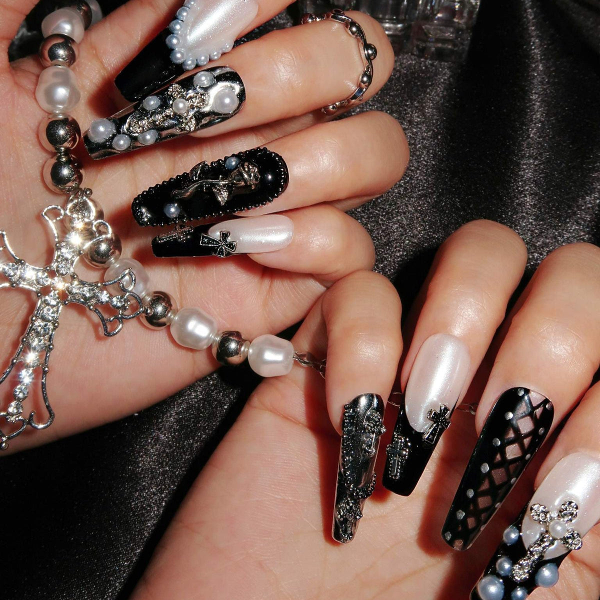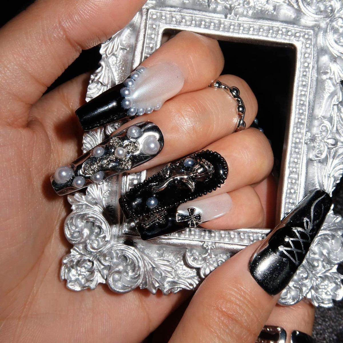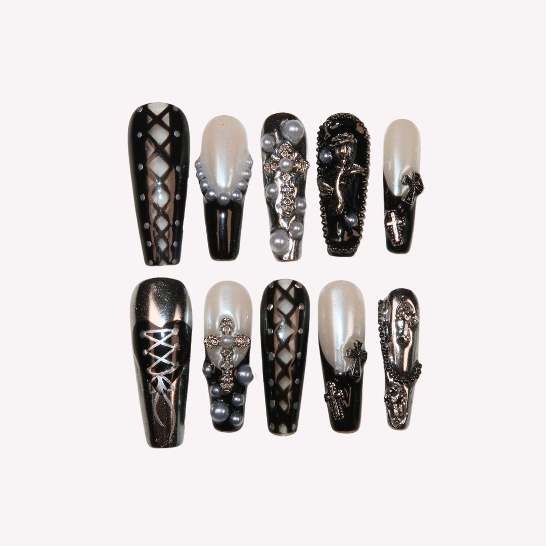 Embrace the sophistication of artistic expression with Swara Nails' Dark Ballerina set. This set of press-on nails is a canvas of creativity, featuring a monochromatic symphony of black and white hues, adorned with splashes of silver that bring a refined edge to your look. Each nail is a work of art, boasting unique patterns that range from bold geometric cuts to subtle, intricate designs, all unified by a palette that speaks to the connoisseurs of high fashion. Accents of pearl and metallic embellishments add a layer of luxury, transforming your nails into jewels of modern sophistication. Perfect for fashion-forward events or adding an artistic flair to your daily wardrobe, Dark Ballerina is not just a set of nails—it's wearable art that epitomizes elegance with an edge.