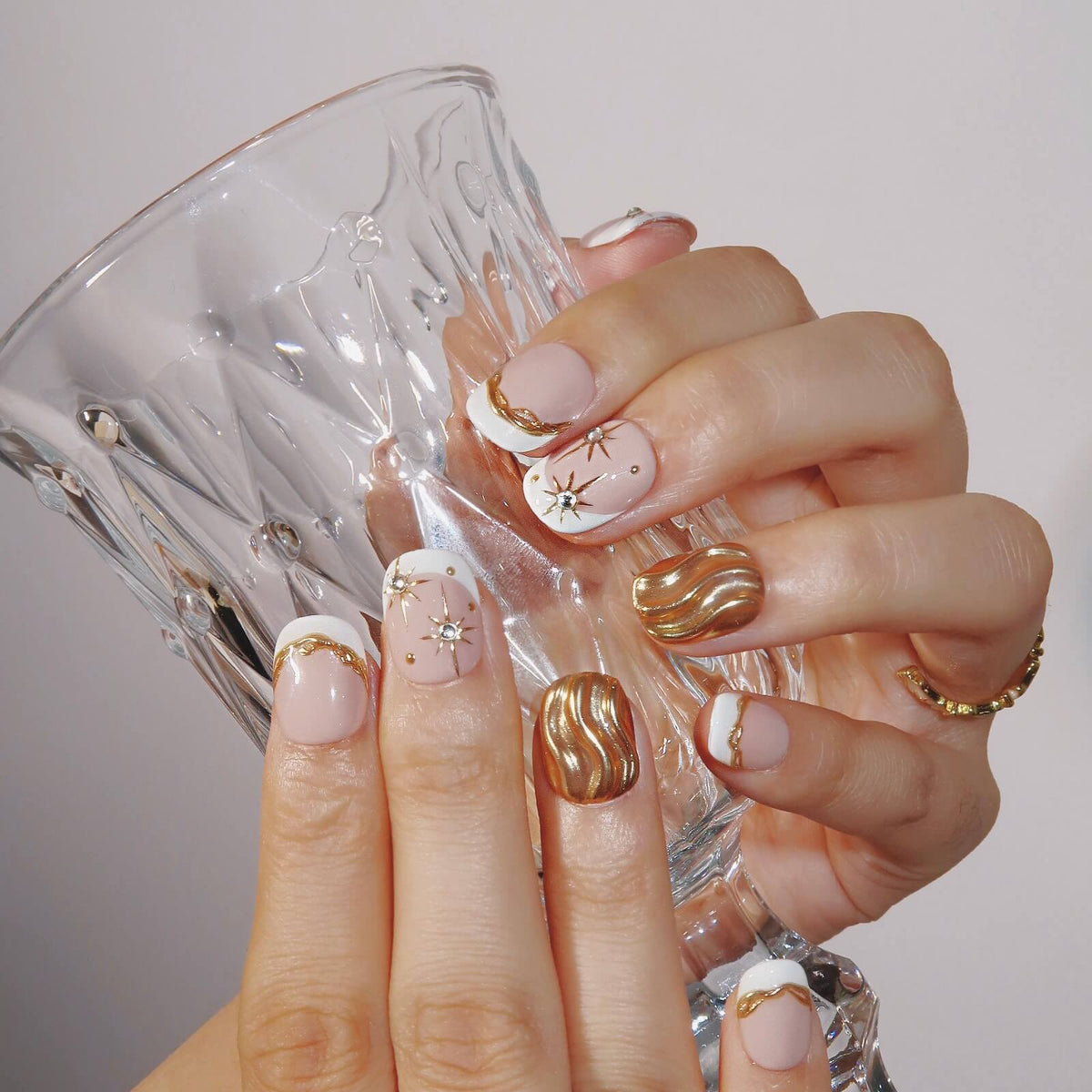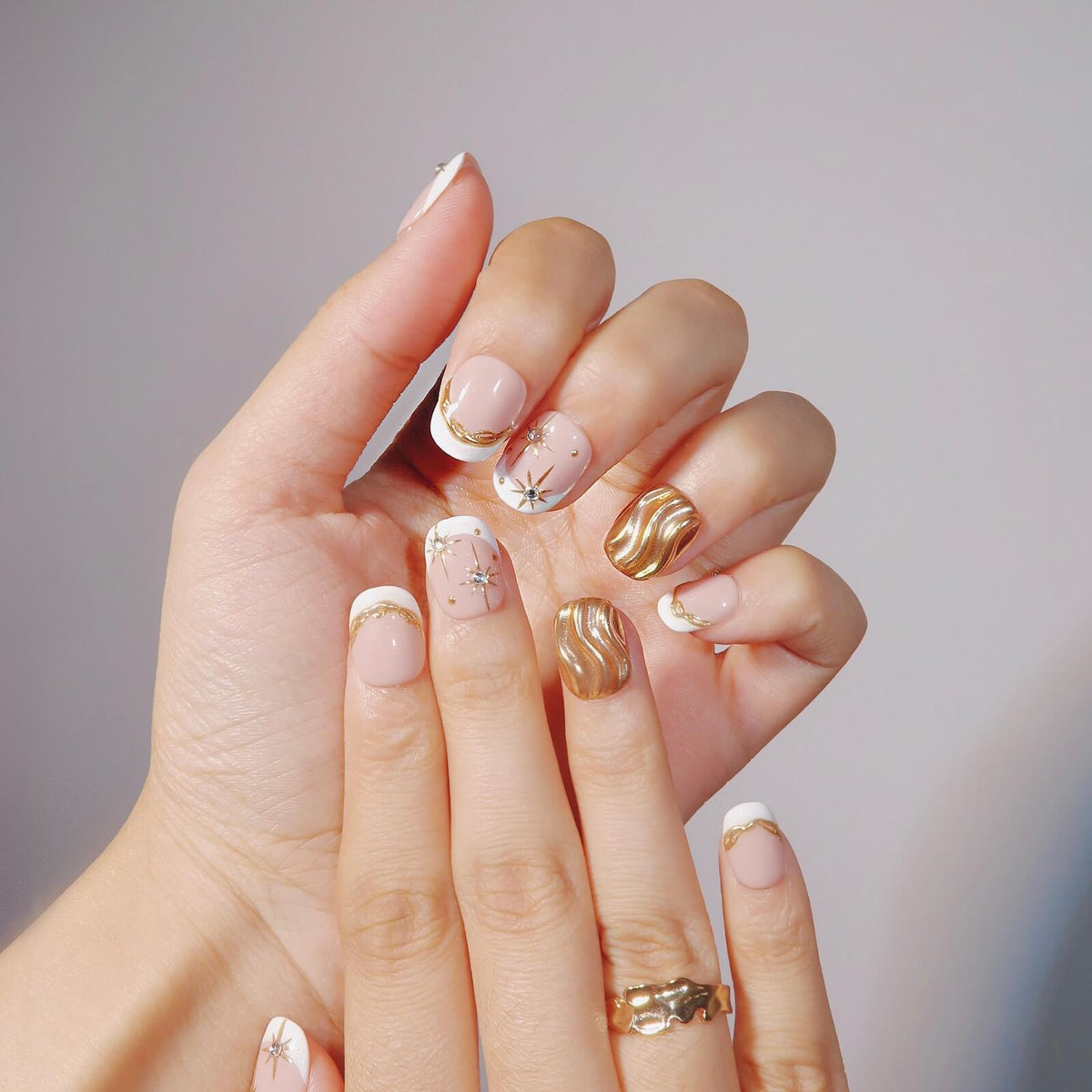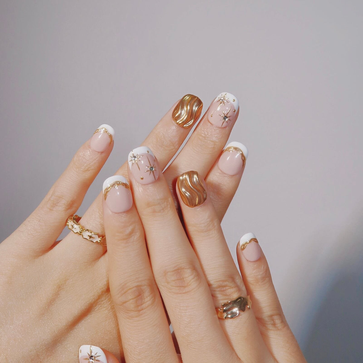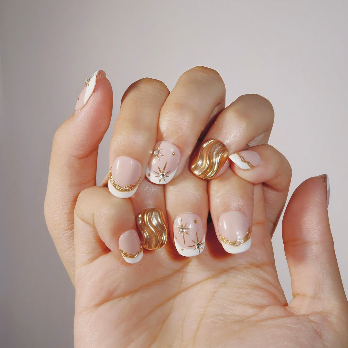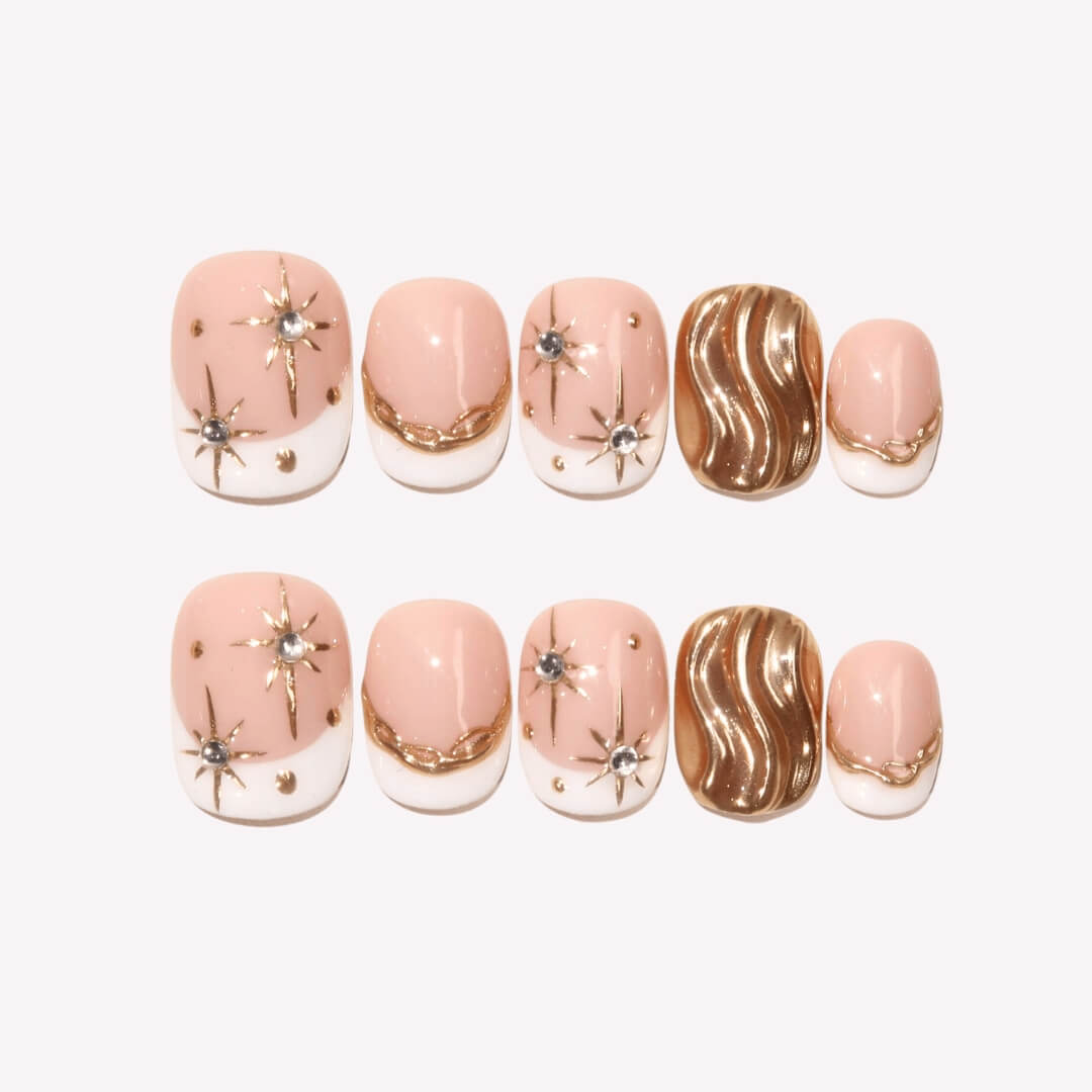 Illuminate your nails with the celestial elegance of Divine Glow from HultyNail. This exquisite set features a nude base with crisp white French tips, enhanced by delicate gold lines that add a touch of luxury. Sparkling rhinestones and whimsical star patterns complete the design, creating a look that's both radiant and enchanting. Divine Glow is the perfect choice for those seeking a refined, starry-inspired manicure that shines with sophistication and charm.