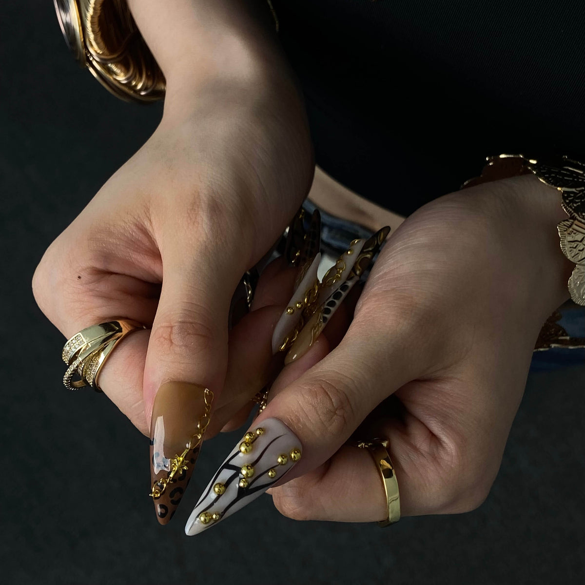 Unleash your wild side with Express Yourself from Swara Nails. These press-on nails feature a brownish nude base with a bold French tip and leopard print accents, finished with gold beads and metallic charms. A fierce, festival-ready look that’s all about confidence and attitude.
