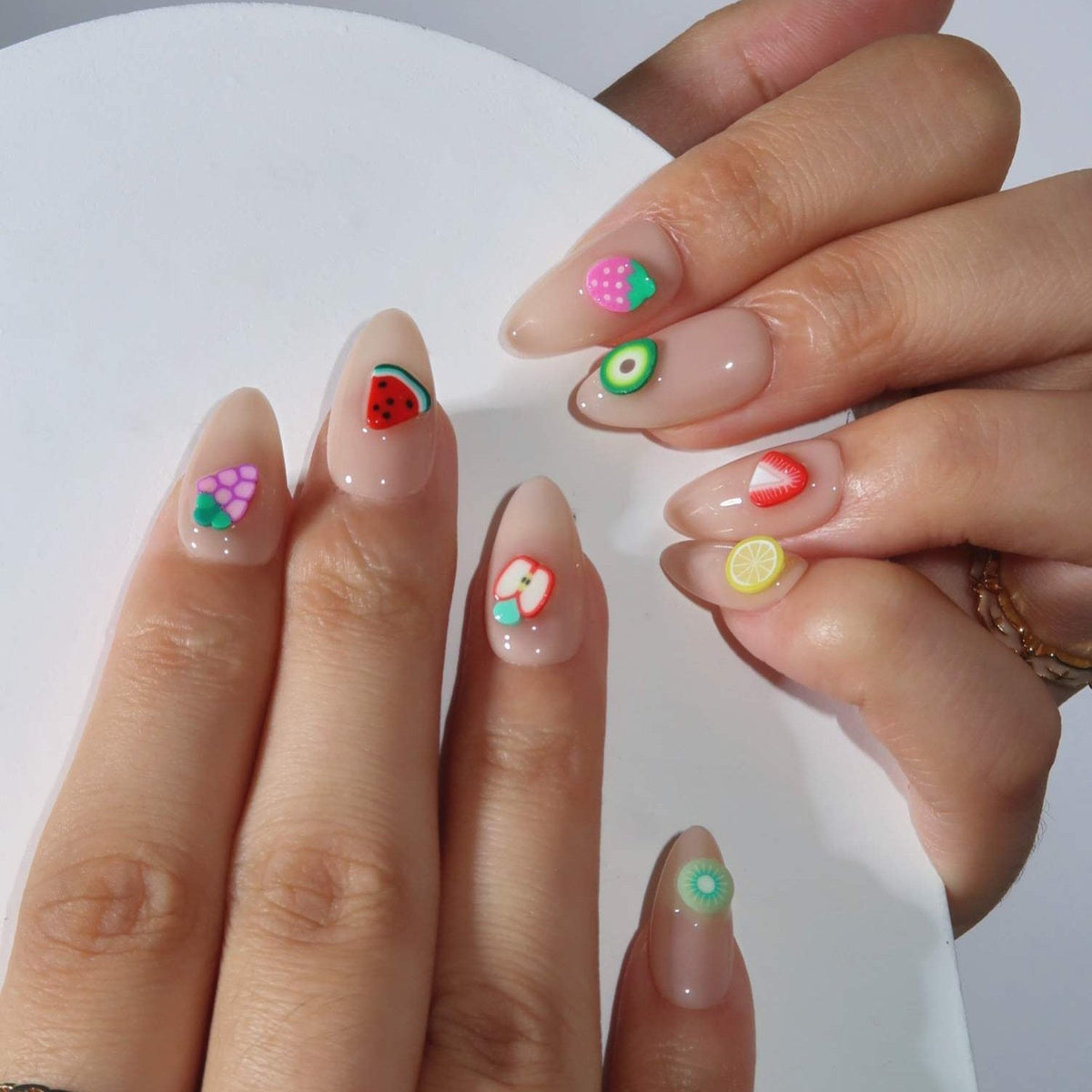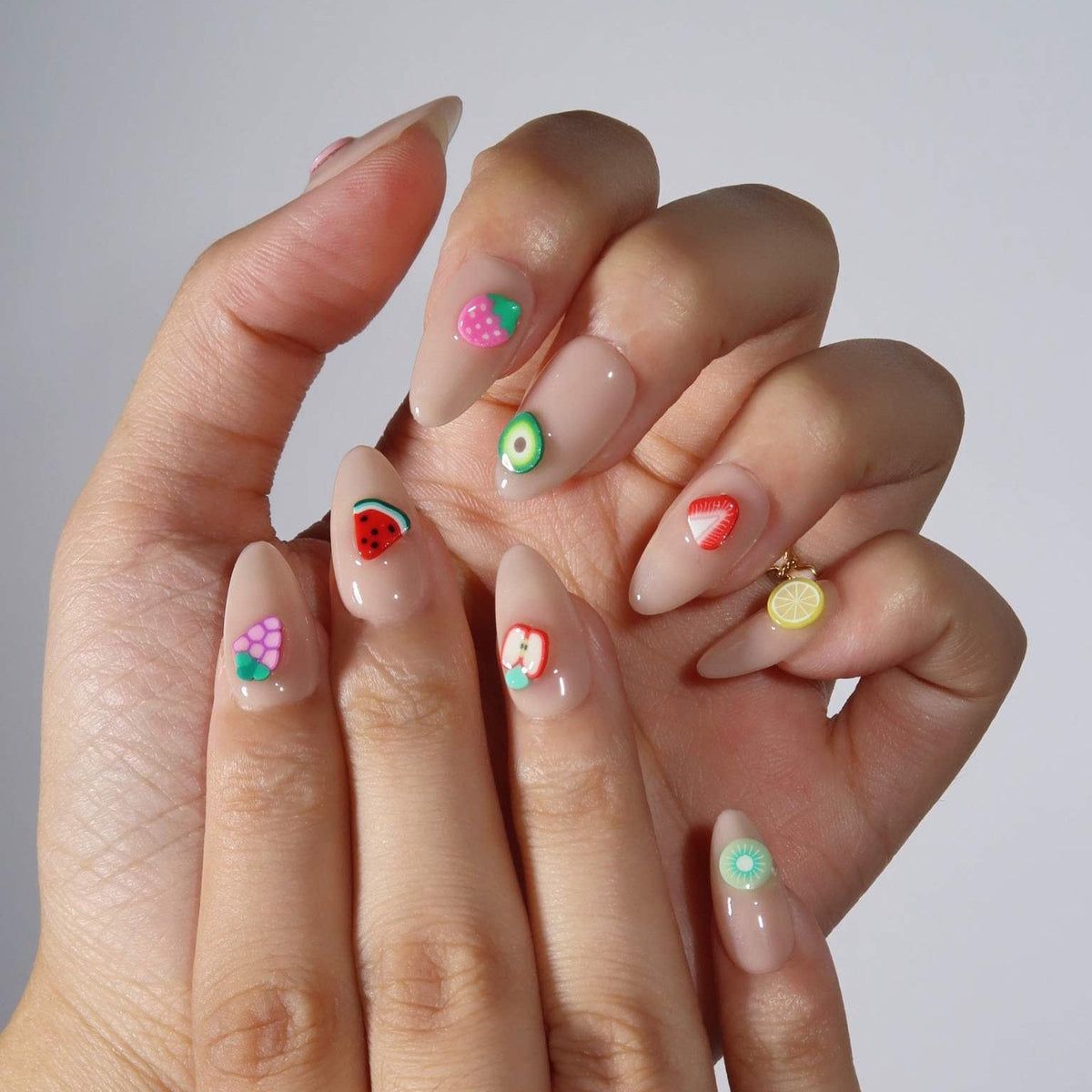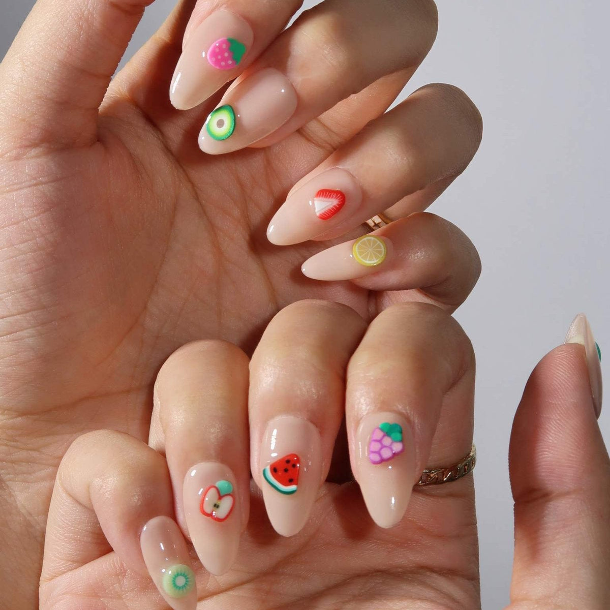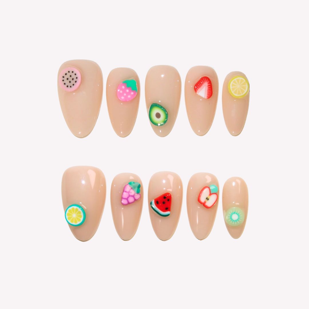 Add a playful twist to your style with Fruit Candy Press-on Nails by HultyNail. Featuring a soft nude base, this fun and fresh design is sprinkled with an assortment of vibrant fruit accents, bringing a burst of sweetness to your fingertips. Perfect for those who love a unique and cheerful look, Fruit Candy nails are your go-to for capturing the essence of summer and adding a touch of fruity fun to any outfit.