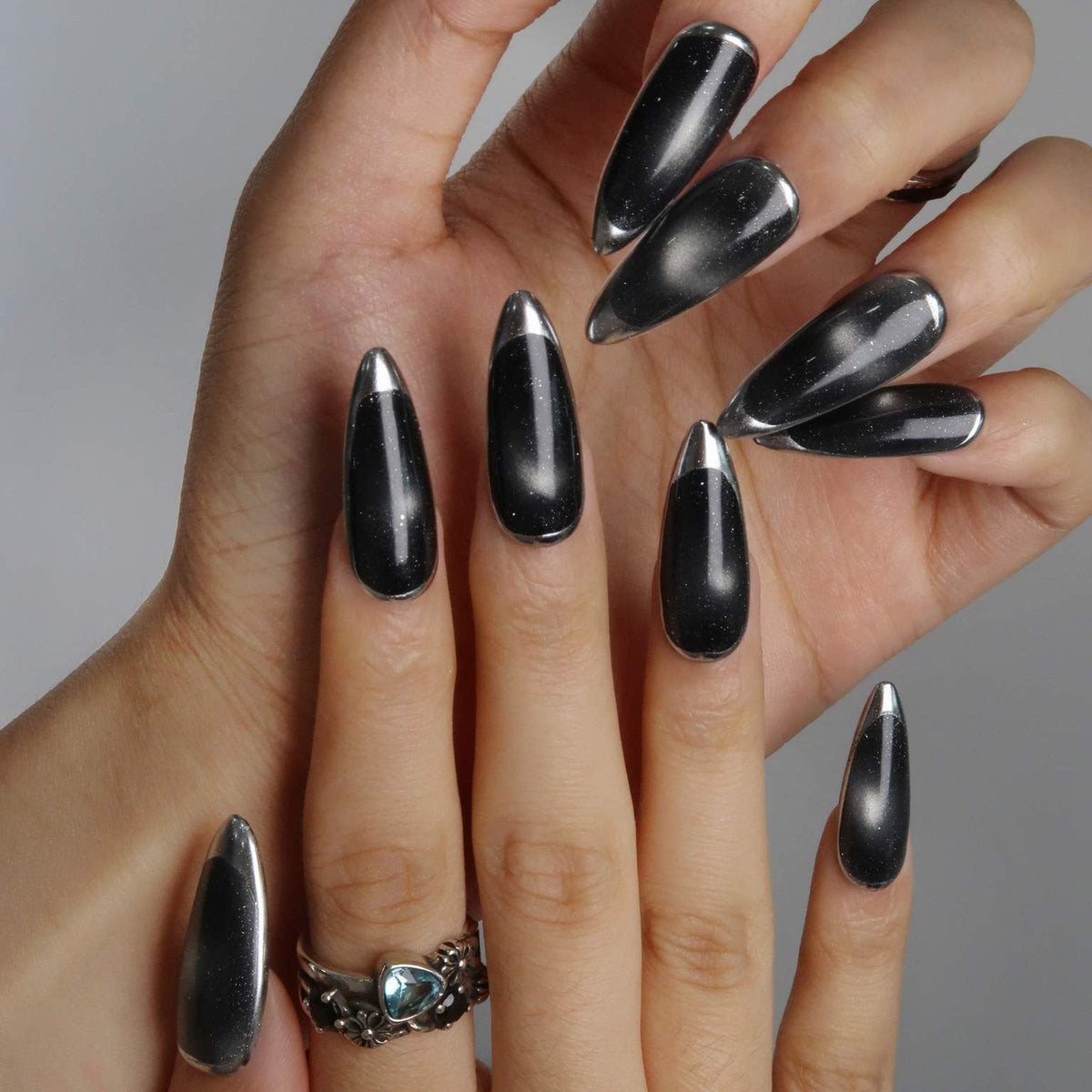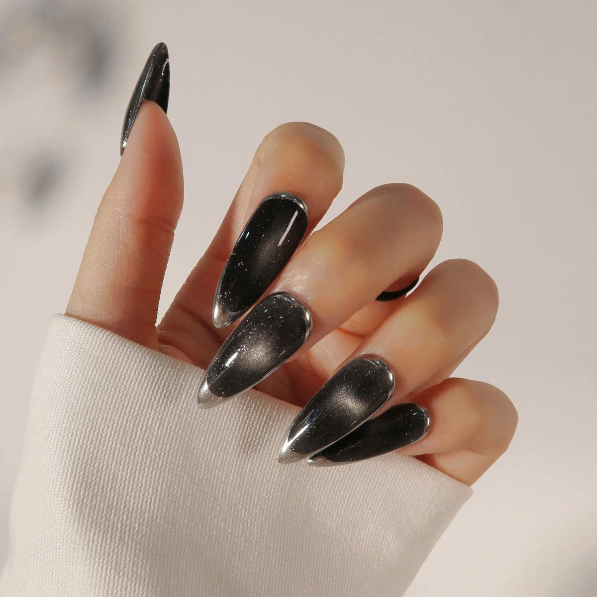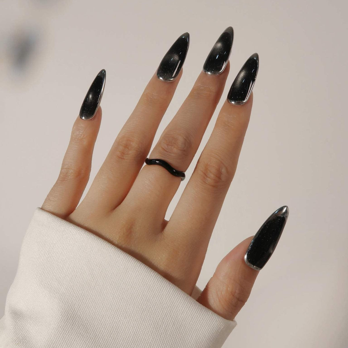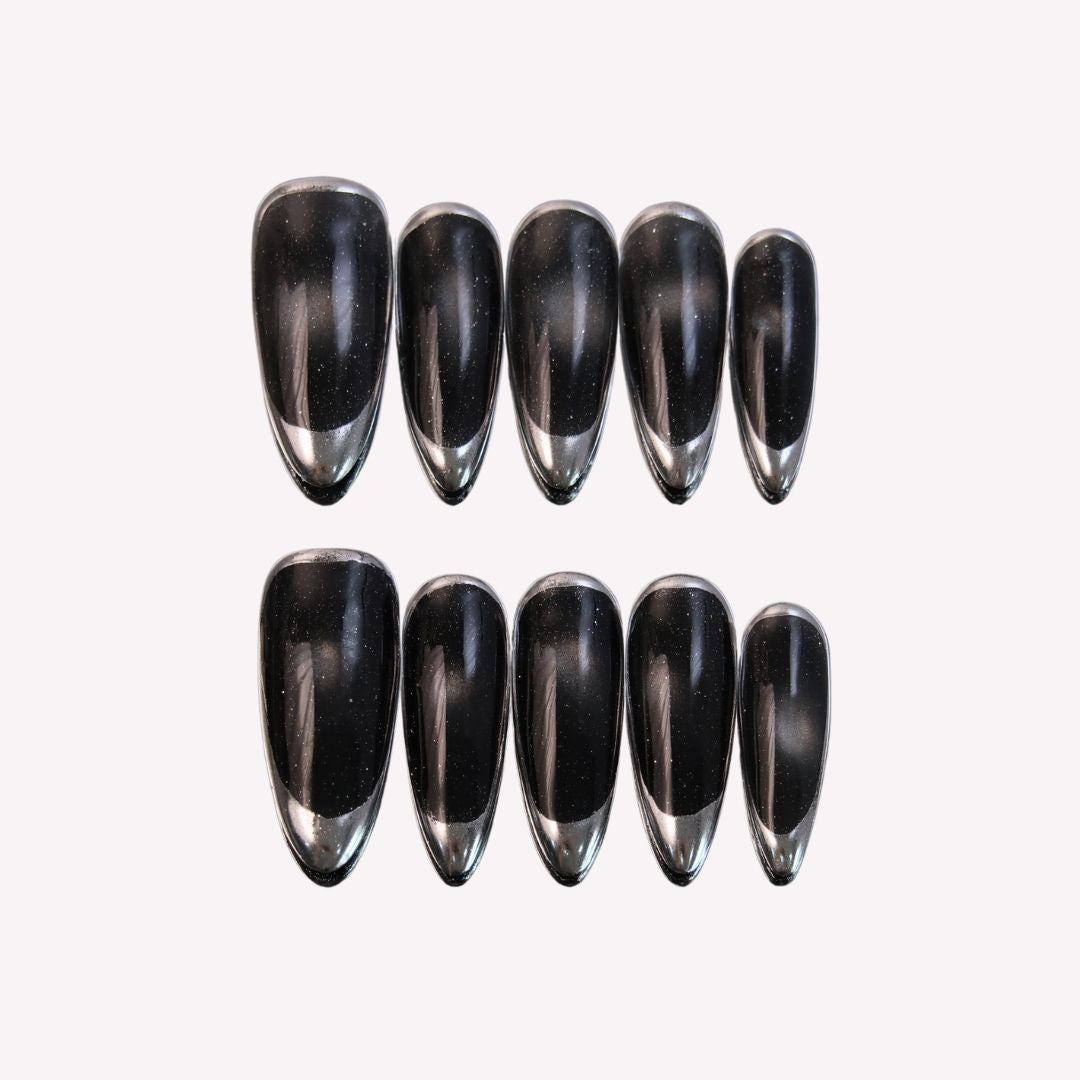 Embrace the enigmatic charm of the cosmos with HultyNail' Galaxy press-on nails, a set designed to mirror the vast and infinite beauty of the universe. These sleek, glossy black nails capture the essence of the night sky, with subtle speckles that mimic the distant twinkle of stars. Each nail is a portal to the stars, with a deep, opaque base that gives way to a light-reflective finish, creating an effect of depth and space that's as boundless as the galaxy itself. Perfect for those who wish to make a bold, sophisticated statement, Galaxy nails are your fingertips’ voyage into the depths of space, marrying simplicity with the profound allure of the night sky.