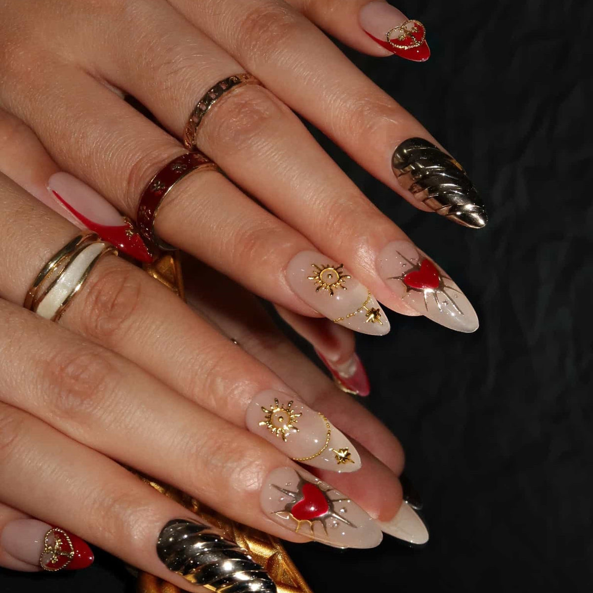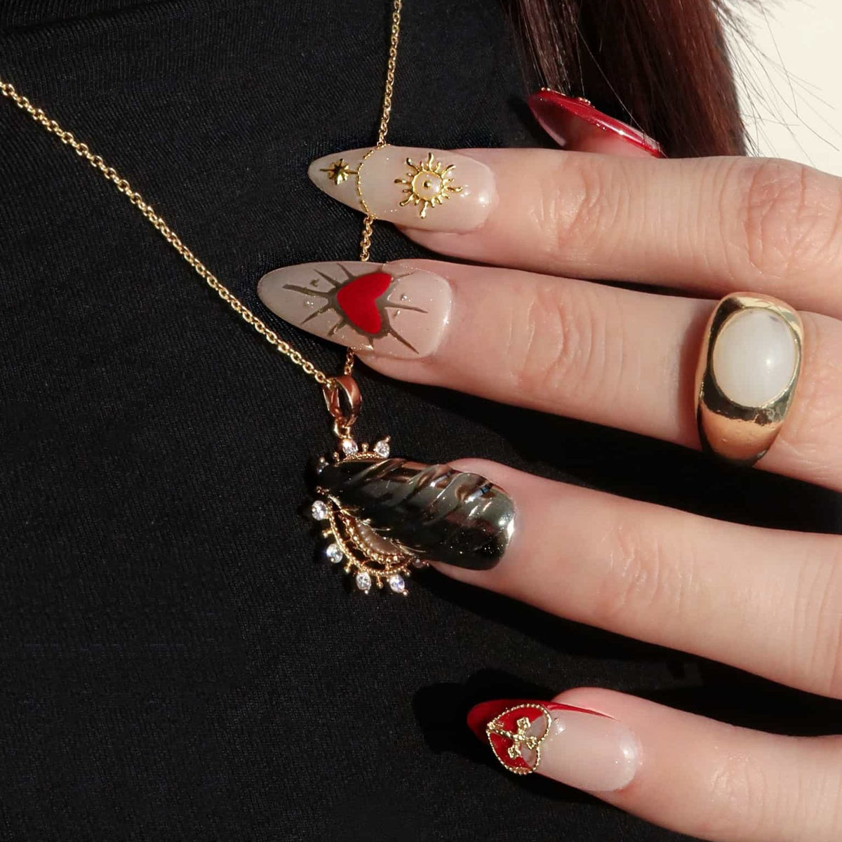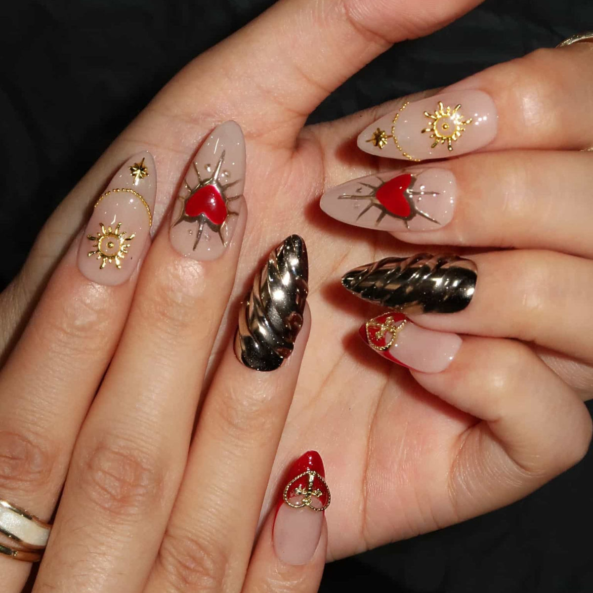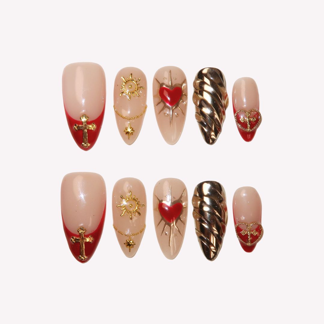Heart Spike artfully combines soft pink hues with marbled grays and rich golden embellishments. Each nail is a canvas featuring celestial motifs, including golden hearts and stars, creating a harmonious blend of elegance and playfulness. This set is perfect for adding a sophisticated yet charming edge to your style.