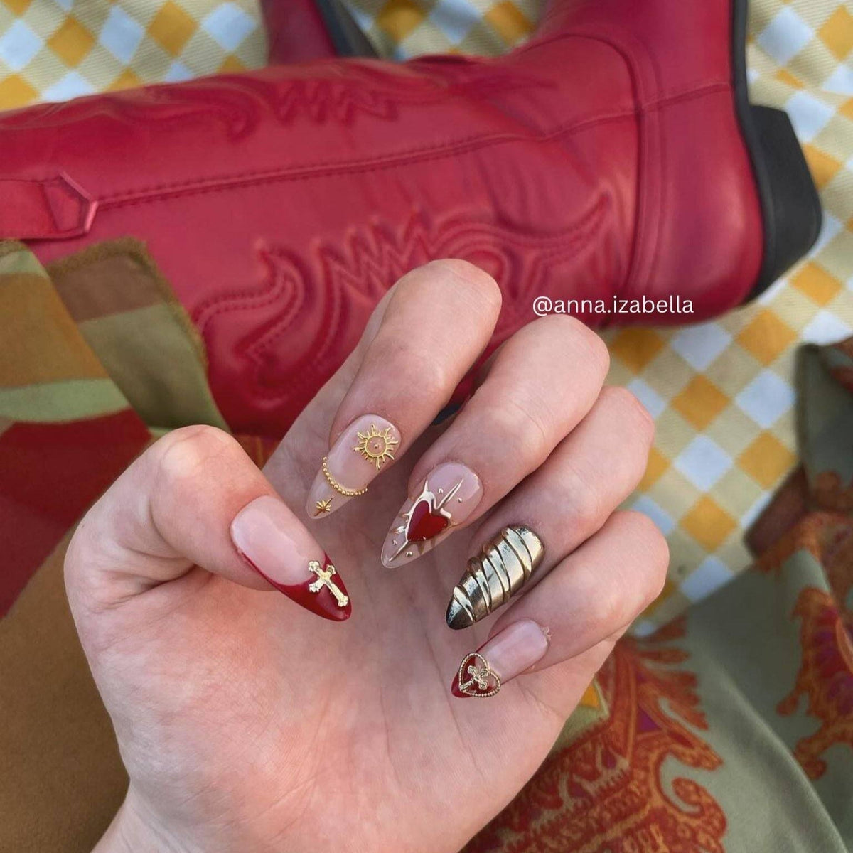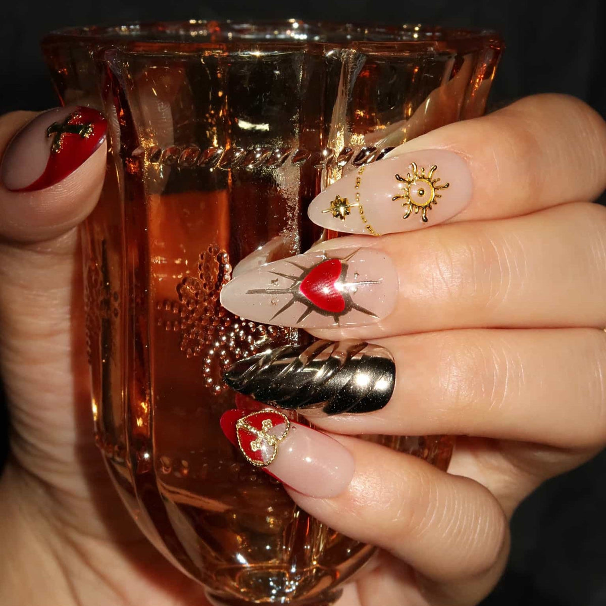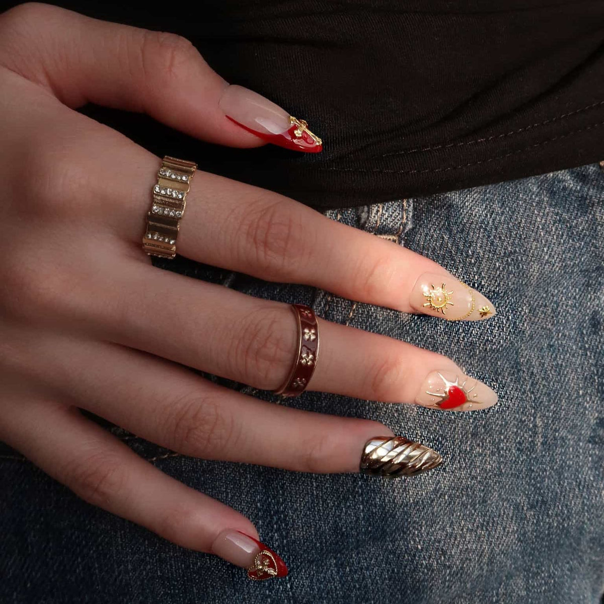 Heart Spike artfully combines soft pink hues with marbled grays and rich golden embellishments. Each nail is a canvas featuring celestial motifs, including golden hearts and stars, creating a harmonious blend of elegance and playfulness. This set is perfect for adding a sophisticated yet charming edge to your style.