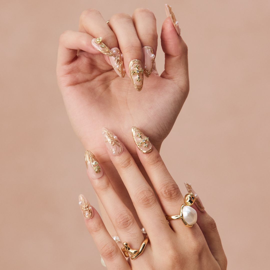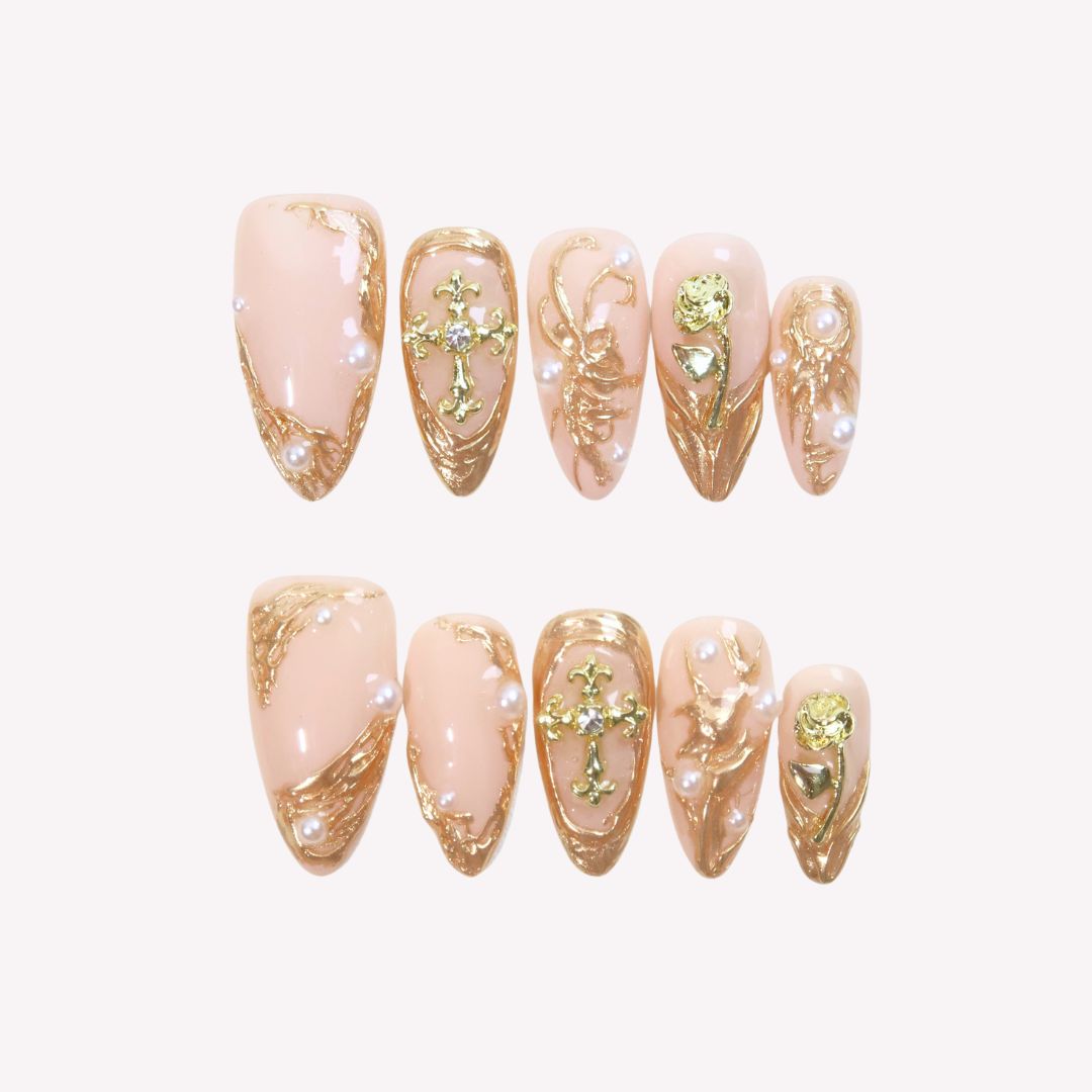 Discover the divine elegance of Holy Roses, a press-on nail set that combines grace and spirituality in a timeless design. The soft nude base is beautifully enhanced with irregular gold lines, adding a modern touch to its classic appeal. Golden crosses and intricate rose embellishments are scattered across the nails, symbolizing love, faith, and beauty. Delicate pearl accents further elevate the look, creating a luxurious, refined finish. Whether you're seeking a sophisticated, spiritual touch or simply want to add a bit of opulence to your look, Holy Roses is the perfect choice for any occasion.