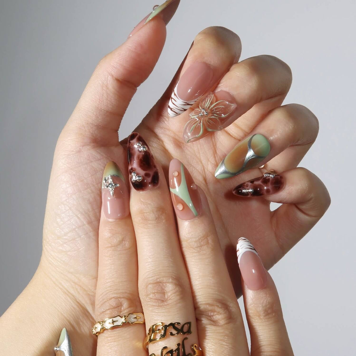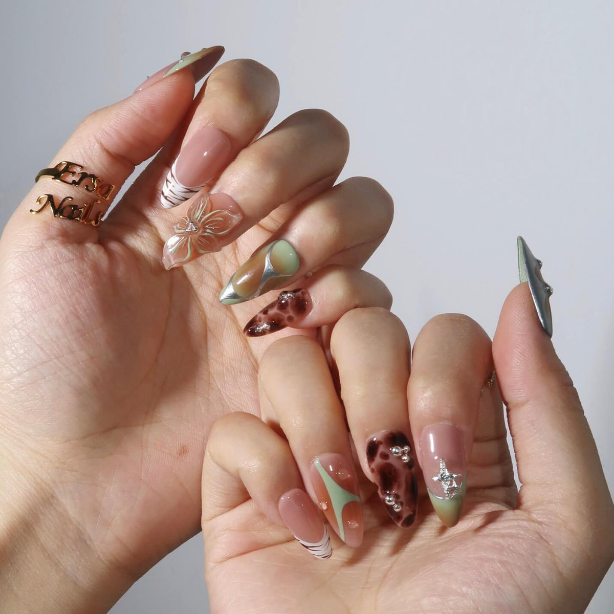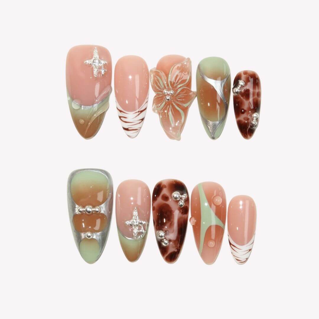 Embrace the cozy charm of Into the Warmth, a beautifully designed press-on nails set by Swara Nails. Featuring a soft nude base with rich green and brown hues, this design captures the essence of nature’s warmth. The ombre effect adds a subtle gradient, while delicate 3D floral embellishments bring a touch of elegance. To enhance the look, shimmering silver accents are scattered across, creating a perfect balance of nature and sophistication. Into the Warmth is the ideal set for anyone seeking a warm, earthy vibe with a dash of refinement.