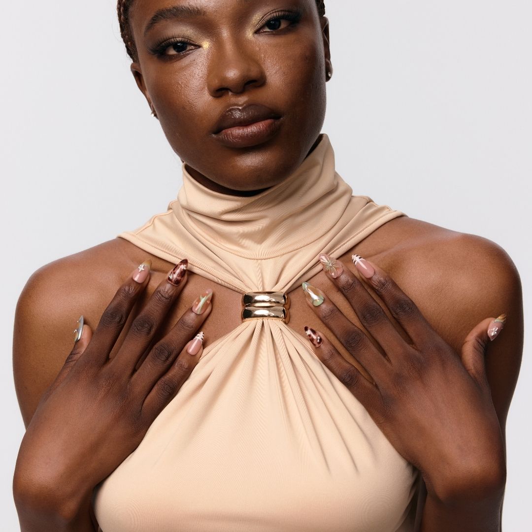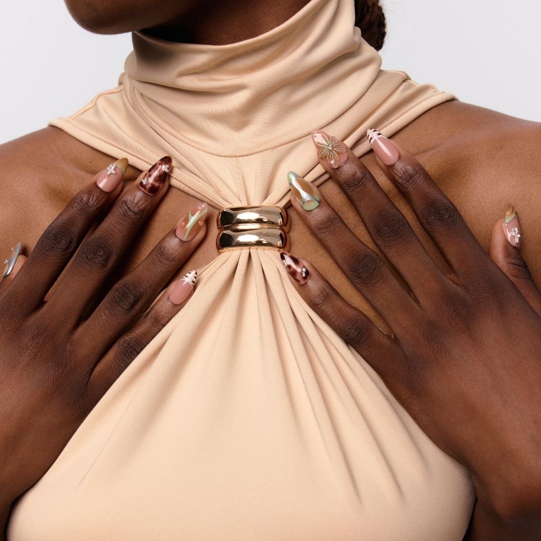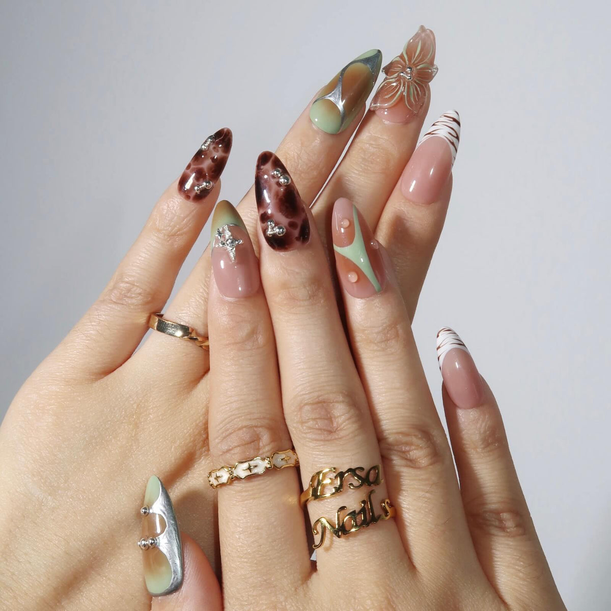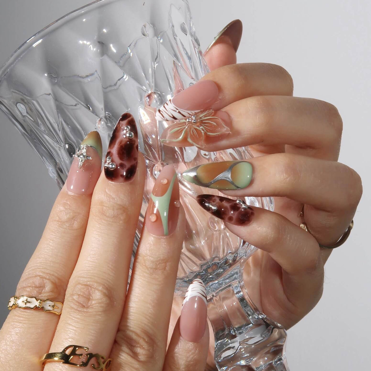 Embrace the cozy charm of Into the Warmth, a beautifully designed press-on nails set by Swara Nails. Featuring a soft nude base with rich green and brown hues, this design captures the essence of nature’s warmth. The ombre effect adds a subtle gradient, while delicate 3D floral embellishments bring a touch of elegance. To enhance the look, shimmering silver accents are scattered across, creating a perfect balance of nature and sophistication. Into the Warmth is the ideal set for anyone seeking a warm, earthy vibe with a dash of refinement.