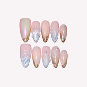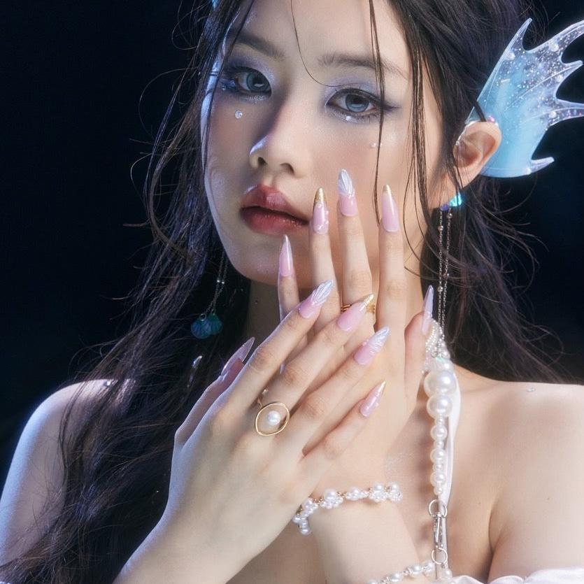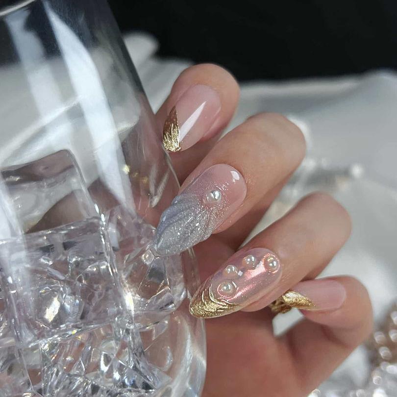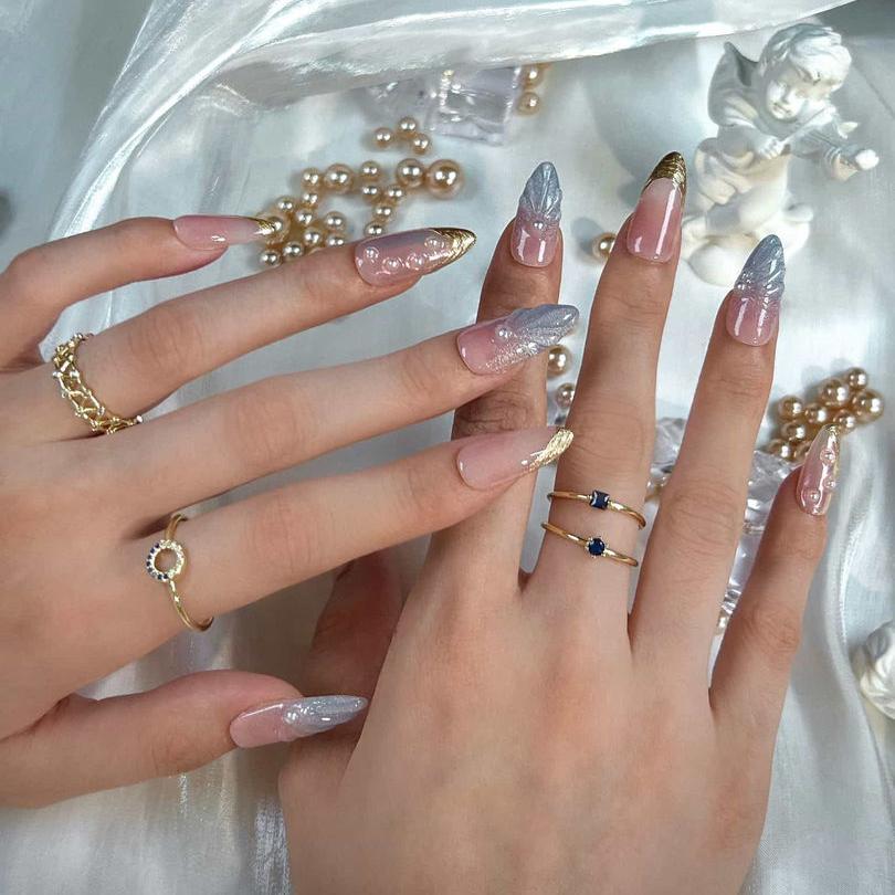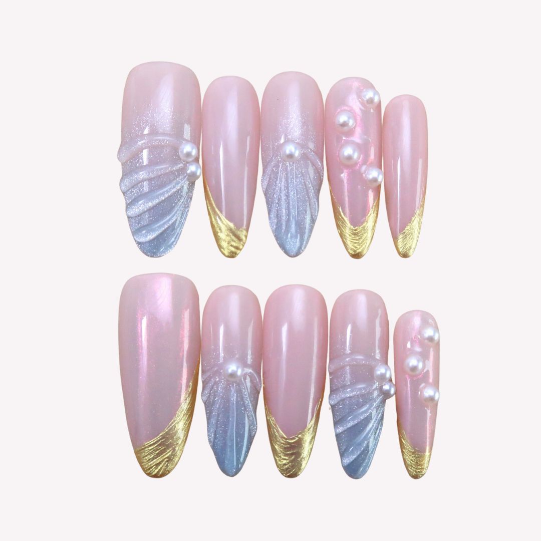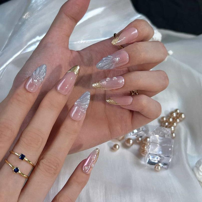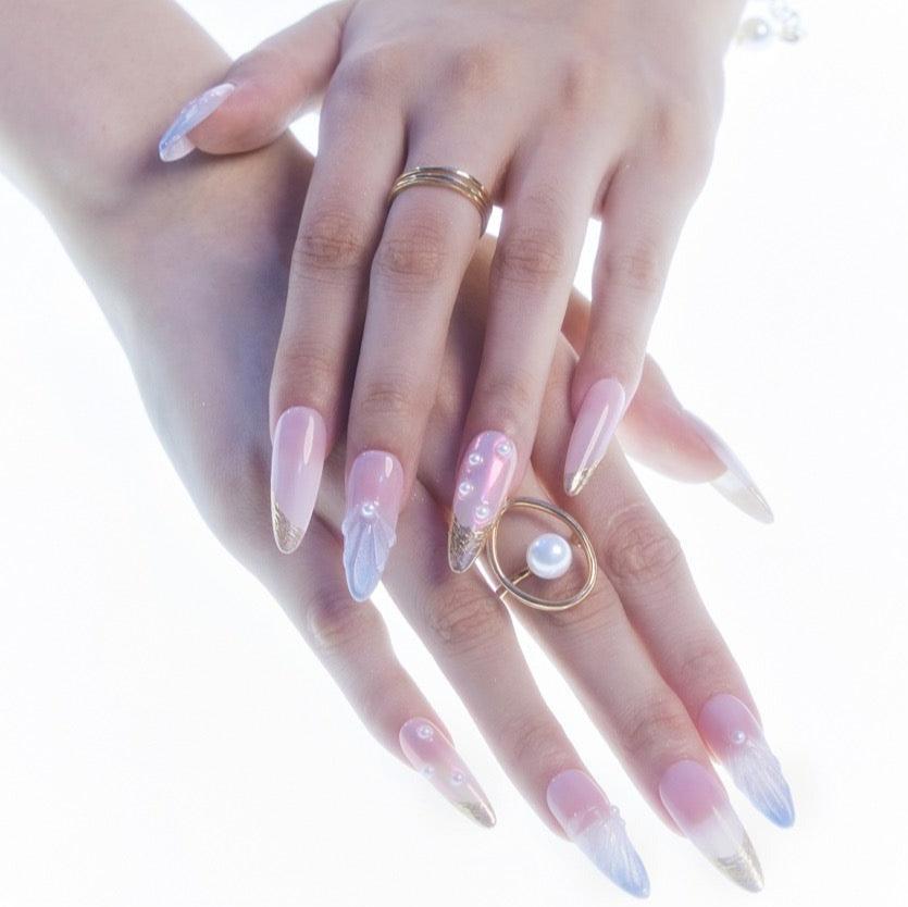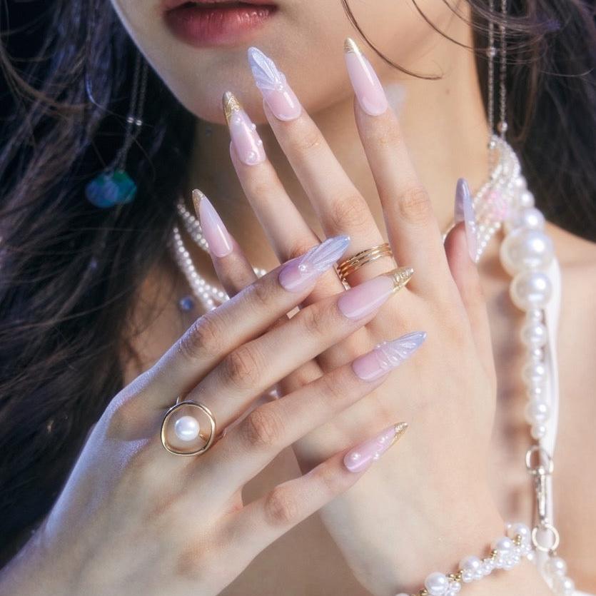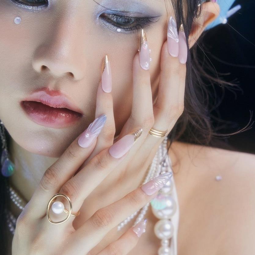 NAIL SHAPE: Long Almond APPROX. LENGTH: 26MM Enjoy the breeze of ethereal elegance with our Lazuli Feather press on nails set. Each nail boasts a subtle blend of rosy hues and gentle iridescence, beautifully juxtaposed with shimmering feather motifs and strategically placed pearls. These designs, while dainty, speak volumes about grace, nature's splendor, and a quiet resilience. Just as a feather is carried by the wind, let these nails guide you with style and poise. Embrace this nail set, a testament to Ersa's commitment to delicate artistry and transformative tales of beauty.