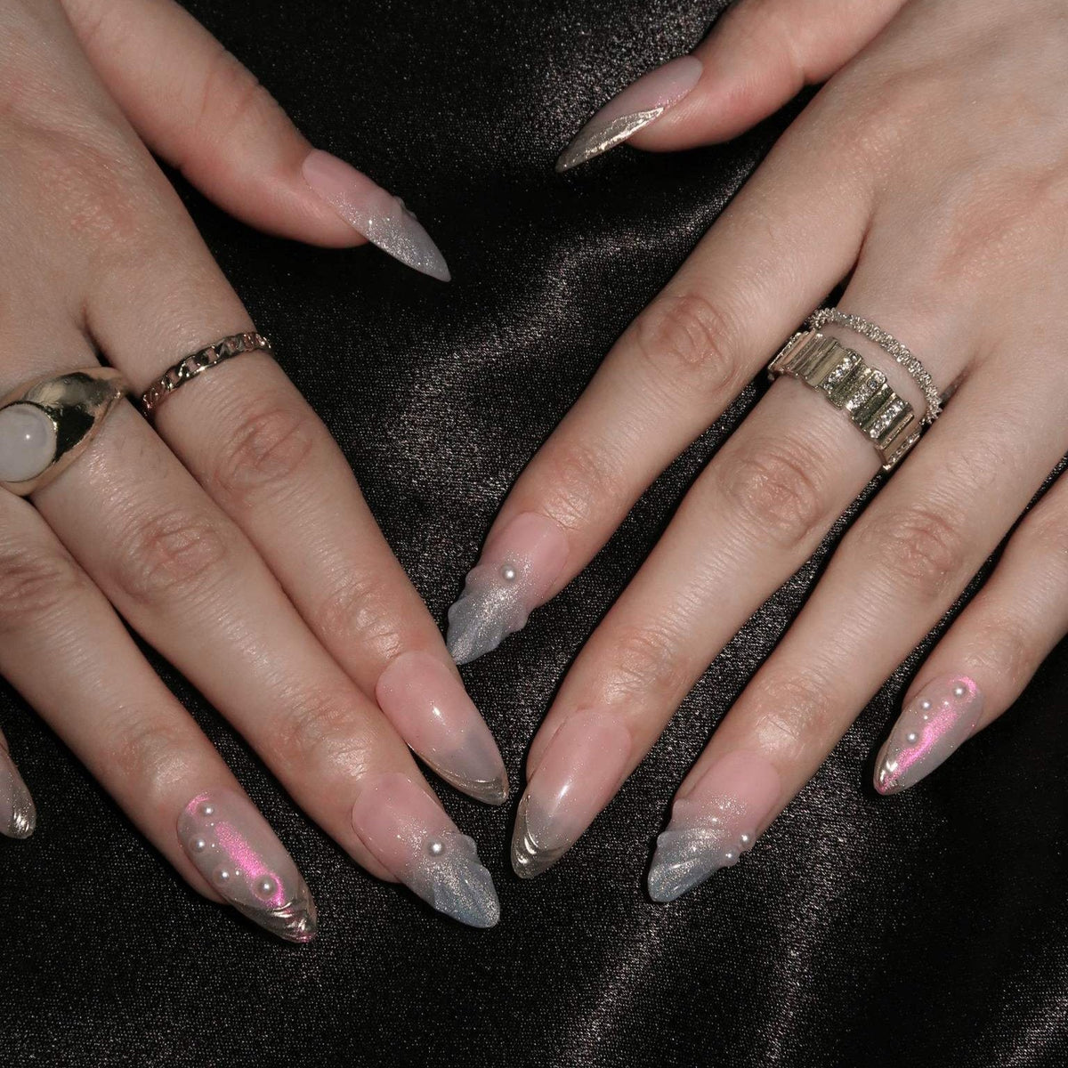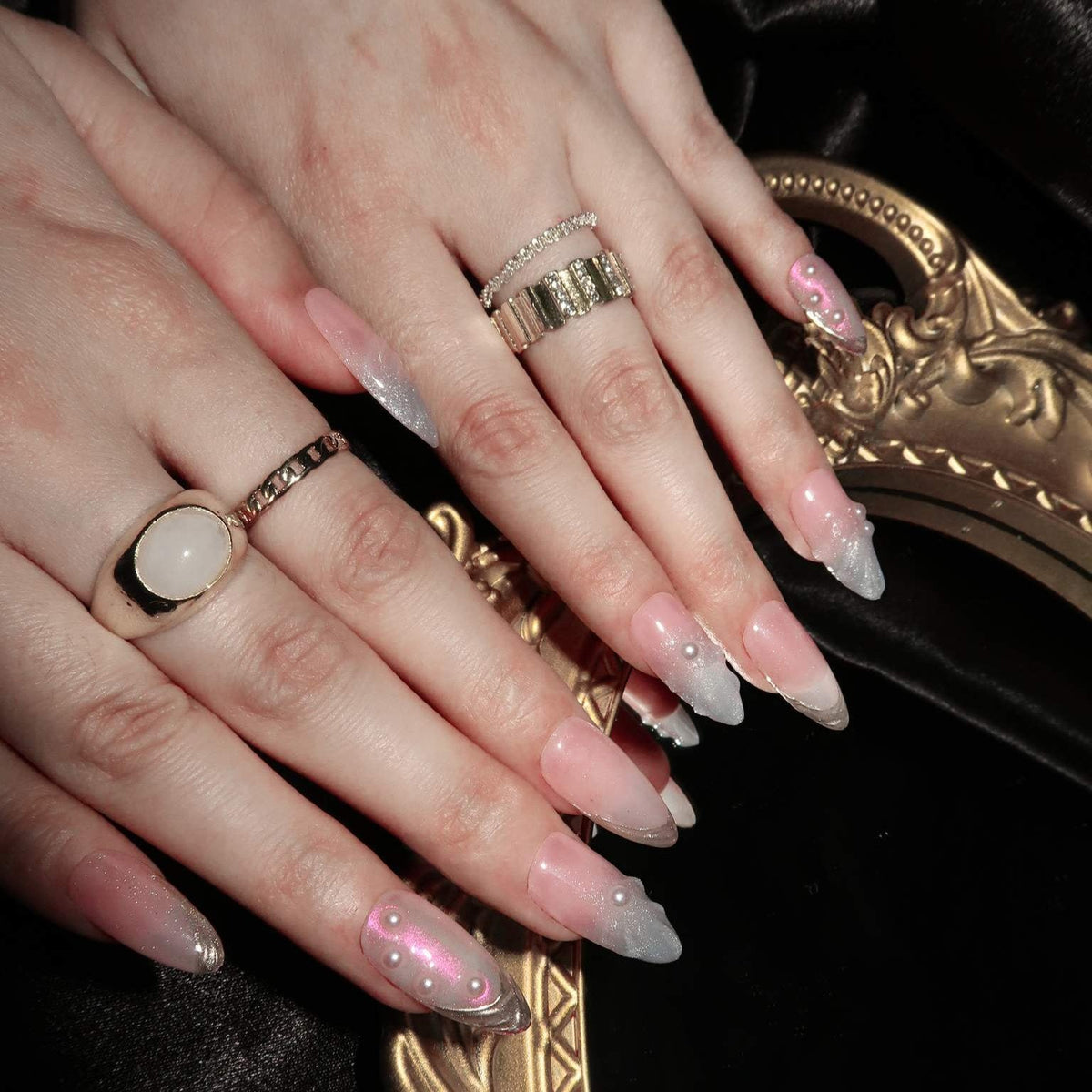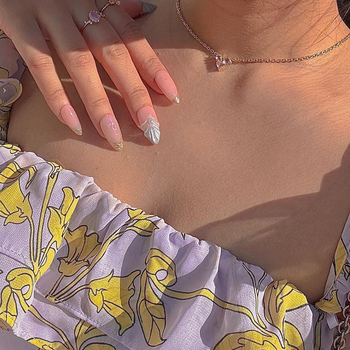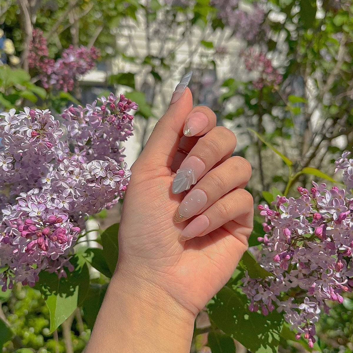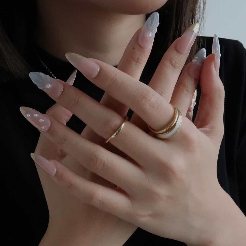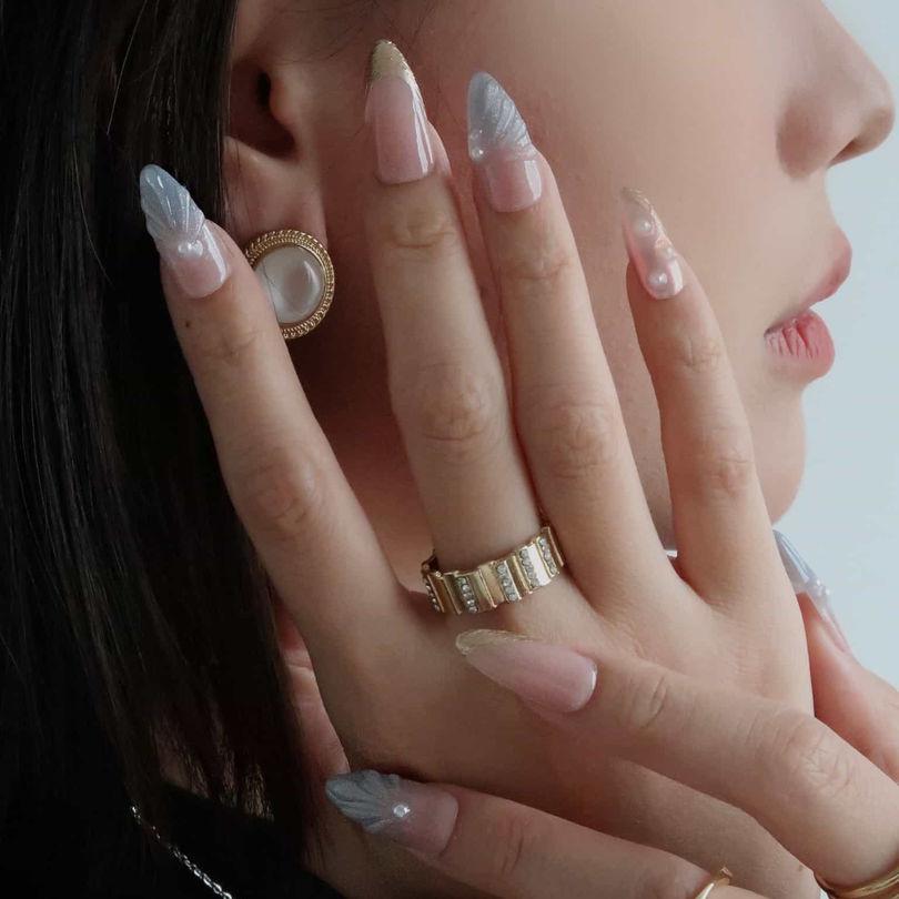 NAIL SHAPE: Long Almond APPROX. LENGTH: 26MM Enjoy the breeze of ethereal elegance with our Lazuli Feather press on nails set. Each nail boasts a subtle blend of rosy hues and gentle iridescence, beautifully juxtaposed with shimmering feather motifs and strategically placed pearls. These designs, while dainty, speak volumes about grace, nature's splendor, and a quiet resilience. Just as a feather is carried by the wind, let these nails guide you with style and poise. Embrace this nail set, a testament to Ersa's commitment to delicate artistry and transformative tales of beauty.
