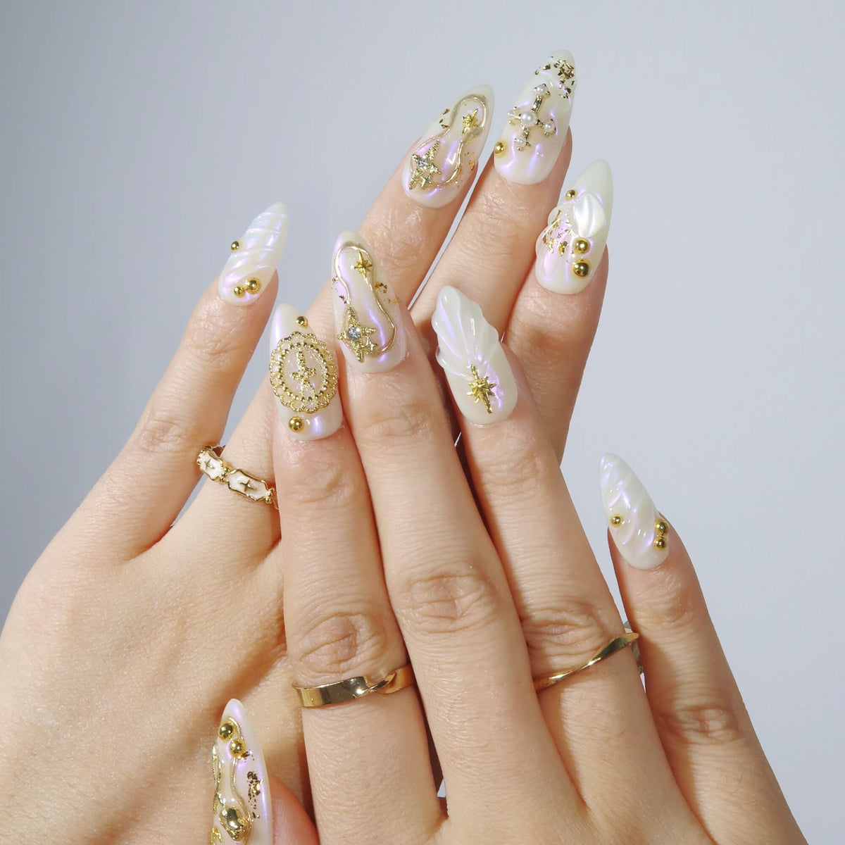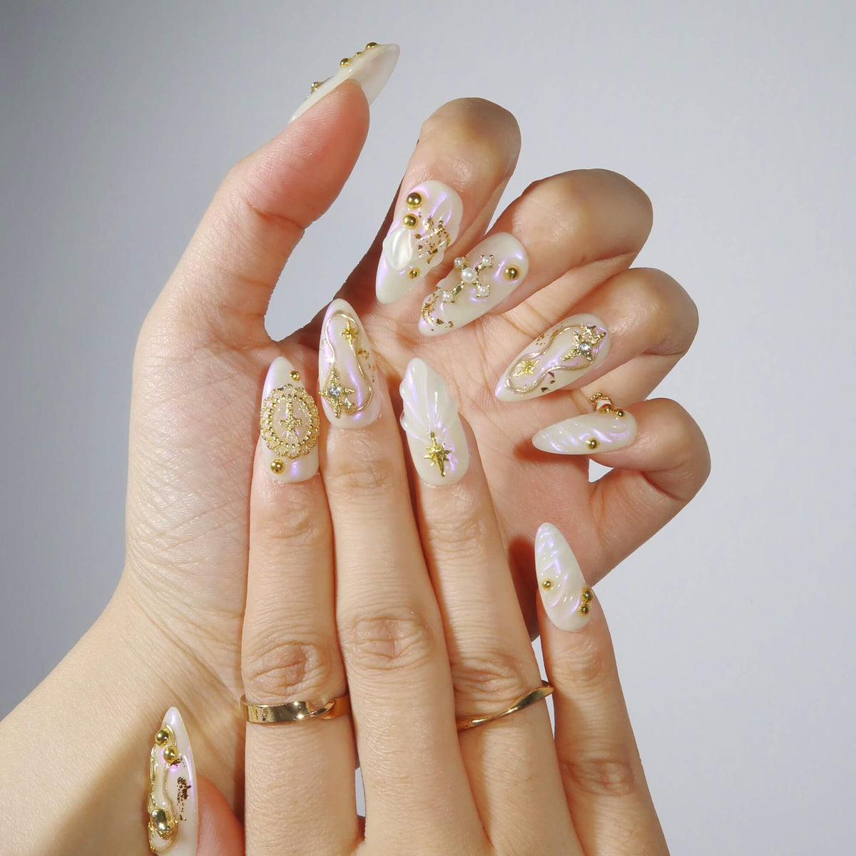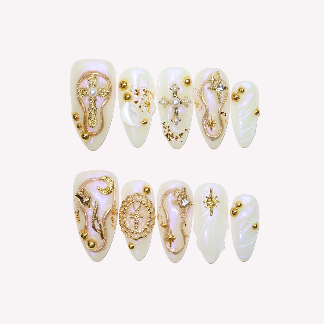 Embrace the ethereal beauty of Lunar Devotion, where a moonlit white base shimmers with subtle pink undertones for a celestial glow. Adorned with intricate gold embellishments, including roses, crosses, and stars, this design exudes grace and divine elegance. Perfect for those who seek a touch of heavenly charm in their nail art.