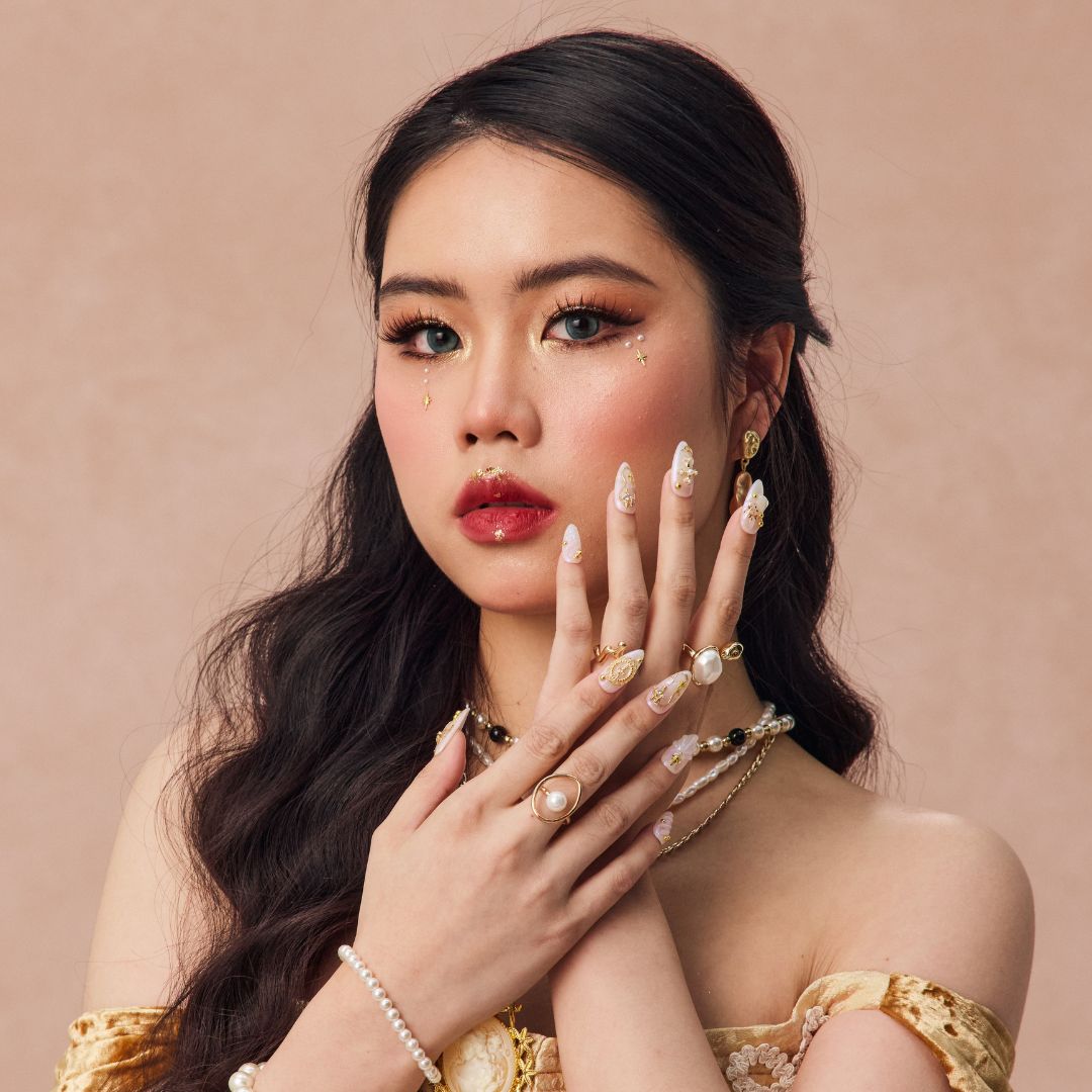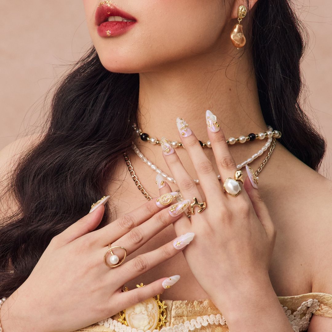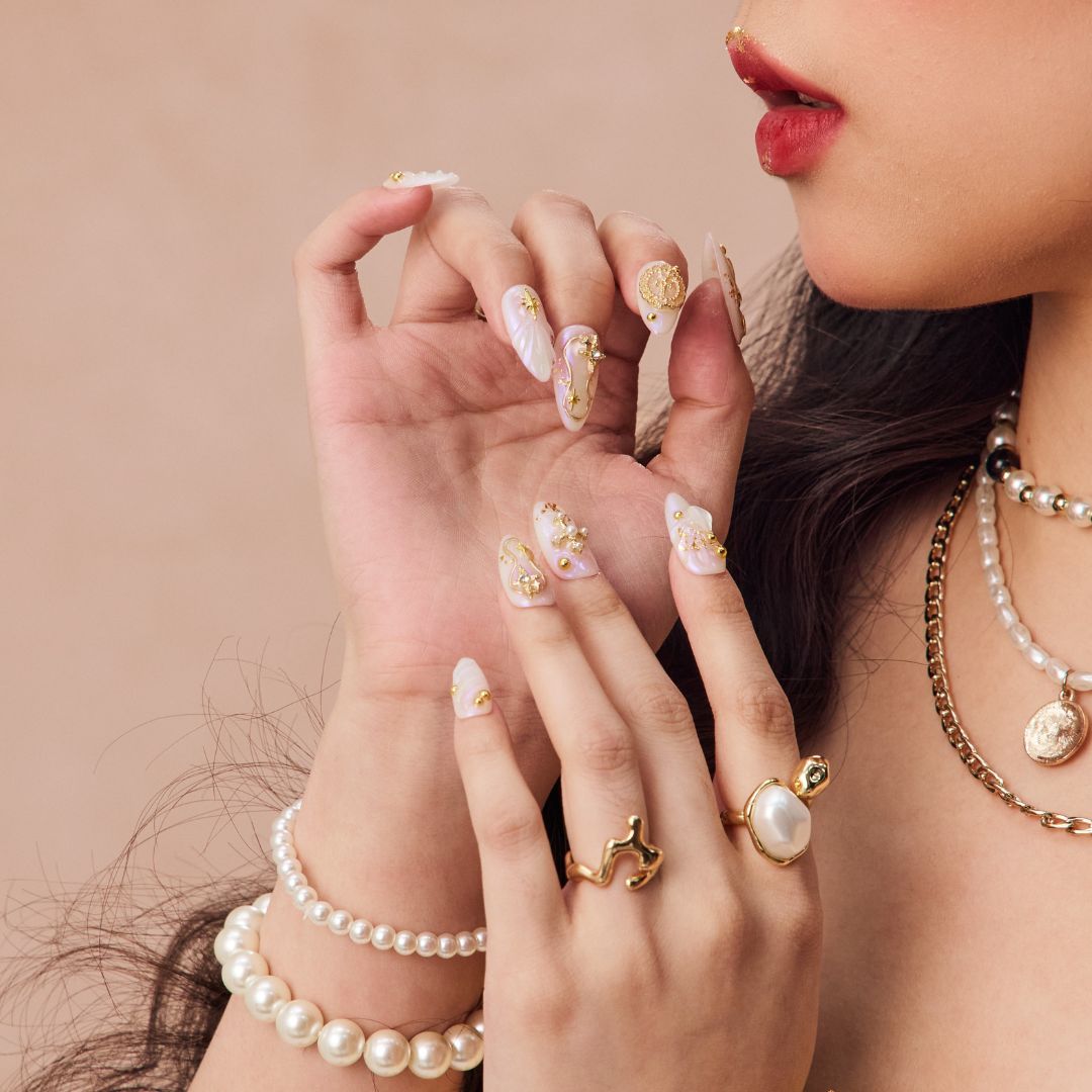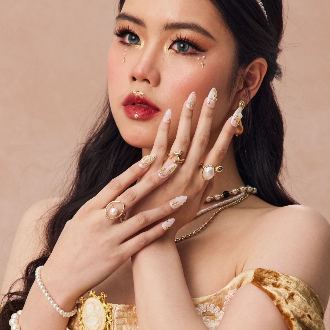Embrace the ethereal beauty of Lunar Devotion, where a moonlit white base shimmers with subtle pink undertones for a celestial glow. Adorned with intricate gold embellishments, including roses, crosses, and stars, this design exudes grace and divine elegance. Perfect for those who seek a touch of heavenly charm in their nail art.