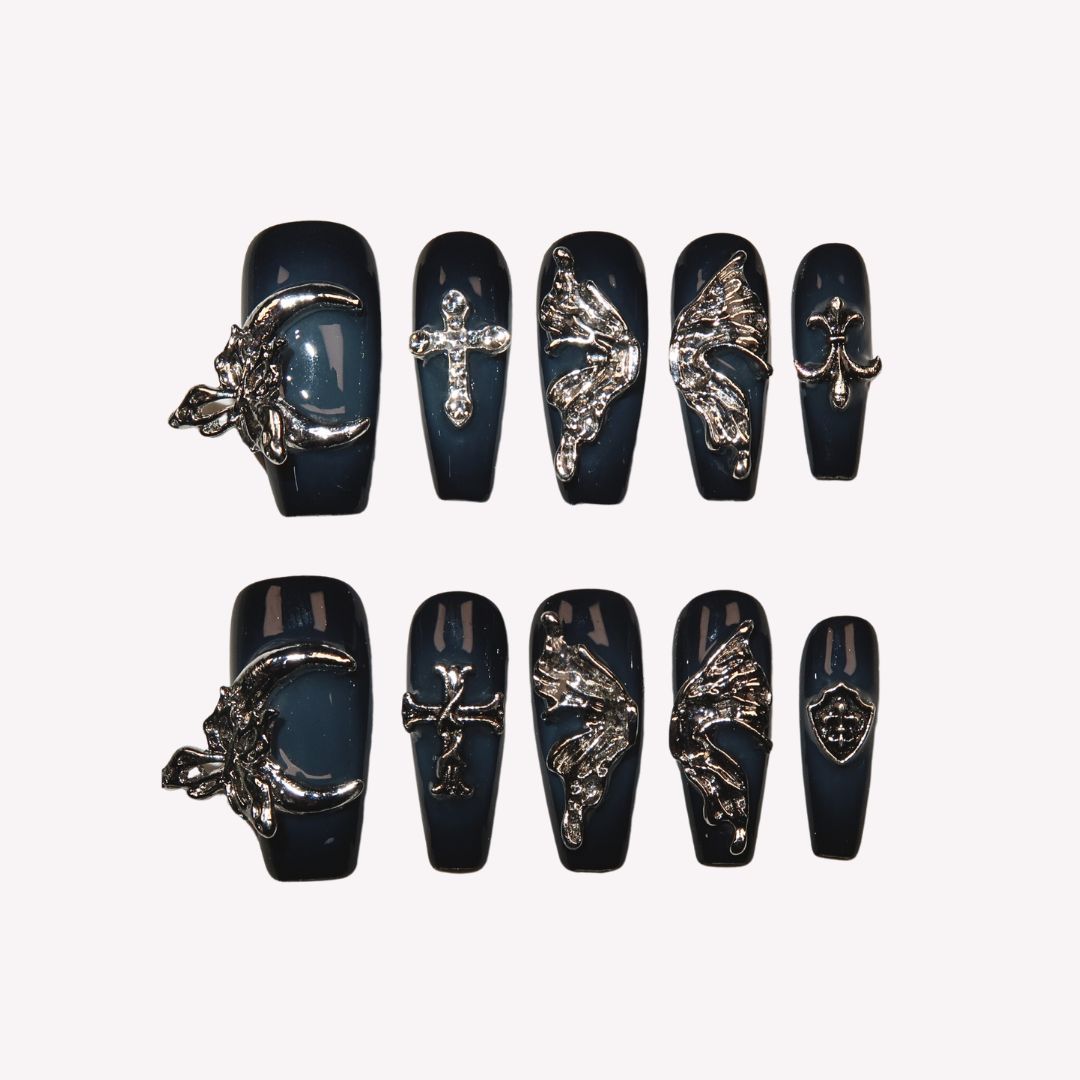 NAIL SHAPE: Medium Coffin APPROX. LENGTH: 22MM Unveiling Lunar Fantasies, a reflection of ethereal dreams and serene nights. Set against a deep midnight hue, each nail showcases an intricate emblem - from the crescent moon's tender curve,to the delicate wings of a butterfly. This nail set is a testament to life's profound symbols, each carrying its own tale and mystique. Crafted with meticulous attention to detail, the set mirrors Ersa's commitment to narrating stories through exquisite artistry. With Lunar Elegance, you don't just wear nails; you adorn yourself with tales as ancient as time.