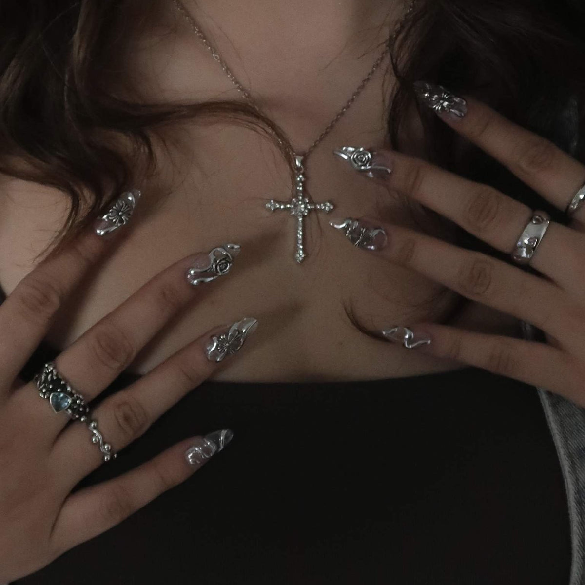 Swara Nails presents the Argentum Mystique set, a captivating ensemble of press-on nails that embody the sleek and enigmatic allure of silver. Each nail is a canvas showcasing an array of intricate designs, from serpentine twists to celestial patterns, all gleaming with a metallic sheen that mimics the mysterious moonlit night. The reflective surface is not just a style statement but a mirror to the soul, inviting onlookers to a world of wonder and elegance. Perfect for those who wish to make a bold statement, the Argentum Mystique set is a testament to the fusion of art and fashion on the tips of your fingers. Whether it's a gala or a night out with friends, these nails promise to infuse your look with an air of sophistication and a touch of mystic charm.