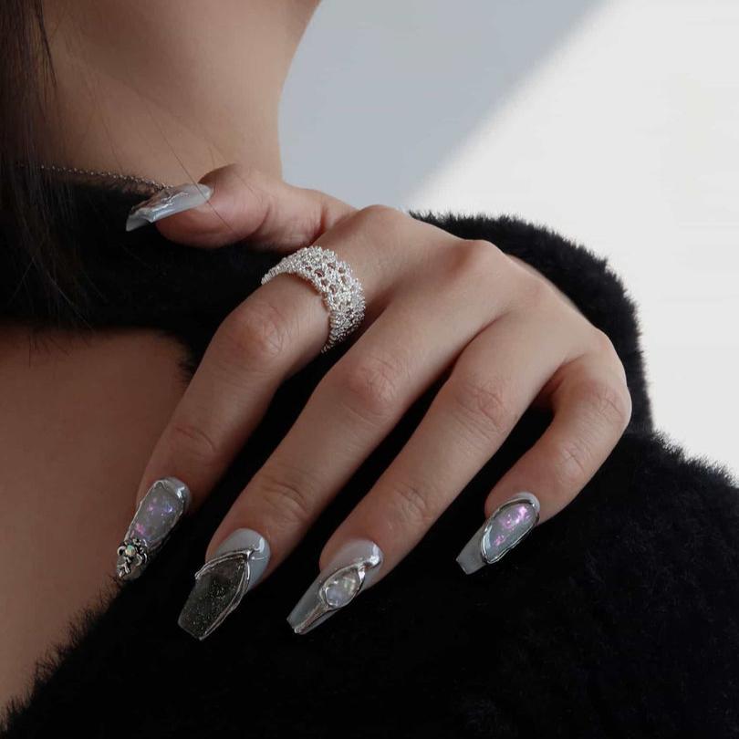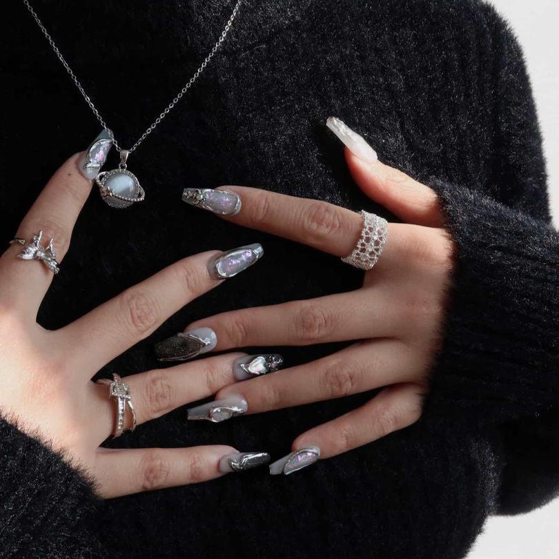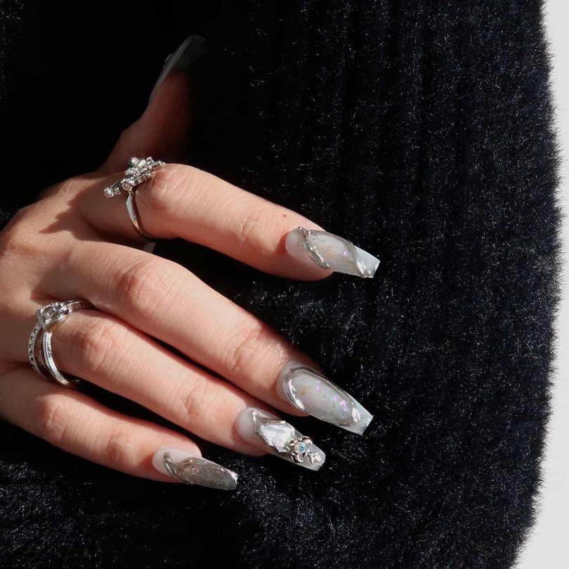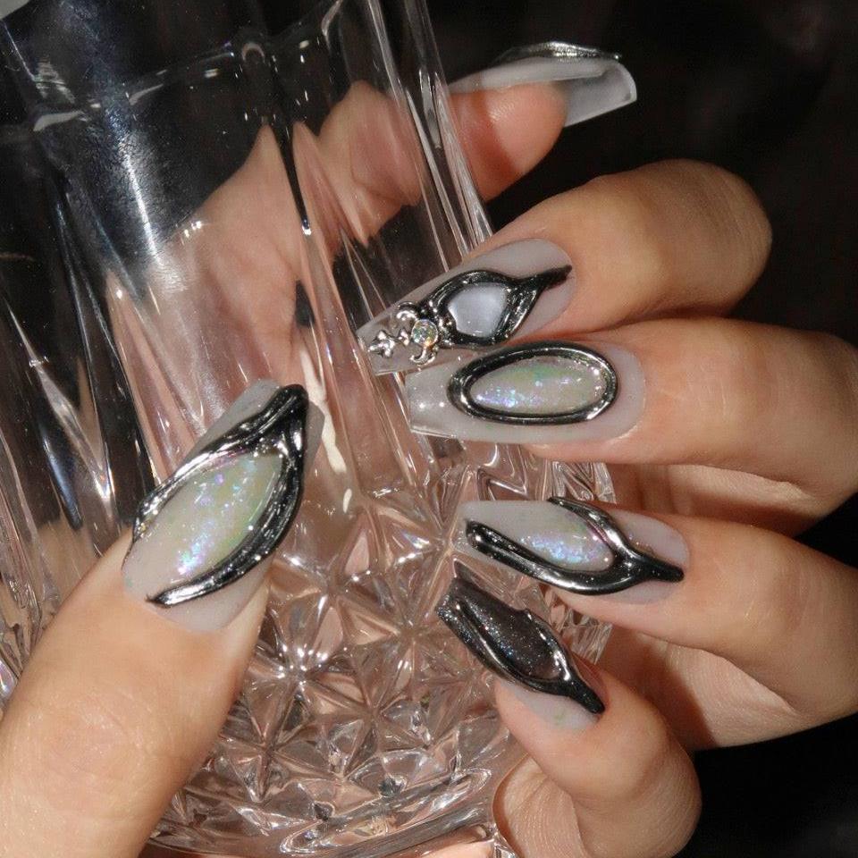 NAIL SHAPE: Medium Coffin APPROX. LENGTH: 22MM Unveiling the magic of intricate craftsmanship, our Metallic Mirage press on nails set portrays the beauty of irregularly shaped metallic embellishments, reminiscent of abstract art. Reflecting our brand's dedication to advanced customization, every nail carries a unique aesthetic, shimmering in its own splendid way. These press on nails are a testament to our brand's story - one that champions creativity, precision, and the timeless charm of hand-painted elegance.
