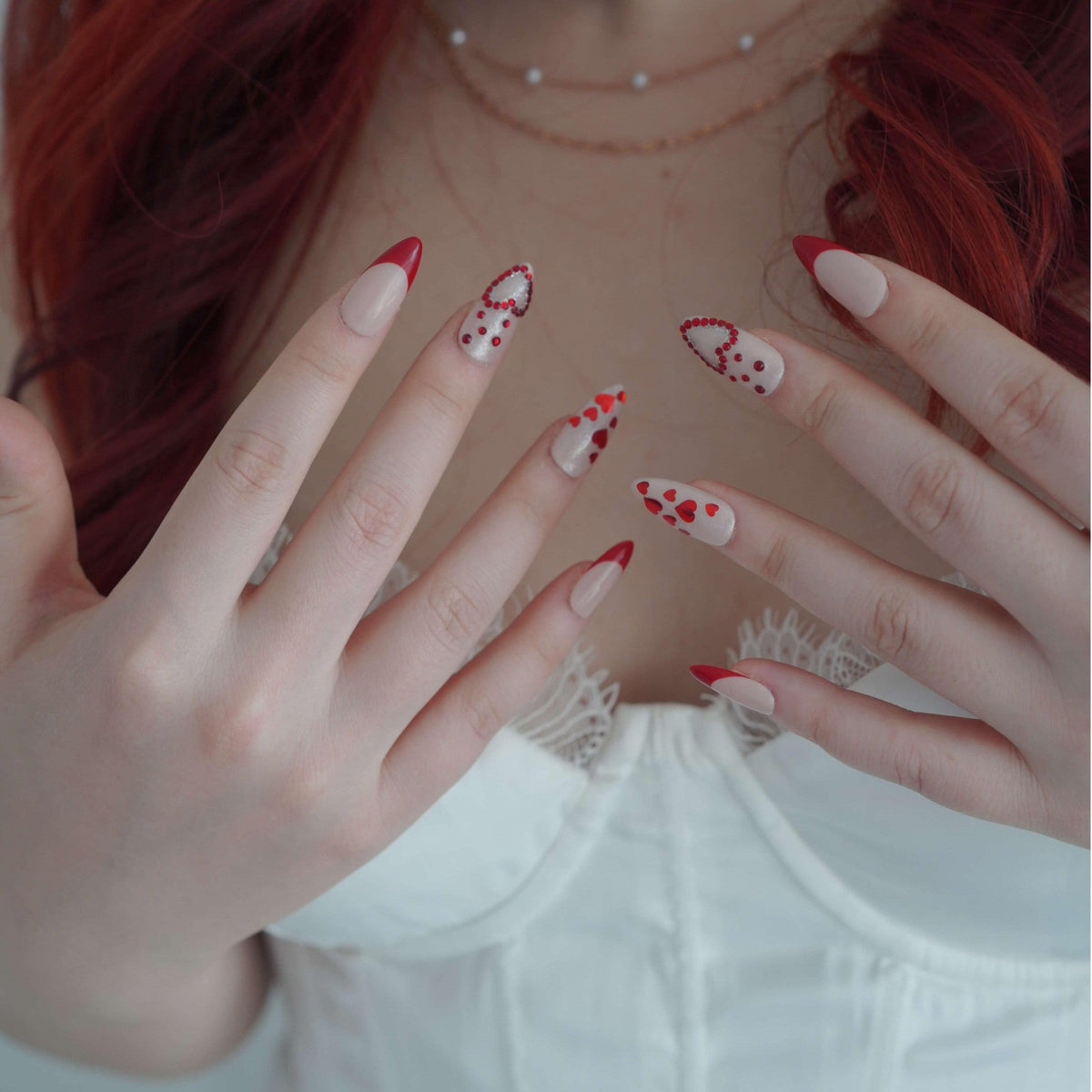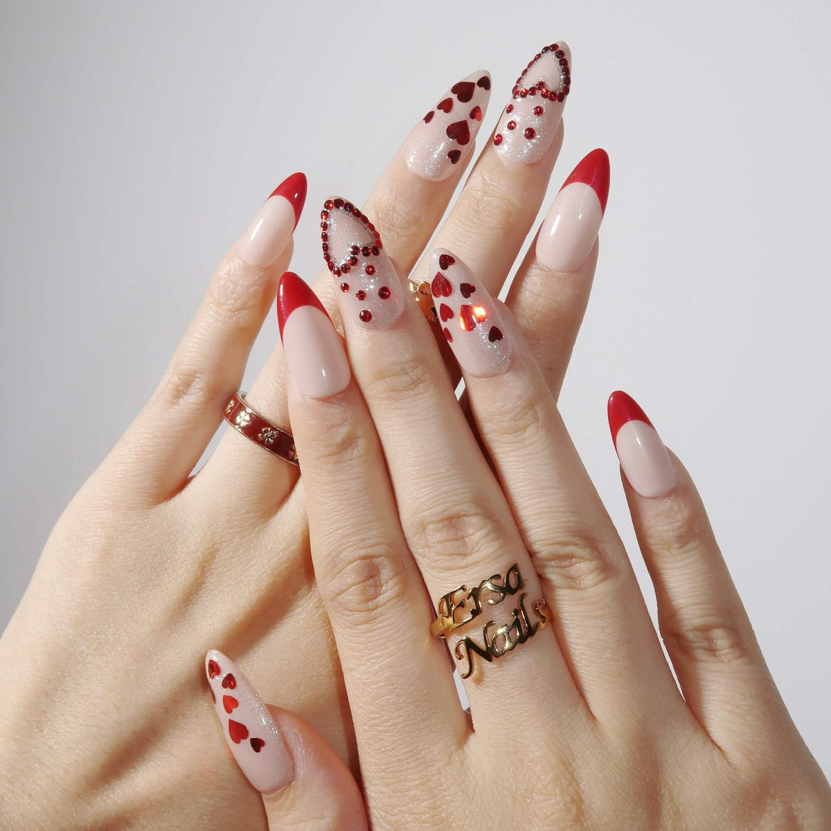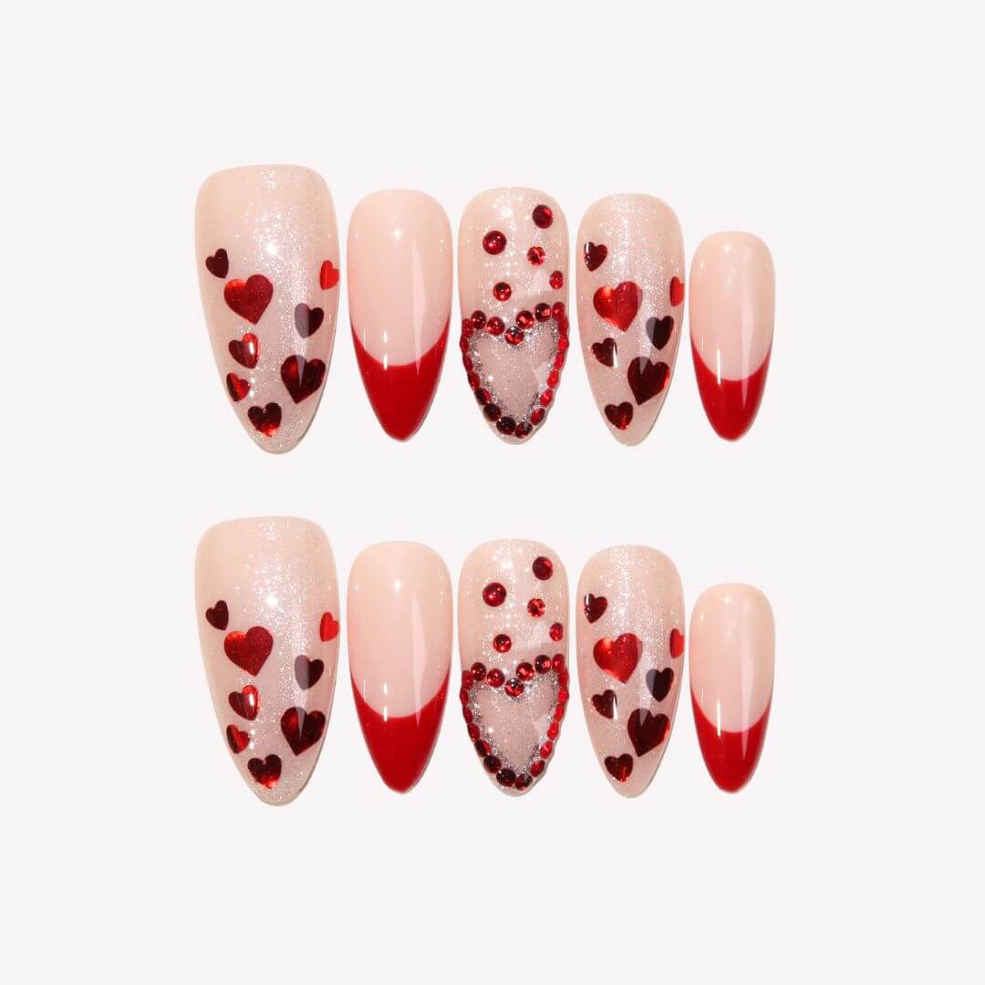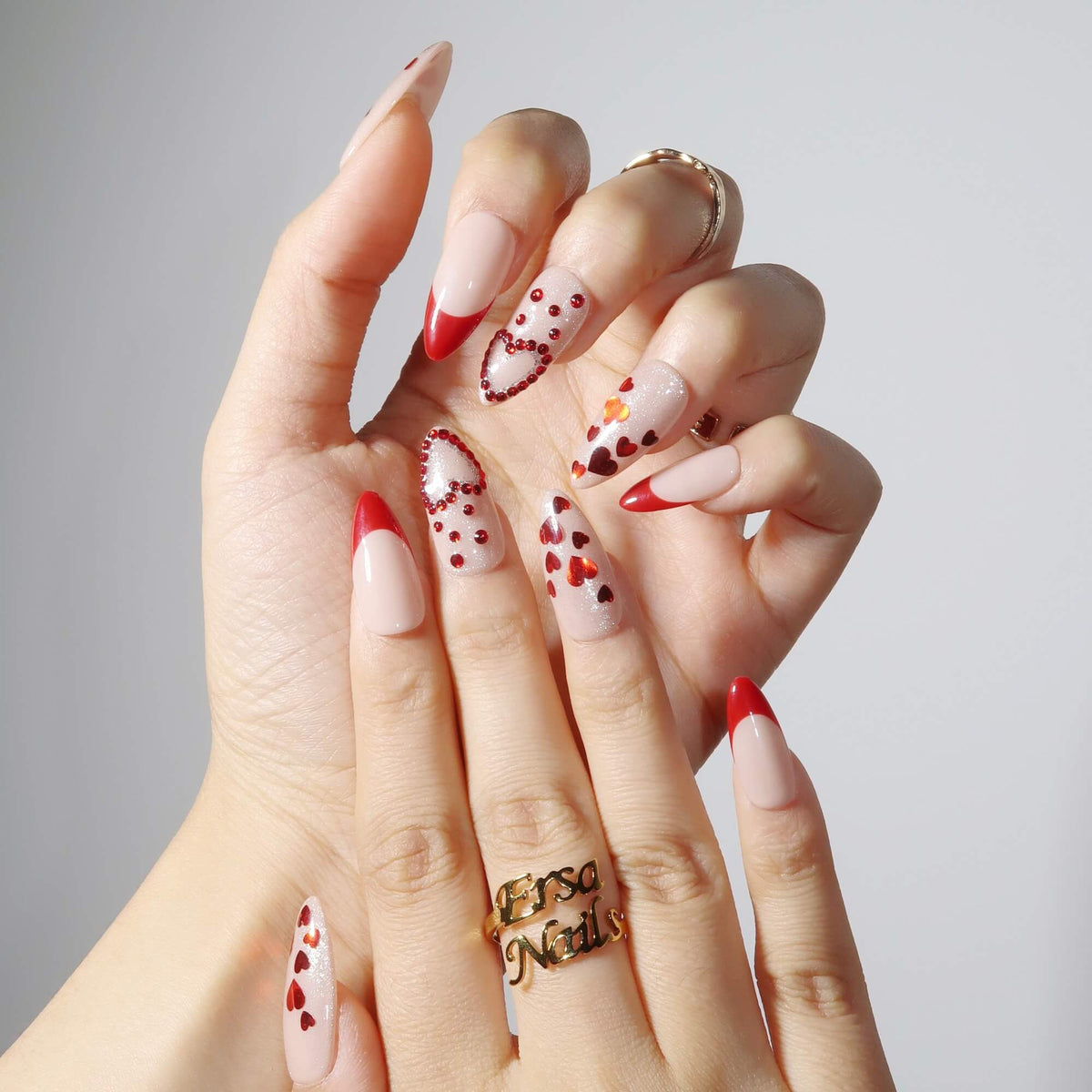 Spread Much Love this Valentine’s Day with HultyNail' press-on nails. With a nude base and classic French tips, these nails are adorned with an array of red heart designs, making them the perfect choice for your Valentine’s celebration. Silver glitter and red gemstone accents add a touch of sparkle, elevating the look with extra shine. Celebrate love in all its forms with these charming nails that capture the spirit of romance and affection. Let your nails radiate love this Valentine’s Day.