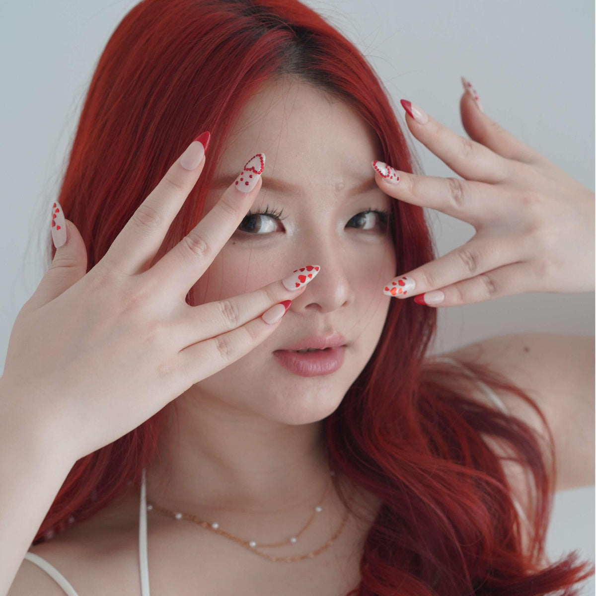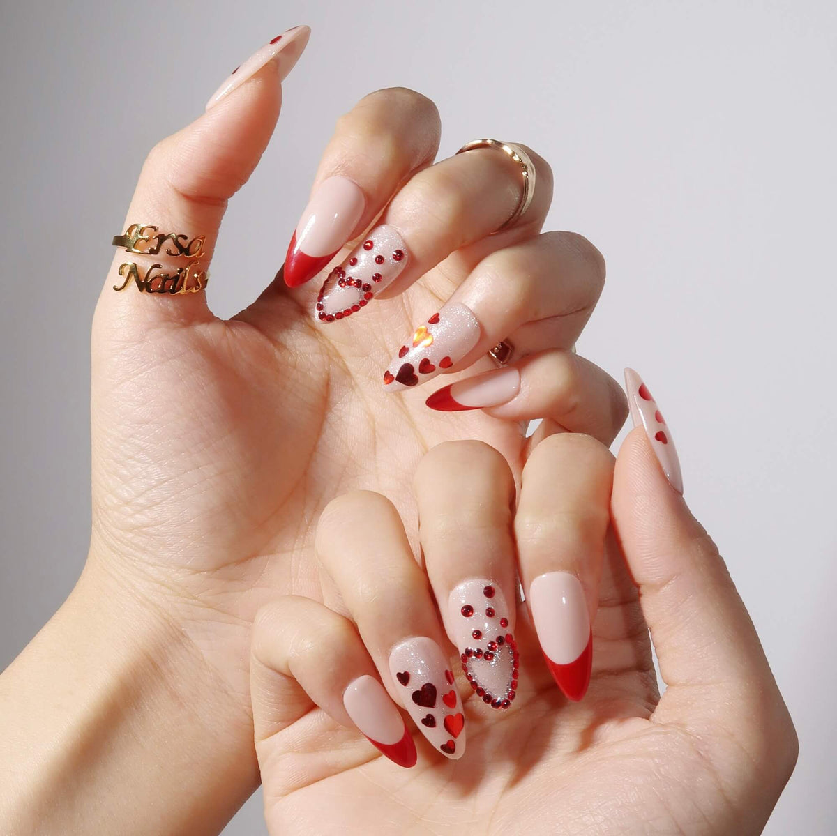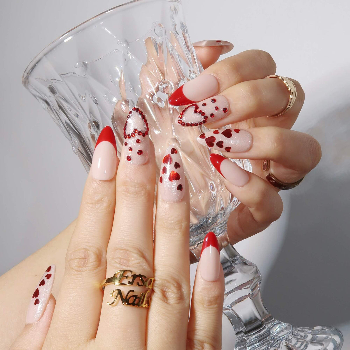 Spread Much Love this Valentine’s Day with HultyNail' press-on nails. With a nude base and classic French tips, these nails are adorned with an array of red heart designs, making them the perfect choice for your Valentine’s celebration. Silver glitter and red gemstone accents add a touch of sparkle, elevating the look with extra shine. Celebrate love in all its forms with these charming nails that capture the spirit of romance and affection. Let your nails radiate love this Valentine’s Day.